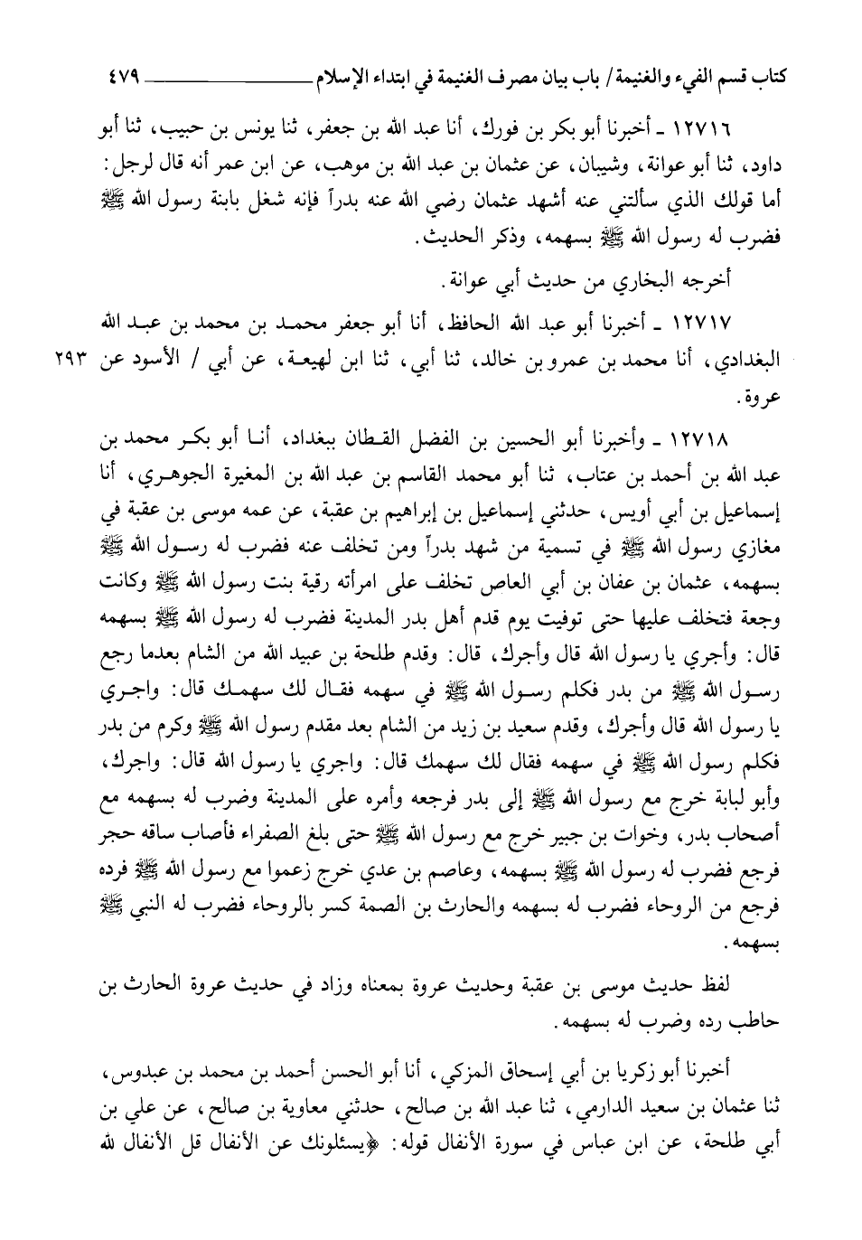 12718 - وَأَخْبَرَنَا أَبُو الْحُسَيْنِ بْنُ الْفَضْلِ الْقَطَّانُ بِبَغْدَادَ، أنا أَبُو بَكْرٍ مُحَمَّدُ بْنُ عَبْدِ اللهِ بْنِ أَحْمَدَ بْنِ عَتَّابٍ، ثنا أَبُو مُحَمَّدٍ الْقَاسِمُ بْنُ عَبْدِ اللهِ بْنِ الْمُغِيرَةِ الْجَوْهَرِيُّ , أنا إِسْمَاعِيلُ بْنُ أَبِي أُوَيْسٍ , حَدَّثَنِي إِسْمَاعِيلُ بْنُ إِبْرَاهِيمَ بْنِ عُقْبَةَ , عَنْ عَمِّهِ مُوسَى بْنُ عُقْبَةَ فِي مَغَازِي رَسُولِ اللهِ صَلَّى اللهُ عَلَيْهِ وَسَلَّمَ فِي تَسْمِيَةِ مَنْ شَهِدَ بَدْرًا، وَمَنْ تَخَلَّفَ عَنْهُ فَضَرَبَ لَهُ رَسُولُ اللهِ صَلَّى اللهُ عَلَيْهِ وَسَلَّمَ بِسَهْمِهِ: عُثْمَانُ بْنُ عَفَّانَ بْنِ أَبِي الْعَاصِ تَخَلَّفَ عَلَى امْرَأَتِهِ رُقَيَّةَ بِنْتِ رَسُولِ اللهِ صَلَّى اللهُ عَلَيْهِ وَسَلَّمَ، وَكَانَتْ وَجِعَةً، فَتَخَلَّفَ عَلَيْهَا حَتَّى تُوُفِّيَتْ يَوْمَ قَدِمَ أَهْلُ بَدْرٍ الْمَدِينَةَ، فَضَرَبَ لَهُ رَسُولُ اللهِ صَلَّى اللهُ عَلَيْهِ وَسَلَّمَ بِسَهْمِهِ، قَالَ: وَأَجْرِي يَا رَسُولَ اللهِ؟ قَالَ: " §وَأَجْرُكَ "، قَالَ: وَقَدِمَ طَلْحَةُ بْنُ عُبَيْدِ اللهِ مِنَ الشَّامَ بَعْدَمَا رَجَعَ رَسُولُ اللهِ صَلَّى اللهُ عَلَيْهِ وَسَلَّمَ مِنْ بَدْرٍ، فَكَلَّمَ رَسُولَ اللهِ صَلَّى اللهُ عَلَيْهِ وَسَلَّمَ فِي سَهْمِهِ، فَقَالَ: " لَكَ سَهْمُكَ "، قَالَ: وَأَجْرِي يَا رَسُولَ اللهِ؟ قَالَ: " وَأَجْرُكَ "، وَقَدِمَ سَعِيدُ بْنُ زَيْدٍ مِنَ الشَّامِ بَعْدَ مَقْدِمِ رَسُولِ اللهِ صَلَّى اللهُ عَلَيْهِ وَسَلَّمَ مِنْ بَدْرٍ، فَكَلَّمَ رَسُولَ اللهِ صَلَّى اللهُ عَلَيْهِ وَسَلَّمَ فِي سَهْمِهِ، فَقَالَ: " لَكَ سَهْمُكَ "، قَالَ: وَأَجْرِي يَا رَسُولَ اللهِ؟ قَالَ: " وَأَجْرُكَ " وَأَبُو لُبَابَةَ خَرَجَ مَعَ رَسُولِ اللهِ صَلَّى اللهُ عَلَيْهِ وَسَلَّمَ إِلَى بَدْرٍ فَرَجَّعَهُ وَأَمَّرَهُ عَلَى الْمَدِينَةِ وَضَرَبَ لَهُ بِسَهْمِهِ مَعَ أَصْحَابِ بَدْرٍ، وَخَوَّاتُ بْنُ جُبَيْرٍ خَرَجَ مَعَ رَسُولِ اللهِ صَلَّى اللهُ عَلَيْهِ وَسَلَّمَ حَتَّى بَلَغَ الصَّفْرَاءَ فَأَصَابَ سَاقَهُ حَجَرٌ، فَرَجَعَ، فَضَرَبَ لَهُ رَسُولُ اللهِ صَلَّى اللهُ عَلَيْهِ وَسَلَّمَ بِسَهْمِهِ، وَعَاصِمُ بْنُ عَدِيٍّ خَرَجَ زَعَمُوا مَعَ رَسُولِ اللهِ صَلَّى اللهُ عَلَيْهِ وَسَلَّمَ , فَرَدَّهُ فَرَجَعَ مِنَ الرَّوْحَاءِ، فَضَرَبَ لَهُ بِسَهْمِهِ، وَالْحَارِثُ بْنُ الصِّمَّةِ كُسِرَ بِالرَّوْحَاءِ فَضَرَبَ لَهُ النَّبِيُّ صَلَّى اللهُ عَلَيْهِ وَسَلَّمَ بِسَهْمِهِ لَفْظُ حَدِيثِ مُوسَى بْنِ عُقْبَةَ، وَحَدِيثُ عُرْوَةَ بِمَعْنَاهُ، وَزَادَ فِي حَدِيثِ عُرْوَةَ الْحَارِثُ بْنُ حَاطِبٍ: رَدَّهُ وَضَرَبَ لَهُ بِسَهْمِهِ