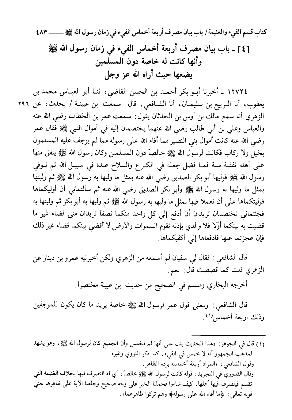 12724 - أَخْبَرَنَا أَبُو بَكْرٍ أَحْمَدُ بْنُ الْحَسَنِ الْقَاضِي، ثنا أَبُو الْعَبَّاسِ مُحَمَّدُ بْنُ يَعْقُوبَ، أنا الرَّبِيعُ بْنُ سُلَيْمَانَ , أنا الشَّافِعِيُّ قَالَ: سَمِعْتُ ابْنَ عُيَيْنَةَ يُحَدِّثُ، عَنِ الزُّهْرِيِّ , أَنَّهُ سَمِعَ مَالِكَ بْنَ أَوْسِ بْنِ الْحَدَثَانِ يَقُولُ: سَمِعْتُ عُمَرَ بْنَ الْخَطَّابِ رَضِيَ اللهُ عَنْهُ، وَالْعَبَّاسُ وَعَلِيُّ بْنُ أَبِي طَالِبٍ رَضِيَ اللهُ عَنْهُمَا يَخْتَصِمَانِ إِلَيْهِ فِي أَمْوَالِ النَّبِيِّ صَلَّى اللهُ عَلَيْهِ وَسَلَّمَ، فَقَالَ عُمَرُ رَضِيَ اللهُ عَنْهُ: §" كَانَتْ أَمْوَالُ بَنِي النَّضِيرِ مِمَّا أَفَاءَ اللهُ عَلَى رَسُولِهِ مِمَّا لَمْ يُوجِفْ عَلَيْهِ الْمُسْلِمُونَ بِخَيْلٍ وَلَا رِكَابٍ، فَكَانَتْ لِرَسُولِ اللهِ صَلَّى اللهُ عَلَيْهِ وَسَلَّمَ خَالِصًا دُونَ الْمُسْلِمِينَ، وَكَانَ رَسُولُ اللهِ صَلَّى اللهُ عَلَيْهِ وَسَلَّمَ يُنْفِقُ مِنْهَا عَلَى أَهْلِهِ نَفَقَةَ سَنَةٍ، فَمَا فَضَلَ جَعَلَهُ فِي الْكُرَاعِ وَالسِّلَاحِ عُدَّةً فِي سَبِيلِ اللهِ , ثُمَّ تُوُفِّيَ رَسُولُ اللهِ صَلَّى اللهُ عَلَيْهِ وَسَلَّمَ فَوَلِيَهَا أَبُو بَكْرٍ الصِّدِّيقُ رَضِيَ اللهُ عَنْهُ بِمِثْلِ مَا وَلِيَهَا بِهِ رَسُولُ اللهِ صَلَّى اللهُ عَلَيْهِ وَسَلَّمَ , ثُمَّ وَلِيتُهَا بِمِثْلِ مَا وَلِيَهَا بِهِ رَسُولُ اللهِ صَلَّى اللهُ عَلَيْهِ وَسَلَّمَ وَأَبُو بَكْرٍ الصِّدِّيقُ رَضِيَ اللهُ عَنْهُ، ثُمَّ سَأَلْتُمَانِي أَنْ أُوَلِّيَكُمَاهَا، فَوَلَّيْتُكُمَاهَا عَلَى أَنْ تَعْمَلَا فِيهَا بِمِثْلِ مَا وَلِيَهَا بِهِ رَسُولُ اللهِ صَلَّى اللهُ عَلَيْهِ وَسَلَّمَ ثُمَّ وَلِيَهَا بِهِ أَبُو بَكْرٍ ثُمَّ وَلِيتُهَا بِهِ، فَجِئْتُمَانِي تَخْتَصِمَانِ أتُرِيدَانِ أَنْ أَدْفَعَ إِلَى كُلِّ وَاحِدٍ مِنْكُما نِصْفًا، أتُرِيدَانِ مِنِّي قَضَاءً غَيْرَ مَا قَضَيْتُ بِهِ بَيْنَكُمَا أَوَّلًا , فَلَا وَالَّذِي بِإِذْنِهِ تَقُومُ السَّمَاوَاتُ وَالْأَرْضُ، لَا أَقْضِي بَيْنَكُمَا قَضَاءً غَيْرَ ذَلِكَ , فَإِنْ عَجَزْتُمَا عَنْهَا فَادْفَعَاهَا إِلِيَّ أَكْفِيكُمَاهَا " قَالَ الشَّافِعِيُّ: فَقَالَ لِي سُفْيَانُ: لَمْ أَسْمَعْهُ مِنَ الزُّهْرِيِّ، وَلَكِنْ أَخْبَرَنِيهِ عَمْرُو بْنُ دِينَارٍ عَنِ الزُّهْرِيِّ، قُلْتُ: كَمَا قَصَصْتَ؟ قَالَ: نَعَمْ أَخْرَجَهُ الْبُخَارِيُّ وَمُسْلِمٌ فِي الصَّحِيحِ مِنْ حَدِيثِ ابْنِ عُيَيْنَةَ مُخْتَصَرًا. قَالَ الشَّافِعِيُّ: وَمَعْنَى قَوْلِ عُمَرَ: لِرَسُولِ اللهِ صَلَّى اللهُ عَلَيْهِ وَسَلَّمَ خَاصَّةً، يُرِيدُ مَا كَانَ يَكُونُ لِلْمُوجِفِينَ، وَذَلِكَ أَرْبَعَةُ أَخْمَاسٍ -[484]-