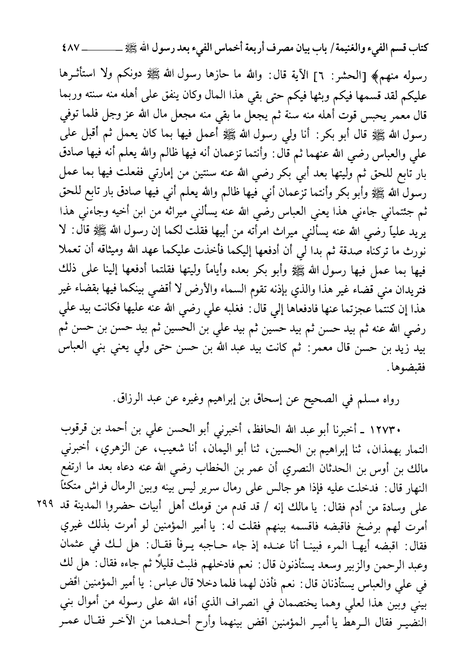 12730 - أَخْبَرَنَا أَبُو عَبْدِ اللهِ الْحَافِظُ , أَخْبَرَنِي أَبُو الْحَسَنِ عَلِيُّ بْنُ أَحْمَدَ بْنِ قُرْقُوبٍ التَّمَّارُ بِهَمَذَانَ، ثنا إِبْرَاهِيمُ بْنُ الْحُسَيْنِ , ثنا أَبُو الْيَمَانِ , أنا شُعَيْبٌ , عَنِ الزُّهْرِيِّ , أَخْبَرَنِي مَالِكُ بْنُ أَوْسِ بْنِ الْحَدَثَانِ النَّصْرِيُّ , أَنَّ عُمَرَ بْنَ الْخَطَّابِ رَضِيَ اللهُ عَنْهُ دَعَاهُ بَعْدَمَا ارْتَفَعَ النَّهَارُ قَالَ: فَدَخَلْتُ عَلَيْهِ فَإِذَا هُوَ جَالِسٌ عَلَى رُمَالِ سَرِيرٍ لَيْسَ بَيْنَهُ وَبَيْنَ الرُّمَالِ فِرَاشٌ، مُتَّكِئًا عَلَى وِسَادَةٍ مِنْ أَدَمٍ، فَقَالَ: يَا مَالِكُ، إِنَّهُ قَدْ قَدِمَ مِنْ قَوْمِكَ أَهْلُ أَبْيَاتٍ حَضَرُوا الْمَدِينَةَ قَدْ أَمَرْتُ لَهُمْ بِرَضْخٍ، فَاقْبِضْهُ فَاقْسِمْهُ بَيْنَهُمْ , فَقُلْتُ لَهُ: يَا أَمِيرَ الْمُؤْمِنِينَ، لَوْ أَمَرْتَ بِذَلِكَ غَيْرِي، فَقَالَ: اقْبِضْهُ أَيُّهَا الْمَرْءُ. فَبَيْنَا أَنَا عِنْدَهُ إِذْ جَاءَ حَاجِبُهُ يَرْفَأُ فَقَالَ: هَلْ لَكَ فِي عُثْمَانَ وَعَبْدِ الرَّحْمَنِ وَالزُّبَيْرِ وَسَعْدٍ يَسْتَأْذِنُونَ؟ قَالَ: نَعَمْ فَأَدْخِلْهُمْ، فَلَبِثَ قَلِيلًا ثُمَّ جَاءَهُ فَقَالَ: هَلْ لَكَ فِي عَلِيٍّ وَالْعَبَّاسِ يَسْتَأْذِنَانِ؟ قَالَ: نَعَمْ، فَأَذِنَ لَهُمَا , فَلَمَّا دَخَلَا قَالَ عَبَّاسٌ: يَا أَمِيرَ الْمُؤْمِنِينَ، اقْضِ بَيْنِي وَبَيْنَ هَذَا , لِعَلِيٍّ , وَهُمَا يَخْتَصِمَانِ فِي انْصِرَافِ الَّذِي أَفَاءَ اللهُ عَلَى رَسُولِهِ مِنْ أَمْوَالِ بَنِي النَّضِيرِ، فَقَالَ الرَّهْطُ: يَا أَمِيرَ الْمُؤْمِنِينَ، اقْضِ بَيْنَهُمَا وَأَرِحْ أَحَدَهُمَا مِنَ الْآخَرِ , فَقَالَ عُمَرُ -[488]- رَضِيَ اللهُ عَنْهُ: اتَّئِدُوا، أُنَاشِدُكُمْ بِاللهِ الَّذِي بِإِذْنِهِ تَقُومُ السَّمَاءُ وَالْأَرْضُ، هَلْ تَعْلَمُونَ أَنَّ النَّبِيَّ صَلَّى اللهُ عَلَيْهِ وَسَلَّمَ قَالَ: " §لَا نُورَثُ، مَا تَرَكْنَا صَدَقَةٌ "، يُرِيدُ نَفْسَهُ؟ قَالُوا: قَدْ قَالَ ذَلِكَ , فَأَقْبَلَ عُمَرُ عَلَى عَلِيٍّ وَعَبَّاسٍ رَضِيَ اللهُ عَنْهُمَا فَقَالَ: أَنْشُدُكُمَا بِاللهِ، أَتَعْلَمَانِ أَنَّ النَّبِيَّ صَلَّى اللهُ عَلَيْهِ وَسَلَّمَ قَالَ ذَلِكَ؟ قَالَا: نَعَمْ، قَالَ: فَإِنِّي أُحَدِّثُكُمْ عَنْ هَذَا الْأَمْرِ، إِنَّ اللهَ كَانَ خَصَّ رَسُولَ اللهِ صَلَّى اللهُ عَلَيْهِ وَسَلَّمَ مِنْ هَذَا الْفَيْءِ بِشَيْءٍ لَمْ يُعْطِهِ أَحَدًا غَيْرَهُ، فَقَالَ اللهُ {مَا أَفَاءَ اللهُ عَلَى رَسُولِهِ مِنْهُمْ فَمَا أَوْجَفْتُمْ عَلَيْهِ مِنْ خَيْلٍ وَلَا رِكَابٍ وَلَكِنَّ اللهَ يُسَلِّطُ رُسُلَهُ عَلَى مَنْ يَشَاءُ وَاللهُ عَلَى كُلِّ شَيْءٍ قَدِيرٌ} [الحشر: 6]، وَكَانَتْ هَذِهِ خَالِصَةً لِرَسُولِ اللهِ صَلَّى اللهُ عَلَيْهِ وَسَلَّمَ، فَوَاللهِ مَا احْتَازَهَا دُونَكُمْ، وَلَا اسْتَأْثَرَهَا عَلَيْكُمْ، لَقَدْ أَعْطَاكُمُوهَا وَبَثَّهَا فِيكُمْ، حَتَّى بَقِيَ مِنْهَا هَذَا الْمَالُ , فَكَانَ رَسُولُ اللهِ صَلَّى اللهُ عَلَيْهِ وَسَلَّمَ يُنْفِقُ عَلَى أَهْلِهِ نَفَقَةَ سَنَتِهِمْ مِنْ هَذَا الْمَالِ , ثُمَّ يَأْخُذُ مَا بَقِيَ فَيَجْعَلُهُ مَجْعَلِ مَالِ اللهِ , فَعَمِلَ بِذَلِكَ رَسُولُ اللهِ صَلَّى اللهُ عَلَيْهِ وَسَلَّمَ حَيَاتَهُ , ثُمَّ تُوُفِّيَ رَسُولُ اللهِ صَلَّى اللهُ عَلَيْهِ وَسَلَّمَ فَقَالَ أَبُو بَكْرٍ: فَأَنَا وَلِيُّ رَسُولِ اللهِ صَلَّى اللهُ عَلَيْهِ وَسَلَّمَ، فَقَبَضَهُ أَبُو بَكْرٍ فَعَمِلَ فِيهِ بِمَا عَمِلَ فِيهِ رَسُولُ اللهِ صَلَّى اللهُ عَلَيْهِ وَسَلَّمَ، وَأَنْتُمْ حِينَئِذٍ وَأَقْبَلَ عَلَى عَلِيٍّ وَعَبَّاسٍ رَضِيَ اللهُ عَنْهُمَا تَذْكُرَانِ أَنَّ أَبَا بَكْرٍ رَضِيَ اللهُ عَنْهُ فِيهِ كَمَا تَقُولَانِ , وَاللهُ يَعْلَ
