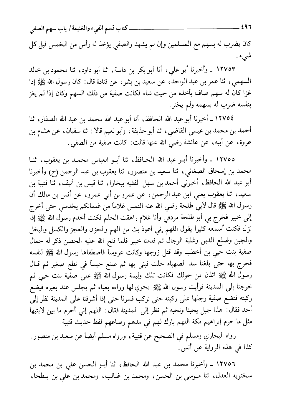 12755 - وَأَخْبَرَنَا أَبُو عَبْدِ اللهِ الْحَافِظُ , ثنا أَبُو الْعَبَّاسِ مُحَمَّدُ بْنُ يَعْقُوبَ، ثنا مُحَمَّدُ بْنُ إِسْحَاقَ الصَّغَانِيُّ , ثنا سَعِيدُ بْنُ مَنْصُورٍ , ثنا يَعْقُوبُ بْنُ عَبْدِ الرَّحْمَنِ ح وَأَخْبَرَنَا أَبُو عَبْدِ اللهِ الْحَافِظُ , أَخْبَرَنِي أَحْمَدُ بْنُ سَهْلٍ الْفَقِيهُ بِبُخَارَى، ثنا قَيْسُ بْنُ أُنَيْفٍ , ثنا قُتَيْبَةُ بْنُ سَعِيدٍ , ثنا يَعْقُوبُ يَعْنِي ابْنَ عَبْدِ الرَّحْمَنِ , عَنْ عَمْرِو بْنِ أَبِي عَمْرٍو , عَنْ أَنَسِ بْنِ مَالِكٍ , أَنَّ رَسُولَ اللهِ صَلَّى اللهُ عَلَيْهِ وَسَلَّمَ قَالَ لِأَبِي طَلْحَةَ رَضِيَ اللهُ عَنْهُ: " الْتَمِسْ غُلَامًا مِنْ غِلْمَانِكُمْ يَخْدُمُنِي حَتَّى أَخْرُجَ إِلَى خَيْبَرَ "، فَخَرَجَ بِي أَبُو طَلْحَةَ مُرْدِفِي، وَأَنَا غُلَامٌ رَاهَقْتُ الْحُلُمَ، فَكُنْتُ أَخْدُمُ رَسُولَ اللهِ صَلَّى اللهُ عَلَيْهِ وَسَلَّمَ إِذَا نَزَلَ، فَكُنْتُ أَسْمَعُهُ كَثِيرًا يَقُولُ: " §اللهُمَّ إِنِّي أَعُوذُ بِكَ مِنَ الْهَمِّ وَالْحَزَنِ، وَالْعَجْزِ وَالْكَسَلِ، وَالْبُخْلِ وَالْجُبْنِ، وَضَلَعِ الدَّيْنِ وَغَلَبَةِ الرِّجَالِ ". ثُمَّ قَدِمْنَا خَيْبَرَ، فَلَمَّا فَتَحَ اللهُ عَلَيْهِ الْحِصْنَ ذُكِرَ لَهُ جَمَالُ صَفِيَّةَ بِنْتِ حُيِيِّ بْنِ أَخْطَبَ، وَقَدْ قُتِلَ زَوْجُهَا، وَكَانَتْ عَرُوسًا , فَاصْطَفَاهَا رَسُولُ اللهِ صَلَّى اللهُ عَلَيْهِ وَسَلَّمَ لِنَفْسِهِ، فَخَرَجَ بِهَا حَتَّى بَلَغْنَا سَدَّ الصَّهْبَاءِ حَلَّتْ، فَبَنَى بِهَا , ثُمَّ صَنَعَ حَيْسًا فِي نِطَعٍ صَغِيرٍ , ثُمَّ قَالَ رَسُولُ اللهِ صَلَّى اللهُ عَلَيْهِ وَسَلَّمَ: " أَئْذِنْ مَنْ حَوْلَكَ "، فَكَانَتْ تِلْكَ وَلِيمَةَ رَسُولِ اللهِ صَلَّى اللهُ عَلَيْهِ وَسَلَّمَ عَلَى صَفِيَّةَ بِنْتِ حُيَيٍّ , ثُمَّ خَرَجْنَا إِلَى الْمَدِينَةِ، فَرَأَيْتُ رَسُولَ اللهِ صَلَّى اللهُ عَلَيْهِ وَسَلَّمَ يُحَوِّي لَهَا وَرَاءَهُ بِعَبَاءٍ , ثُمَّ يَجْلِسُ عِنْدَ بَعِيرِهِ فَيَضَعُ رُكْبَتَهُ، فَتَضَعُ صَفِيَّةُ رِجْلَهَا عَلَى رُكْبَتِهِ حَتَّى تَرْكَبَ , فَسِرْنَا حَتَّى إِذَا أَشْرَفْنَا عَلَى الْمَدِينَةِ نَظَرَ إِلَى أُحُدٍ فَقَالَ: " هَذَا جَبَلٌ يُحِبُّنَا وَنُحِبُّهُ " , ثُمَّ نَظَرَ إِلَى الْمَدِينَةِ فَقَالَ: " اللهُمَّ إِنِّي أُحَرِّمُ مَا بَيْنَ لَابَتَيْهَا مِثْلَ مَا حَرَّمَ إِبْرَاهِيمُ مَكَّةَ، اللهُمَّ بَارِكْ لَهُمْ فِي مُدِّهِمْ وَصَاعِهِمْ " لَفْظُ حَدِيثِ قُتَيْبَةَ، رَوَاهُ الْبُخَارِيُّ وَمُسْلِمٌ فِي الصَّحِيحِ عَنْ قُتَيْبَةَ , وَرَوَاهُ مُسْلِمٌ أَيْضًا عَنْ سَعِيدِ بْنِ مَنْصُورٍ، كَذَا فِي هَذِهِ الرِّوَايَةِ عَنْ أَنَسٍ