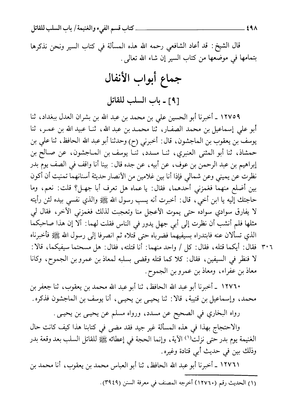 12760 - أَخْبَرَنَا أَبُو عَبْدِ اللهِ الْحَافِظُ , ثنا أَبُو عَبْدِ اللهِ مُحَمَّدُ بْنُ يَعْقُوبَ، ثنا جَعْفَرُ بْنُ مُحَمَّدٍ , وَإِسْمَاعِيلُ بْنُ قُتَيْبَةَ , قَالَا: ثنا يَحْيَى بْنُ يَحْيَى , أنا يُوسُفُ بْنُ الْمَاجِشُونِ , فَذَكَرَهُ. رَوَاهُ الْبُخَارِيُّ فِي الصَّحِيحِ عَنْ مُسَدَّدٍ، وَرَوَاهُ مُسْلِمٌ عَنْ يَحْيَى بْنِ يَحْيَى وَالِاحْتِجَاجُ بِهَذَا فِي هَذِهِ الْمَسْأَلَةِ غَيْرُ جَيِّدٍ؛ فَقَدْ مَضَى فِي كِتَابِنَا هَذَا كَيْفَ كَانَتْ حَالُ الْغَنِيمَةِ يَوْمَ بَدْرٍ حَتَّى نَزَلَتِ الْآيَةُ، وَإِنَّمَا الْحُجَّةُ فِي إِعْطَائِهِ صَلَّى اللهُ عَلَيْهِ وَسَلَّمَ لِلْقَاتِلِ السَّلَبَ بَعْدَ وَقْعَةِ بَدْرٍ، وَذَلِكَ بَيِّنٌ فِي حَدِيثِ أَبِي قَتَادَةَ وَغَيْرِهِ