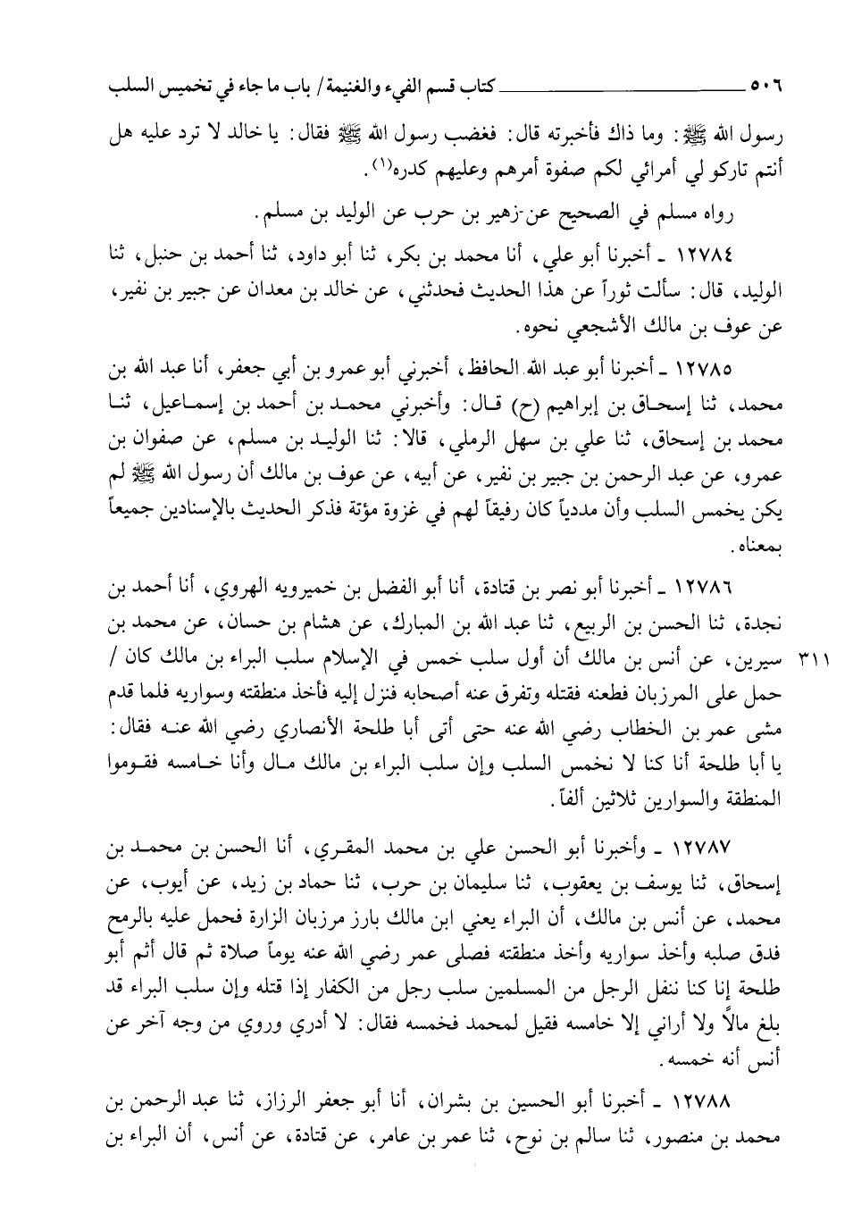 12786 - أَخْبَرَنَا أَبُو نَصْرِ بْنُ قَتَادَةَ , أنا أَبُو الْفَضْلِ بْنُ خَمِيرَوَيْهِ الْهَرَوِيُّ , أنا أَحْمَدُ بْنُ نَجْدَةَ , ثنا الْحَسَنُ بْنُ الرَّبِيعِ , ثنا عَبْدُ اللهِ بْنُ الْمُبَارَكِ , عَنْ هِشَامِ بْنِ حَسَّانَ , عَنْ مُحَمَّدِ بْنِ سِيرِينَ , عَنْ أَنَسِ بْنِ مَالِكٍ , أَنَّ أَوَّلَ سَلَبٍ خُمِّسَ فِي الْإِسْلَامِ سَلَبُ الْبَرَاءِ بْنِ مَالِكٍ، كَانَ حَمَلَ عَلَى الْمَرْزُبَانِ فَطَعَنَهُ فَقَتَلَهُ، وَتَفَرَّقَ عَنْهُ أَصْحَابُهُ، فَنَزَلَ إِلَيْهِ فَأَخَذَ مِنْطَقَتَهُ وَسِوَارَيْهِ , فَلَمَّا قَدِمَ مَشَى عُمَرُ بْنُ الْخَطَّابِ رَضِيَ اللهُ عَنْهُ حَتَّى أَتَى أَبَا طَلْحَةَ الْأَنْصَارِيَّ رَضِيَ اللهُ عَنْهُ فَقَالَ: يَا أَبَا طَلْحَةَ، " §إِنَّا كُنَّا لَا نُخَمِّسُ السَّلَبَ، وَإِنَّ سَلَبَ الْبَرَاءِ بْنِ مَالِكٍ مَالٌ، وَأَنَا خَامِسُهُ " فَقَوَّمُوا الْمِنْطَقَةَ وَالسِّوَارَيْنِ ثَلَاثِينَ أَلْفًا
