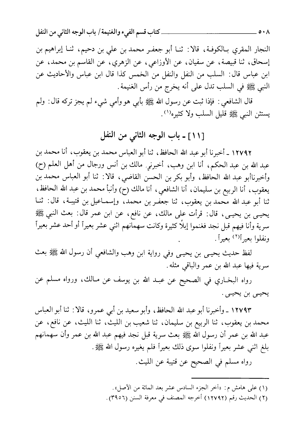 12792 - أَخْبَرَنَا أَبُو عَبْدِ اللهِ الْحَافِظُ , ثنا أَبُو الْعَبَّاسِ مُحَمَّدُ بْنُ يَعْقُوبَ , أنا مُحَمَّدُ بْنُ عَبْدِ اللهِ بْنِ عَبْدِ الْحَكَمِ , أنا ابْنُ وَهْبٍ , أَخْبَرَنِي مَالِكُ بْنُ أَنَسٍ , وَرِجَالٌ مِنْ أَهْلِ الْعِلْمِ، ح وَأَخْبَرَنَا أَبُو عَبْدِ اللهِ الْحَافِظُ , وَأَبُو بَكْرِ بْنُ الْحَسَنِ الْقَاضِي، قَالَا: ثنا أَبُو الْعَبَّاسِ مُحَمَّدُ بْنُ يَعْقُوبَ , أنا الرَّبِيعُ بْنُ سُلَيْمَانَ , أنا الشَّافِعِيُّ , أنا مَالِكٌ ح، وَأنبأ مُحَمَّدُ بْنُ عَبْدِ اللهِ الْحَافِظُ , ثنا أَبُو عَبْدِ اللهِ مُحَمَّدُ بْنُ يَعْقُوبَ , ثنا جَعْفَرُ بْنُ مُحَمَّدٍ , وَإِسْمَاعِيلُ بْنُ قُتَيْبَةَ قَالَ: ثنا يَحْيَى بْنُ يَحْيَى قَالَ: قَرَأْتُ عَلَى مَالِكٍ , عَنْ نَافِعٍ , عَنِ ابْنِ عُمَرَ قَالَ: §" بَعَثَ النَّبِيُّ صَلَّى اللهُ عَلَيْهِ وَسَلَّمَ سَرِيَّةً وَأَنَا فِيهِمْ قِبَلَ نَجْدٍ، فَغَنِمُوا إِبِلًا كَثِيرَةً، وَكَانَتْ سُهْمَانُهُمُ اثْنَيْ عَشَرَ بَعِيرًا، أَوْ أَحَدَ عَشَرَ بَعِيرًا، وَنُفِّلُوا بَعِيرًا بَعِيرًا " لَفْظُ حَدِيثِ يَحْيَى بْنِ يَحْيَى، وَفِي رِوَايَةِ ابْنِ وَهْبٍ وَالشَّافِعِيِّ أَنَّ رَسُولَ اللهِ صَلَّى اللهُ عَلَيْهِ وَسَلَّمَ بَعَثَ سَرِيَّةً فِيهَا عَبْدُ اللهِ بْنُ عُمَرَ، وَالْبَاقِي مِثْلُهُ رَوَاهُ الْبُخَارِيُّ فِي الصَّحِيحِ عَنْ عَبْدِ اللهِ بْنِ يُوسُفَ عَنْ مَالِكٍ , وَرَوَاهُ مُسْلِمٌ عَنْ يَحْيَى بْنِ يَحْيَى