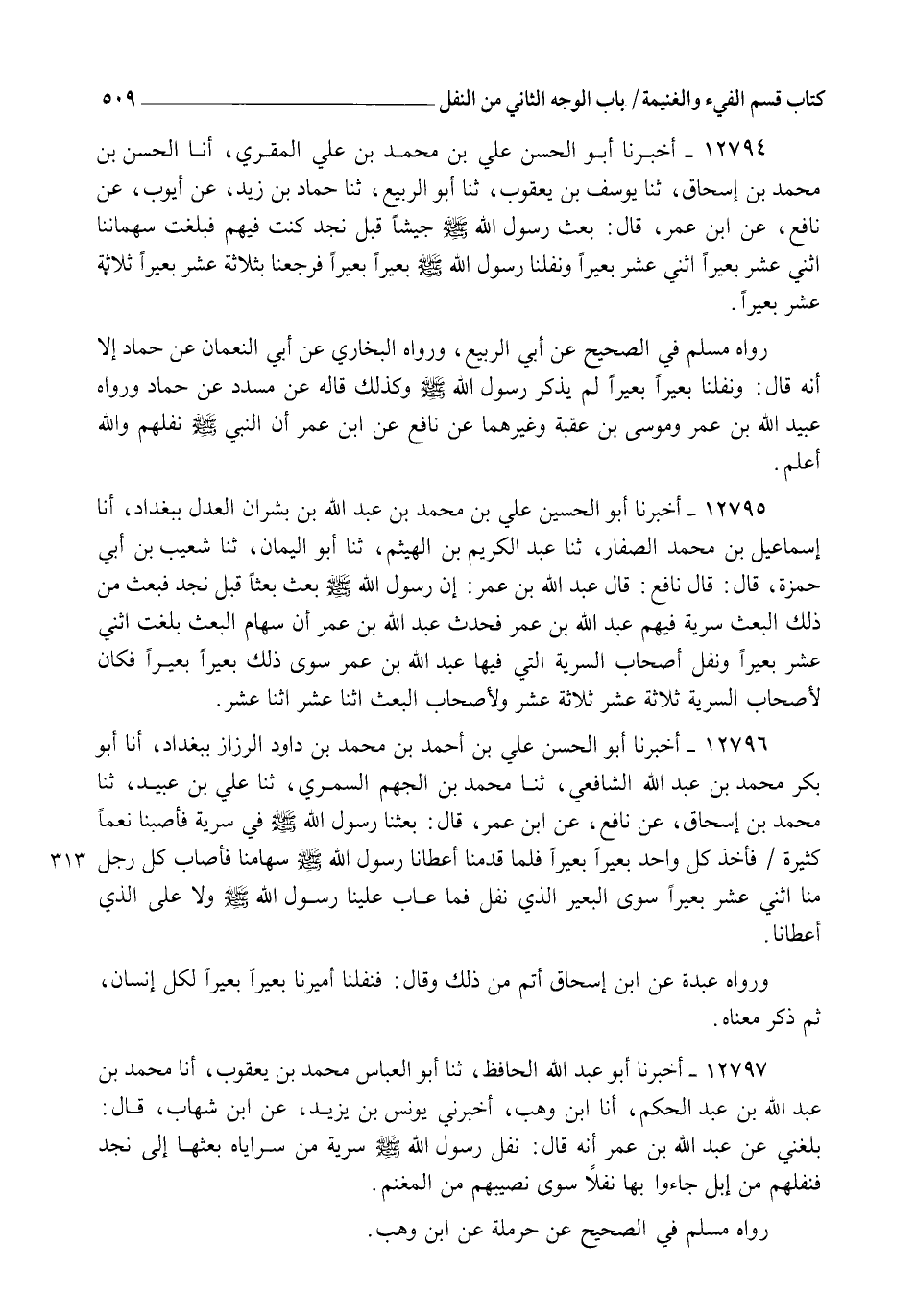 12794 - أَخْبَرَنَا أَبُو الْحَسَنِ عَلِيُّ بْنُ مُحَمَّدِ بْنِ عَلِيٍّ الْمُقْرِئُ , أنا الْحَسَنُ بْنُ مُحَمَّدِ بْنِ إِسْحَاقَ , ثنا يُوسُفُ بْنُ يَعْقُوبَ , ثنا أَبُو الرَّبِيعِ , ثنا حَمَّادُ بْنُ زَيْدٍ , عَنْ أَيُّوبَ , عَنْ نَافِعٍ , عَنِ ابْنِ عُمَرَ قَالَ: " بَعَثَ رَسُولُ اللهِ صَلَّى اللهُ عَلَيْهِ وَسَلَّمَ جَيْشًا قِبَلَ نَجْدٍ، كُنْتُ فِيهِمْ , §فَبَلَغَتْ سُهْمَانُنَا اثْنَيْ عَشَرَ بَعِيرًا اثْنَيْ عَشَرَ بَعِيرًا، وَنَفَّلَنَا رَسُولُ اللهِ صَلَّى اللهُ عَلَيْهِ وَسَلَّمَ بَعِيرًا بَعِيرًا، فَرَجَعْنَا بِثَلَاثَةَ عَشَرَ بَعِيرًا ثَلَاثَةَ عَشَرَ بَعِيرًا " رَوَاهُ مُسْلِمٌ فِي الصَّحِيحِ عَنْ أَبِي الرَّبِيعِ , وَرَوَاهُ الْبُخَارِيُّ عَنْ أَبِي النُّعْمَانِ عَنْ حَمَّادٍ، إِلَّا أَنَّهُ قَالَ: وَنُفِّلْنَا بَعِيرًا بَعِيرًا , لَمْ يَذْكُرْ رَسُولَ اللهِ صَلَّى اللهُ عَلَيْهِ وَسَلَّمَ. وَكَذَلِكَ قَالَهُ عَنْ مُسَدَّدٍ عَنْ حَمَّادٍ، وَرَوَاهُ عُبَيْدُ اللهِ بْنُ عُمَرَ وَمُوسَى بْنُ عُقْبَةَ وَغَيْرُهُمَا، عَنْ نَافِعٍ، عَنِ ابْنِ عُمَرَ، أَنَّ النَّبِيَّ صَلَّى اللهُ عَلَيْهِ وَسَلَّمَ نَفَّلَهُمْ، وَاللهُ أَعْلَمُ