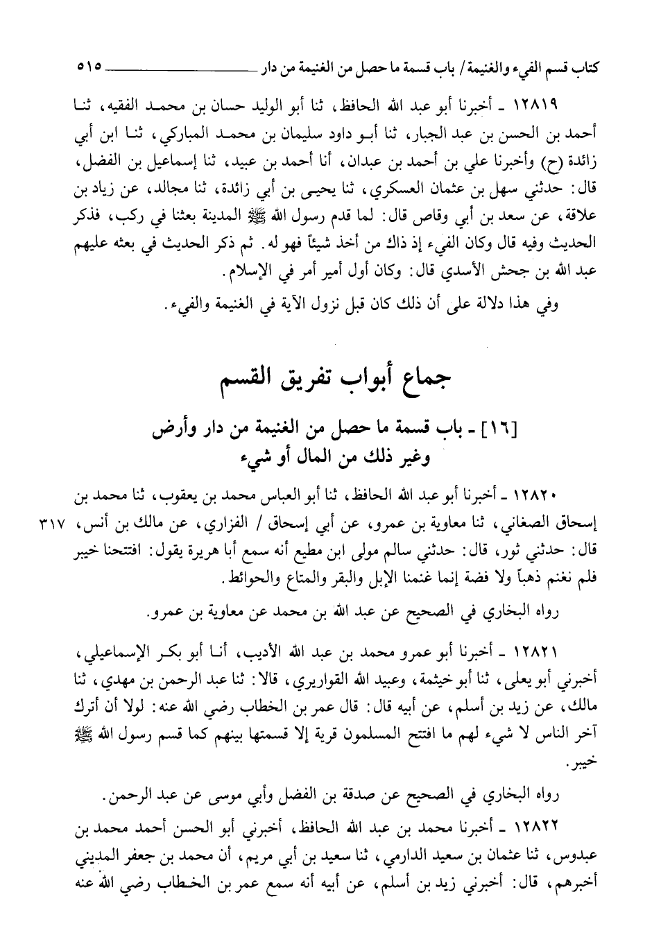 12821 - أَخْبَرَنَا أَبُو عَمْرٍو مُحَمَّدُ بْنُ عَبْدِ اللهِ الْأَدِيبُ , أنا أَبُو بَكْرٍ الْإِسْمَاعِيلِيُّ , أَخْبَرَنِي أَبُو يَعْلَى , ثنا أَبُو خَيْثَمَةَ , وَعُبَيْدُ اللهِ الْقَوَارِيرِيُّ , قَالَا: ثنا عَبْدُ الرَّحْمَنِ بْنُ مَهْدِيٍّ , ثنا مَالِكٌ , عَنْ زَيْدِ بْنِ أَسْلَمَ , عَنْ أَبِيهِ قَالَ: قَالَ عُمَرُ بْنُ الْخَطَّابِ رَضِيَ اللهُ عَنْهُ: " لَوْلَا أَنْ أَتْرُكَ آخِرَ النَّاسِ لَا شَيْءَ لَهُمْ مَا افْتَتَحَ الْمُسْلِمُونَ قَرْيَةً إِلَّا قَسَمْتُهَا بَيْنَهُمْ كَمَا §قَسَمَ رَسُولُ اللهِ صَلَّى اللهُ عَلَيْهِ وَسَلَّمَ خَيْبَرَ " رَوَاهُ الْبُخَارِيُّ فِي الصَّحِيحِ عَنْ صَدَقَةَ بْنِ الْفَضْلِ وَأَبِي مُوسَى، عَنْ عَبْدِ الرَّحْمَنِ
