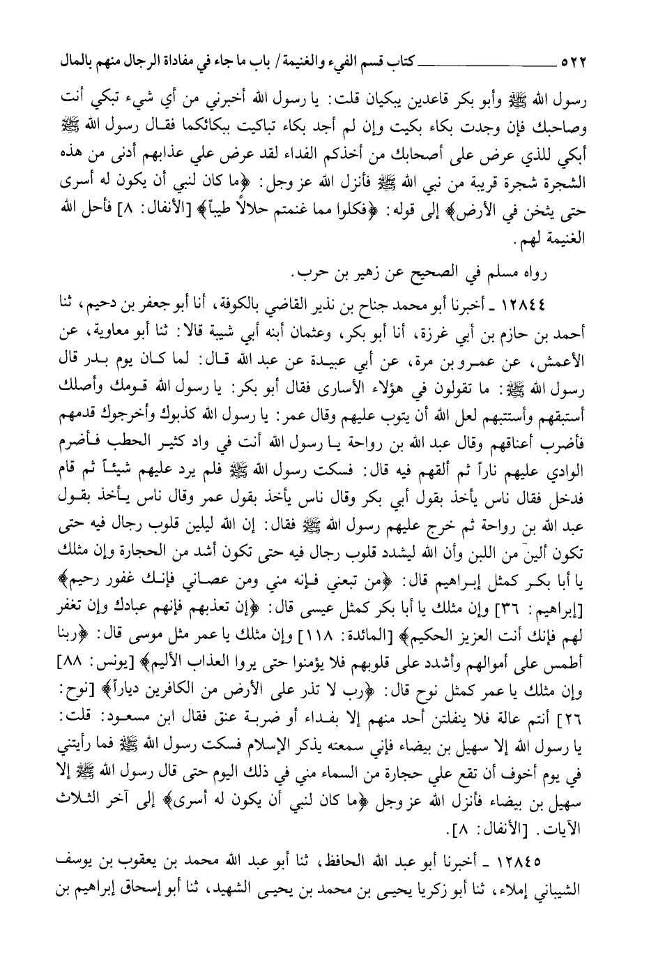 12845 - أَخْبَرَنَا أَبُو عَبْدِ اللهِ الْحَافِظُ , ثنا أَبُو عَبْدِ اللهِ مُحَمَّدُ بْنُ يَعْقُوبَ بْنِ يُوسُفَ الشَّيْبَانِيُّ إِمْلَاءً، ثنا أَبُو زَكَرِيَّا يَحْيَى بْنُ مُحَمَّدِ بْنِ يَحْيَى الشَّهِيدُ , ثنا أَبُو إِسْحَاقَ إِبْرَاهِيمُ بْنُ -[523]- مُحَمَّدِ بْنِ عَرْعَرَةَ , ثنا أَزْهَرُ بْنُ سَعْدٍ السَّمَّانُ , ثنا ابْنُ عَوْنٍ , عَنْ مُحَمَّدٍ , عَنْ عَبِيدَةَ , عَنْ عَلِيٍّ رَضِيَ اللهُ عَنْهُ قَالَ: قَالَ رَسُولُ اللهِ صَلَّى اللهُ عَلَيْهِ وَسَلَّمَ فِي الْأُسَارَى يَوْمَ بَدْرٍ: §" إِنْ شِئْتُمْ قَتَلْتُمُوهُمْ , وَإِنْ شِئْتُمْ فَادَيْتُمُوهُمْ وَاسْتَمْتَعْتُمْ بِالْفِدَاءِ وَاسْتُشْهِدَ مِنْكُمْ بِعِدَّتِهِمْ " فَكَانَ آخِرَ السَّبْعِينَ ثَابِتُ بْنُ قَيْسٍ، اسْتُشْهِدَ بِالْيَمَامَةِ