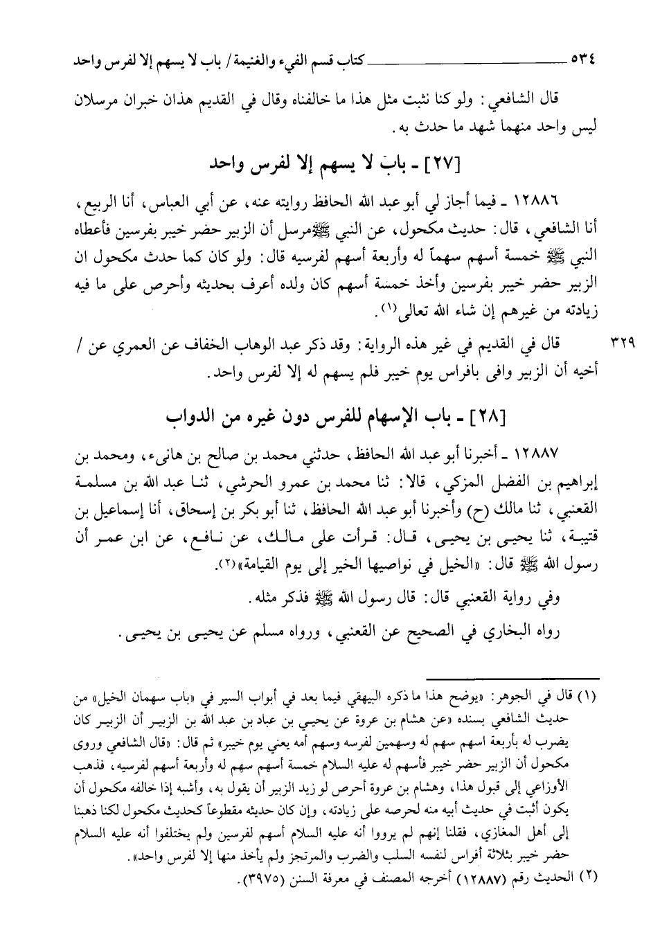 12887 - أَخْبَرَنَا أَبُو عَبْدِ اللهِ الْحَافِظُ , حَدَّثَنِي مُحَمَّدُ بْنُ صَالِحِ بْنِ هَانِئٍ , وَمُحَمَّدُ بْنُ إِبْرَاهِيمَ بْنِ الْفَضْلِ الْمُزَكِّي , قَالَا: ثنا مُحَمَّدُ بْنُ عَمْرٍو الْحَرَشِيُّ , ثنا عَبْدُ اللهِ بْنُ مَسْلَمَةَ الْقَعْنَبِيُّ , ثنا مَالِكٌ ح وَأَخْبَرَنَا أَبُو عَبْدِ اللهِ الْحَافِظُ , ثنا أَبُو بَكْرِ بْنُ إِسْحَاقَ , أنا إِسْمَاعِيلُ بْنُ قُتَيْبَةَ , ثنا يَحْيَى بْنُ يَحْيَى قَالَ: قَرَأْتُ عَلَى مَالِكٍ , عَنْ نَافِعٍ , عَنِ ابْنِ عُمَرَ , أَنَّ رَسُولَ اللهِ صَلَّى اللهُ عَلَيْهِ وَسَلَّمَ قَالَ: §" الْخَيْلُ فِي نَوَاصِيهَا الْخَيْرُ إِلَى يَوْمِ الْقِيَامَةِ " وَفِي رِوَايَةِ الْقَعْنَبِيِّ قَالَ: قَالَ رَسُولُ اللهِ صَلَّى اللهُ عَلَيْهِ وَسَلَّمَ، فَذَكَرَ مِثْلَهُ رَوَاهُ الْبُخَارِيُّ فِي الصَّحِيحِ عَنِ الْقَعْنَبِيِّ , وَرَوَاهُ مُسْلِمٌ عَنْ يَحْيَى بْنِ يَحْيَى