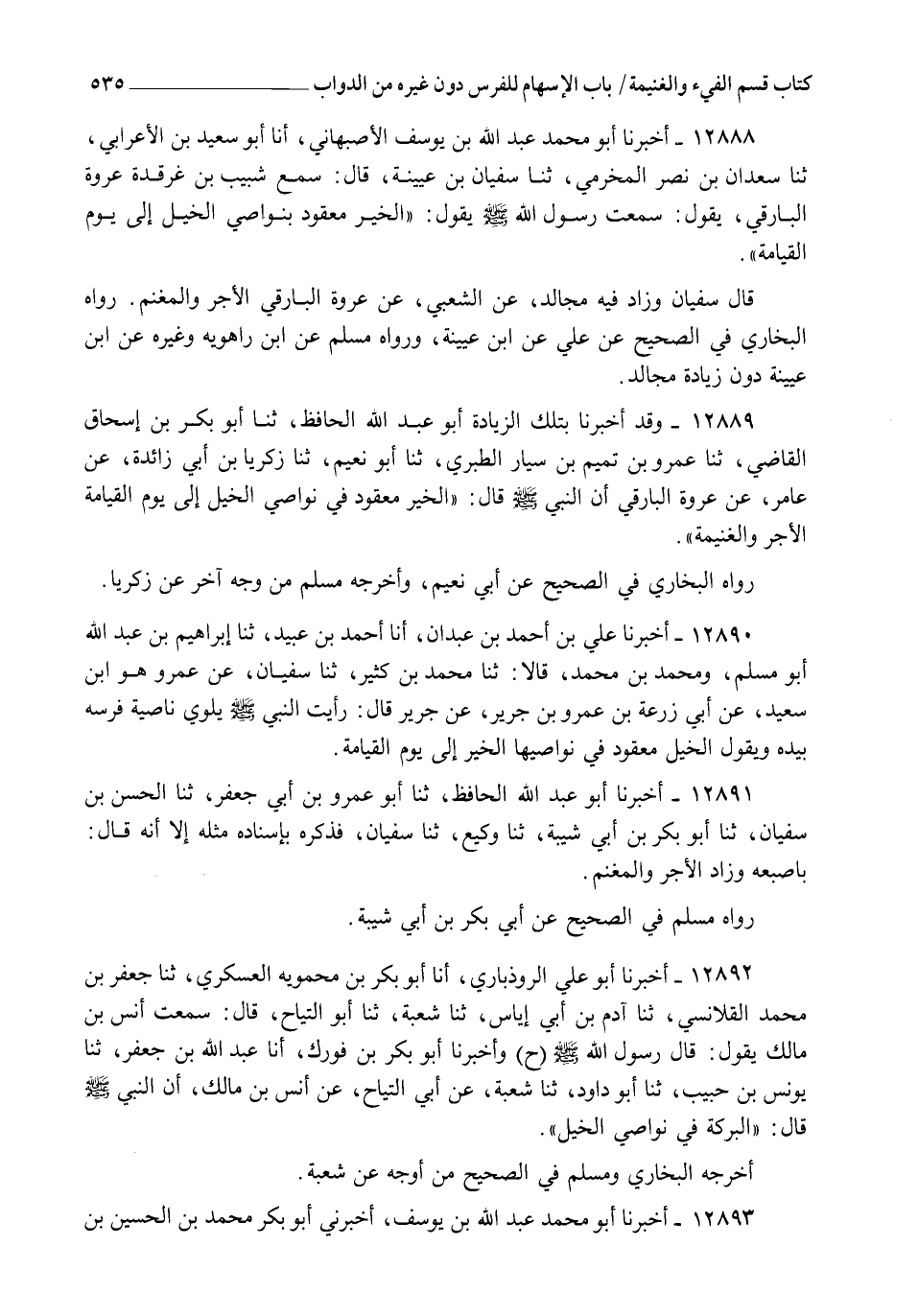 12889 - وَقَدْ أَخْبَرَنَا بِتِلْكَ الزِّيَادَةِ أَبُو عَبْدِ اللهِ الْحَافِظُ , ثنا أَبُو بَكْرِ بْنُ إِسْحَاقَ الْقَاضِي , ثنا عَمْرُو بْنُ تَمِيمِ بْنِ سَيَّارٍ الطَّبَرِيُّ , ثنا أَبُو نُعَيْمٍ , ثنا زَكَرِيَّا بْنُ أَبِي زَائِدَةَ , عَنْ عَامِرٍ , عَنْ عُرْوَةَ الْبَارِقِيِّ , أَنَّ النَّبِيَّ صَلَّى اللهُ عَلَيْهِ وَسَلَّمَ قَالَ: §" الْخَيْرُ مَعْقُودٌ فِي نَوَاصِي الْخَيْلِ إِلَى يَوْمِ الْقِيَامَةِ الْأَجْرُ وَالْغَنِيمَةُ " رَوَاهُ الْبُخَارِيُّ فِي الصَّحِيحِ عَنْ أَبِي نُعَيْمٍ , وَأَخْرَجَهُ مُسْلِمٌ مِنْ وَجْهٍ آخَرَ عَنْ زَكَرِيَّا