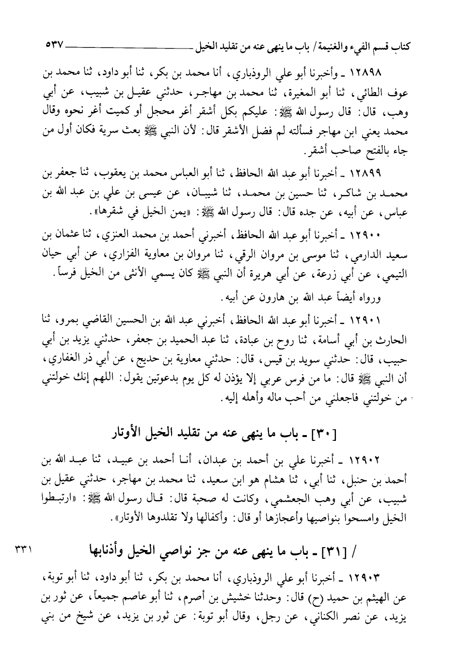 12902 - أَخْبَرَنَا عَلِيُّ بْنُ أَحْمَدَ بْنِ عَبْدَانَ , أنا أَحْمَدُ بْنُ عُبَيْدٍ , ثنا عَبْدُ اللهِ بْنُ أَحْمَدَ بْنِ حَنْبَلٍ , ثنا أَبِي , ثنا هِشَامٌ هُوَ ابْنُ سَعِيدٍ , ثنا مُحَمَّدُ بْنُ مُهَاجِرٍ , حَدَّثَنِي عَقِيلُ بْنُ شَبِيبٍ , عَنْ أَبِي وَهْبٍ الْجُشَمِيِّ , وَكَانَتْ لَهُ صُحْبَةٌ، قَالَ: قَالَ رَسُولُ اللهِ صَلَّى اللهُ عَلَيْهِ وَسَلَّمَ: " §ارْتَبِطُوا الْخَيْلَ، وَامْسَحُوا بِنَوَاصِيهَا وَأَعْجَازِهَا " , أَوْ قَالَ: " وَأَكْفَالِهَا، وَلَا تُقَلِّدُوهَا الْأَوْتَارَ "