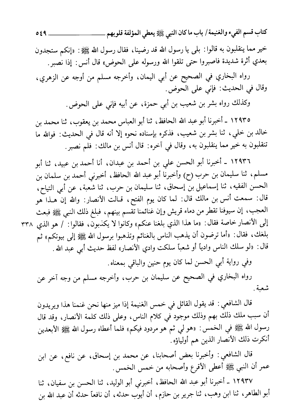 12936 - أَخْبَرَنَا أَبُو الْحَسَنِ عَلِيُّ بْنُ أَحْمَدَ بْنِ عَبْدَانَ , أنا أَحْمَدُ بْنُ عُبَيْدٍ , ثنا أَبُو مُسْلِمٍ , ثنا سُلَيْمَانُ بْنُ حَرْبٍ ح وَأَخْبَرَنَا أَبُو عَبْدِ اللهِ الْحَافِظُ , أَخْبَرَنِي أَحْمَدُ بْنُ سَلْمَانَ بْنِ الْحَسَنِ الْفَقِيهُ , ثنا إِسْمَاعِيلُ بْنُ إِسْحَاقَ , ثنا سُلَيْمَانُ بْنُ حَرْبٍ , ثنا شُعْبَةُ , عَنْ أَبِي التَّيَّاحِ قَالَ: سَمِعْتُ أَنَسَ بْنَ مَالِكٍ قَالَ: لَمَّا كَانَ يَوْمُ الْفَتْحِ قَالَتِ الْأَنْصَارُ: وَاللهِ إِنَّ هَذَا هُوَ الْعَجَبُ، إِنَّ سُيُوفَنَا تَقْطُرُ مِنْ دِمَاءِ قُرَيْشٍ، وَإِنَّ غَنَائِمَنَا تُقْسَمُ بَيْنَهُمْ، فَبَلَغَ ذَلِكَ النَّبِيَّ صَلَّى اللهُ عَلَيْهِ وَسَلَّمَ، فَبَعَثَ إِلَى الْأَنْصَارِ خَاصَّةً فَقَالَ: " مَا هَذَا الَّذِي بَلَغَنَا عَنْكُمْ؟ " وَكَانُوا لَا يَكْذِبُونَ، فَقَالُوا هُوَ الَّذِي بَلَغَكَ، فَقَالَ: §" أَمَا تَرْضَوْنَ أَنْ يَذْهَبَ النَّاسُ بِالْغَنَائِمِ وَتَذْهَبُوا بِرَسُولِ اللهِ صَلَّى اللهُ عَلَيْهِ وَسَلَّمَ إِلَى بُيُوتِكُمْ؟ " ثُمَّ قَالَ: " لَوْ سَلَكَ النَّاسُ وَادِيًا أَوْ شِعْبًا سَلَكْتُ وَادِيَ الْأَنْصَارِ" لَفْظُ حَدِيثِ أَبِي عَبْدِ اللهِ، وَفِي رِوَايَةِ أَبِي الْحَسَنِ: لَمَّا كَانَ يَوْمُ حُنَيْنٍ , وَالْبَاقِي بِمَعْنَاهُ. رَوَاهُ الْبُخَارِيُّ فِي الصَّحِيحِ عَنْ سُلَيْمَانَ بْنِ حَرْبٍ , وَأَخْرَجَهُ مُسْلِمٌ مِنْ وَجْهٍ آخَرَ عَنْ شُعْبَةَ قَالَ الشَّافِعِيُّ: قَدْ يَقُولُ الْقَائِلُ فِي خُمُسِ الْغَنِيمَةِ إِذَا مُيِّزَ مِنْهَا: نَحْنُ غَنِمْنَا هَذَا، وَيُرِيدُونَ أَنَّ سَبَبَ مِلْكِ ذَلِكَ بِهِمْ، وَذَلِكَ مَوْجُودٌ فِي كَلَامِ النَّاسِ، وَعَلَى ذَلِكَ كَلِمَةُ الْأَنْصَارِ، وَقَدْ قَالَ رَسُولُ اللهِ صَلَّى اللهُ عَلَيْهِ وَسَلَّمَ فِي الْخُمُسِ: " هُوَ لِي، ثُمَّ هُوَ مَرْدُودٌ فِيكُمْ"، فَلَمَّا أَعْطَاهُ رَسُولُ اللهِ صَلَّى اللهُ عَلَيْهِ وَسَلَّمَ الْأَبْعَدِينَ أَنْكَرَتْ ذَلِكَ الْأَنْصَارُ الَّذِينَ هُمْ أَوْلِيَاؤُهُ قَالَ الشَّافِعِيُّ: وَأَخْبَرَنَا بَعْضُ أَصْحَابِنَا , عَنْ مُحَمَّدِ بْنِ إِسْحَاقَ , عَنْ نَافِعٍ، عَنِ ابْنِ عُمَرَ، أَنَّ النَّبِيَّ صَلَّى اللهُ عَلَيْهِ وَسَلَّمَ أَعْطَى الْأَقْرَعَ وَأَصْحَابَهُ مِنْ خُمُسِ الْخُمُسِ
