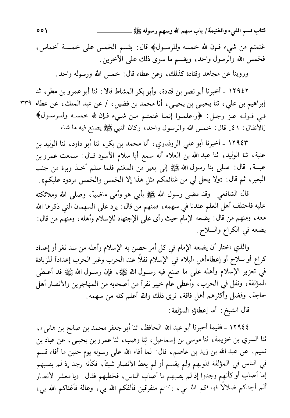 12943 - أَخْبَرَنَا أَبُو عَلِيٍّ الرُّوذْبَارِيُّ , أنا مُحَمَّدُ بْنُ بَكْرٍ , ثنا أَبُو دَاوُدَ , ثنا الْوَلِيدُ بْنُ عُتْبَةَ , ثنا الْوَلِيدُ , ثنا عَبْدُ اللهِ بْنُ الْعَلَاءِ , أَنَّهُ سَمِعَ أَبَا سَلَّامٍ الْأَسْوَدَ قَالَ: سَمِعْتُ عَمْرَو بْنَ عَبْسَةَ قَالَ: صَلَّى بِنَا رَسُولُ اللهِ صَلَّى اللهُ عَلَيْهِ وَسَلَّمَ إِلَى بَعِيرٍ مِنَ الْمَغْنَمِ، فَلَمَّا سَلَّمَ أَخَذَ وَبَرَةً مِنْ جَنْبِ الْبَعِيرِ ثُمَّ قَالَ: " §وَلَا يَحِلُّ مِنْ غَنَائِمِكُمْ مِثْلُ هَذَا، إِلَّا الْخُمُسَ، وَالْخُمُسُ مَرْدُودٌ عَلَيْكُمْ " قَالَ الشَّافِعِيُّ: وَقَدْ مَضَى رَسُولُ اللهِ صَلَّى اللهُ عَلَيْهِ وَسَلَّمَ بِأَبِي هُوَ وَأُمِّي مَاضِيًا، وَصَلَّى اللهُ وَمَلَائِكَتُهُ عَلَيْهِ، فَاخْتَلَفَ أَهْلُ الْعِلْمِ عِنْدَنَا فِي سَهْمِهِ، فَمِنْهُمْ مَنْ قَالَ: يُرَدُّ عَلَى السُّهْمَانِ الَّتِي ذَكَرَهَا اللهُ مَعَهُ، وَمِنْهُمْ مَنْ قَالَ: يَضَعُهُ الْإِمَامُ حَيْثُ رَأَى عَلَى الِاجْتِهَادِ لِلْإِسْلَامِ وَأَهْلِهِ , وَمِنْهُمْ مَنْ قَالَ: يَضَعُهُ فِي الْكُرَاعِ وَالسِّلَاحِ , وَالَّذِي أَخْتَارُ أَنْ يَضَعَهُ الْإِمَامُ فِي كُلِّ أَمْرٍ حُصِّنَ بِهِ الْإِسْلَامُ وَأَهْلُهُ، مِنْ سَدِّ ثَغْرٍ، أَوْ إِعْدَادِ كُرَاعٍ أَوْ سِلَاحٍ، أَوْ إِعْطَاءِ أَهْلِ الْبَلَاءِ فِي الْإِسْلَامِ نَفْلًا عِنْدَ الْحَرْبِ وَغَيْرِ الْحَرْبِ إِعْدَادًا لِلزِّيَادَةِ فِي تَعْزِيرِ الْإِسْلَامِ وَأَهْلِهِ، عَلَى مَا صَنَعَ فِيهِ رَسُولُ اللهِ صَلَّى اللهُ عَلَيْهِ وَسَلَّمَ , فَإِنَّ رَسُولَ اللهِ صَلَّى اللهُ عَلَيْهِ وَسَلَّمَ قَدْ أَعْطَى الْمُؤَلَّفَةَ، وَنَفَّلَ فِي الْحَرْبِ، وَأَعْطَى عَامَ خَيْبَرَ نَفَرًا مِنْ أَصْحَابِهِ مِنَ الْمُهَاجِرِينَ وَالْأَنْصَارِ أَهْلَ حَاجَةٍ وَفَضْلٍ، وَأَكْثَرُهُمْ أَهْلُ فَاقَةٍ، نَرَى ذَلِكَ وَاللهُ أَعْلَمُ كُلَّهُ مِنْ سَهْمِهِ