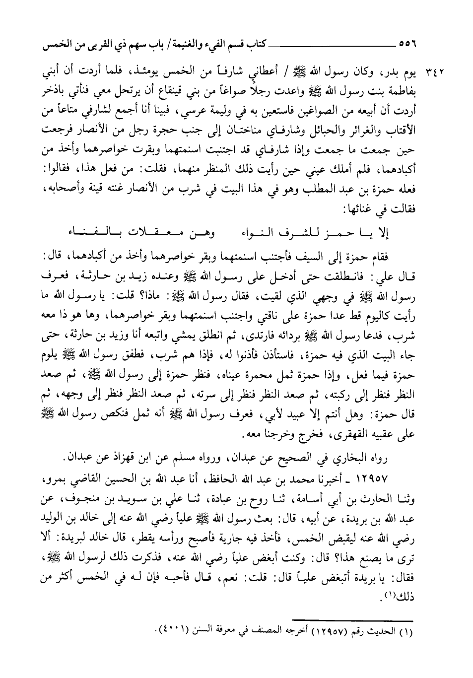 12957 - أَخْبَرَنَا مُحَمَّدُ بْنُ عَبْدِ اللهِ الْحَافِظُ , أنا عَبْدُ اللهِ بْنُ الْحُسَيْنِ الْقَاضِي بِمَرْوَ , وَثنا الْحَارِثُ بْنُ أَبِي أُسَامَةَ , ثنا رَوْحُ بْنُ عُبَادَةَ , ثنا عَلِيُّ بْنُ سُوَيْدِ بْنِ مَنْجُوفٍ , عَنْ عَبْدِ اللهِ بْنِ بُرَيْدَةَ , عَنْ أَبِيهِ قَالَ: بَعَثَ رَسُولُ اللهِ صَلَّى اللهُ عَلَيْهِ وَسَلَّمَ عَلِيًّا رَضِيَ اللهُ عَنْهُ إِلَى خَالِدِ بْنِ الْوَلِيدِ رَضِيَ اللهُ عَنْهُ لِيَقْبِضَ الْخُمُسَ، فَأَخَذَ منهِ جَارِيَةً، فَأَصْبَحَ وَرَأْسُهُ يَقْطُرُ، قَالَ خَالِدٌ لِبُرَيْدَةَ: أَلَا تَرَى مَا يَصْنَعُ هَذَا؟ قَالَ: وَكُنْتُ أُبْغِضُ عَلِيًّا رَضِيَ اللهُ عَنْهُ، فَذَكَرْتُ ذَلِكَ لِرَسُولِ اللهِ صَلَّى اللهُ عَلَيْهِ وَسَلَّمَ , فَقَالَ: " يَا بُرَيْدَةُ، §أَتُبْغِضُ عَلِيًّا؟ " قَالَ: قُلْتُ: نَعَمْ، قَالَ: " فَأَحِبَّهُ؛ فَإِنَّ لَهُ فِي الْخُمُسِ أَكْثَرَ مِنْ ذَلِكَ " -[557]- رَوَاهُ الْبُخَارِيُّ فِي الصَّحِيحِ عَنِ بُنْدَارٍ عَنْ رَوْحِ بْنِ عُبَادَةَ. هَذَا مَا بَلَغَنَا عَنْ سَيِّدِنَا الْمُصْطَفَى صَلَّى اللهُ عَلَيْهِ وَسَلَّمَ فِي سَهْمِ ذِي الْقُرْبَى، فَأَمَّا الْإِمَامَانِ أَبُو بَكْرٍ وَعُمَرُ رَضِيَ اللهُ عَنْهُمَا، فَقَدِ اخْتَلَفَتِ الرِّوَايَاتُ عَنْهُمَا فِي ذَلِكَ