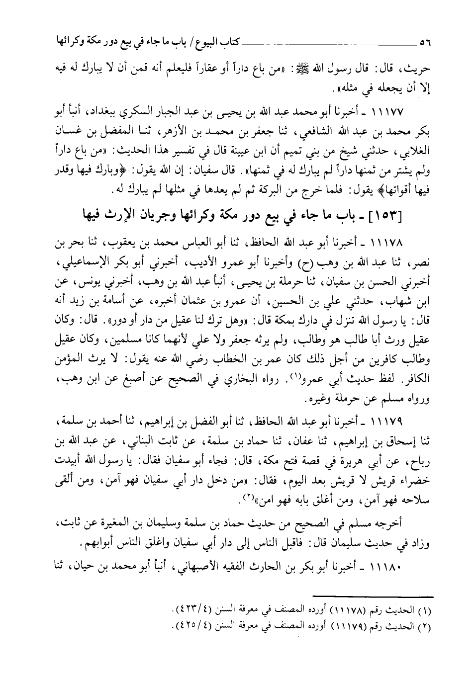 11178 - أَخْبَرَنَا أَبُو عَبْدِ اللهِ الْحَافِظُ، ثنا أَبُو الْعَبَّاسِ مُحَمَّدُ بْنُ يَعْقُوبَ، ثنا بَحْرُ بْنُ نَصْرٍ، ثنا عَبْدُ اللهِ بْنُ وَهْبٍ، ح وَأَخْبَرَنَا أَبُو عَمْرٍو الْأَدِيبُ، أَخْبَرَنِي أَبُو بَكْرٍ الْإِسْمَاعِيلِيُّ، أَخْبَرَنِي الْحَسَنُ بْنُ سُفْيَانَ، ثنا حَرْمَلَةُ بْنُ يَحْيَى، أنبأ عَبْدُ اللهِ بْنُ وَهْبٍ، أَخْبَرَنِي يُونُسُ، عَنِ ابْنِ شِهَابٍ، حَدَّثَنِي عَلِيُّ بْنُ الْحُسَيْنِ، أَنَّ عَمْرَو بْنَ عُثْمَانَ أَخْبَرَهُ , عَنْ أُسَامَةَ بْنِ زَيْدٍ أَنَّهُ قَالَ: يَا رَسُولَ اللهِ، تَنْزِلُ فِي دَارِكَ بِمَكَّةَ، قَالَ: §" وَهَلْ تَرَكَ لَنَا عَقِيلٌ مِنْ دَارٍ أَوْ دُورٍ؟ " قَالَ: وَكَانَ عَقِيلٌ وَرِثَ أَبَا طَالِبٍ هُوَ وَطَالِبٌ، وَلَمْ يَرِثْهُ جَعْفَرٌ وَلَا عَلِيٌّ؛ لِأَنَّهُمَا كَانَا مُسْلِمَيْنِ، وَكَانَ عَقِيلٌ وَطَالِبٌ كَافِرَيْنِ، مِنْ أَجْلِ ذَلِكَ كَانَ عُمَرُ بْنُ الْخَطَّابِ رَضِيَ اللهُ عَنْهُ يَقُولُ: لَا يَرِثُ الْمُؤْمِنُ الْكَافِرَ لَفْظُ حَدِيثِ أَبِي عَمْرٍو، رَوَاهُ الْبُخَارِيُّ فِي الصَّحِيحِ عَنْ أَصْبَغَ، عَنِ ابْنِ وَهْبٍ، وَرَوَاهُ مُسْلِمٌ عَنْ حَرْمَلَةَ وَغَيْرِهِ