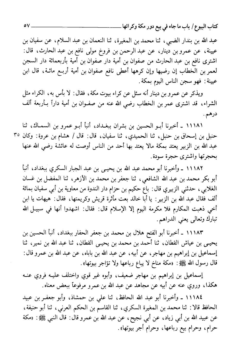 11184 - وَأَخْبَرَنَا أَبُو عَبْدِ اللهِ الْحَافِظُ، ثنا عَلِيُّ بْنُ حَمْشَاذٍ، وَأَبُو جَعْفَرِ بْنُ عُبَيْدٍ الْحَافِظُ، قَالَا: ثنا مُحَمَّدُ بْنُ الْمُغِيرَةِ السُّكَّرِيُّ، ثنا الْقَاسِمُ بْنُ الْحَكَمِ الْعُرَنِيُّ، ثنا أَبُو حَنِيفَةَ، عَنْ عُبَيْدِ اللهِ بْنِ أَبِي زِيَادٍ، عَنْ أَبِي نَجِيحٍ، عَنْ عَبْدِ اللهِ بْنِ عَمْرٍو قَالَ: قَالَ النَّبِيُّ صَلَّى اللهُ عَلَيْهِ وَسَلَّمَ: " §مَكَّةُ حَرَامٌ، وَحَرَامٌ بَيْعُ رِبَاعِهَا، وَحَرَامٌ أَجْرُ بُيُوتِهَا " -[58]- كَذَا رُوِيَ مَرْفُوعًا، وَرَفْعُهُ وَهْمٌ، وَالصَّحِيحُ أَنَّهُ مَوْقُوفٌ، قَالَهُ لِي أَبُو عَبْدِ الرَّحْمَنِ السُّلَمِيُّ عَنْ أَبِي الْحَسَنِ الدَّارَقُطْنِيِّ