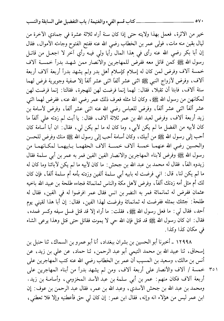 12998 - أَخْبَرَنَا أَبُو الْحُسَيْنِ بْنُ بِشْرَانَ بِبَغْدَادَ، أنا أَبُو عَمْرِو بْنُ السَّمَّاكِ , ثنا حَنْبَلُ بْنُ إِسْحَاقَ , ثنا عُبَيْدُ اللهِ بْنُ مُحَمَّدٍ التَّيْمِيُّ أَبُو عَبْدِ الرَّحْمَنِ , ثنا حَمَّادٌ , عَنْ عَلِيِّ بْنِ زَيْدٍ , عَنْ أَنَسِ بْنِ مَالِكٍ , وَسَعِيدِ بْنِ الْمُسَيِّبِ , أَنَّ عُمَرَ بْنَ الْخَطَّابِ رَضِيَ اللهُ عَنْهُ " §كَتَبَ الْمُهَاجِرِينَ عَلَى خَمْسَةِ آلَافٍ وَالْأَنْصَارَ عَلَى أَرْبَعَةِ آلَافٍ، وَمَنْ لَمْ يَشْهَدْ بَدْرًا مِنْ أَبْنَاءِ الْمُهَاجِرِينَ عَلَى أَرْبَعَةِ آلَافٍ، فَكَانَ مِنْهُمْ عُمَرُ بْنُ أَبِي سَلَمَةَ بْنِ عَبْدِ الْأَسَدِ الْمَخْزُومِيُّ , وَأُسَامَةُ بْنُ زَيْدٍ , وَمُحَمَّدُ بْنُ عَبْدِ اللهِ بْنِ جَحْشٍ الْأَسَدِيُّ , وَعَبْدُ اللهِ بْنُ عُمَرَ , فَقَالَ عَبْدُ الرَّحْمَنِ بْنُ عَوْفٍ: إِنَّ ابْنَ عُمَرَ لَيْسَ مِنْ هَؤُلَاءِ؛ إِنَّهُ وَإِنَّهُ , فَقَالَ ابْنُ عُمَرَ: إِنْ كَانَ لِي حَقٌّ فَأَعْطِنِيهِ، وَإِلَّا فَلَا تُعْطِنِي , -[571]- فَقَالَ عُمَرُ لِابْنِ عَوْفٍ: " اكْتُبْهُ عَلَى خَمْسَةِ آلَافٍ، وَاكْتُبْنِي عَلَى أَرْبَعَةِ آلَافٍ " , فَقَالَ عَبْدُ اللهِ: لَا أُرِيدُ هَذَا , فَقَالَ عُمَرُ: " وَاللهِ لَا أَجْتَمِعُ أَنَا وَأَنْتَ عَلَى خَمْسَةِ آلَافٍ " وَكَذَلِكَ رَوَاهُ عَفَّانُ عَنْ حَمَّادِ بْنِ سَلَمَةَ