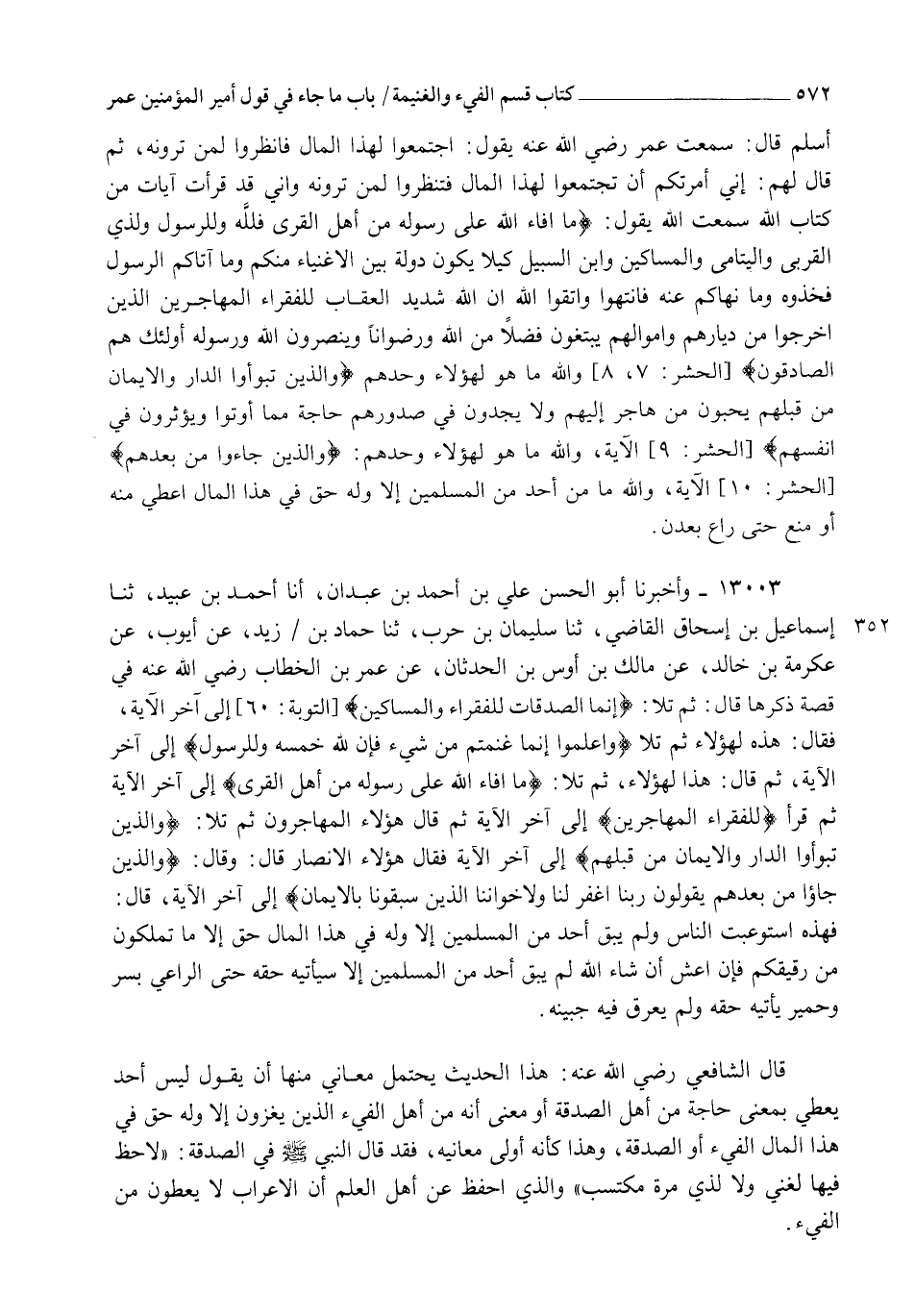 13003 - وَأَخْبَرَنَا أَبُو الْحَسَنِ عَلِيُّ بْنُ أَحْمَدَ بْنِ عَبْدَانَ , أنا أَحْمَدُ بْنُ عُبَيْدٍ , ثنا إِسْمَاعِيلُ بْنُ إِسْحَاقَ الْقَاضِي , ثنا سُلَيْمَانُ بْنُ حَرْبٍ , ثنا حَمَّادُ بْنُ زَيْدٍ , عَنْ أَيُّوبَ , عَنْ عِكْرِمَةَ بْنِ خَالِدٍ , عَنْ مَالِكِ بْنِ أَوْسِ بْنِ الْحَدَثَانِ , عَنْ عُمَرَ بْنِ الْخَطَّابِ رَضِيَ اللهُ عَنْهُ فِي قِصَّةٍ ذَكَرَهَا، قَالَ: " ثُمَّ تَلَا {§إِنَّمَا الصَّدَقَاتُ لِلْفُقَرَاءِ وَالْمَسَاكِينِ} [التوبة: 60] إِلَى آخِرِ الْآيَةِ "، فَقَالَ: " هَذِهِ لِهَؤُلَاءِ، ثُمَّ تَلَا {وَاعْلَمُوا أَنَّمَا غَنِمْتُمْ مِنْ شَيْءٍ فَأَنَّ لِلَّهِ خُمُسَهُ وَلِلرَّسُولِ} [الأنفال: 41] إِلَى آخِرِ الْآيَةِ " , ثُمَّ قَالَ: " هَذَا لِهَؤُلَاءِ، ثُمَّ تَلَا {مَا أَفَاءَ اللهُ عَلَى رَسُولِهِ مِنْ أَهْلِ الْقُرَى} [الحشر: 7] إِلَى آخِرِ الْآيَةِ " , " ثُمَّ قَرَأَ {لِلْفُقَرَاءِ الْمُهَاجِرِينَ} [الحشر: 8] إِلَى آخِرِ الْآيَةِ " , ثُمَّ قَالَ: " هَؤُلَاءِ الْمُهَاجِرُونَ , ثُمَّ تَلَا {وَالَّذِينَ تَبَوَّءُوا الدَّارَ وَالْإِيمَانَ مِنْ قَبْلِهِمْ} إِلَى آخِرِ الْآيَةِ " , فَقَالَ: " هَؤُلَاءِ الْأَنْصَارُ، قَالَ: وَقَرَأَ {وَالَّذِينَ جَاءُوا مِنْ بَعْدِهِمْ يَقُولُونَ رَبَّنَا اغْفِرْ لَنَا وَلِإِخْوَانِنَا الَّذِينَ سَبَقُونَا بِالْإِيمَانِ} إِلَى آخِرِ الْآيَةِ، قَالَ: " فَهَذِهِ اسْتَوْعَبَتِ النَّاسَ، وَلَمْ يَبْقَ أَحَدٌ مِنَ الْمُسْلِمِينَ إِلَّا وَلَهُ فِي هَذَا الْمَالِ حَقٌّ، إِلَّا مَا تَمْلِكُونَ مِنْ رَقِيقِكُمْ، فَإِنْ أَعِشْ إِنْ شَاءَ اللهُ لَمْ يَبْقَ أَحَدٌ مِنَ الْمُسْلِمِينَ إِلَّا سَيَأْتِيهِ حَقُّهُ حَتَّى الرَّاعِي بِسُرَّ وَحِمْيَرَ يَأْتِيهِ حَقُّهُ، وَلَمْ يَعْرَقْ فِيهِ جَبِينُهُ " قَالَ الشَّافِعِيُّ رَضِيَ اللهُ عَنْهُ: هَذَا الْحَدِيثُ يَحْتَمِلُ مَعَانِيَ، مِنْهَا أَنْ يَقُولَ: لَيْسَ أَحَدٌ يُعْطِي، بِمَعْنَى حَاجَةٍ مِنْ أَهْلِ الصَّدَقَةِ , أَوْ مَعْنَى أَنَّهُ مِنْ أَهْلِ الْفَيْءِ الَّذِينَ يَغْزُونَ، إِلَّا وَلَهُ حَقٌّ فِي هَذَا الْمَالِ؛ الْفَيْءِ أَوِ الصَّدَقَةِ , وَهَذَا كَأَنَّهُ أَوْلَى مَعَانِيهِ؛ فَقَدْ قَالَ النَّبِيُّ صَلَّى اللهُ عَلَيْهِ وَسَلَّمَ فِي الصَّدَقَةِ: " لَا حَظَّ فِيهَا لِغَنِيٍّ وَلَا لِذِي مَرَّةٍ مُكْتَسِبٍ "، وَالَّذِي أَحْفَظُ عَنْ أَهْلِ الْعِلْمِ أَنَّ الْأَعْرَابَ لَا يُعْطَوْنَ مِنَ الْفَيْءِ. -[573]- قَالَ الشَّيْخُ: قَدْ مَضَى هَذَا فِي حَدِيثِ بُرَيْدَةَ عَنِ النَّبِيِّ صَلَّى اللهُ عَلَيْهِ وَسَلَّمَ، وَقَدْ حَكَى أَبُو عَبْدِ الرَّحْمَنِ الشَّافِعِيُّ عَنِ الشَّافِعِيِّ أَنَّهُ قَالَ فِي كِتَابِ السِّيَرِ الْقَدِيمِ مَعْنَى هَذَا , ثُمَّ اسْتَثْنَى فَقَالَ: إِلَّا أَنْ لَا يُصَابَ أَحَدُ الْمَالَيْنِ , وَيُصَابَ الْآخَرُ بِالصِّنْفَيْنِ إِلَيْهِ حَاجَةٌ فَيُشْرِكُ بَيْنَهُمْ فِيهِ، قَالَ: وَقَدْ أَعَانَ أَبُو بَكْرٍ رَضِيَ اللهُ عَنْهُ خَالِدَ بْنَ الْوَلِيدِ رَضِيَ اللهُ عَنْهُ فِي خُرُوجِهِ إِلَى أَهْلِ الرِّدَّةِ بِمَالٍ أَتَى بِهِ عَدِيُّ بْنُ حَاتِمٍ مِنْ صَدَقَةِ قَوْمِهِ، فَلَمْ يُنْكَرْ عَلَيْهِ ذَلِكَ؛ إِذْ كَانَتْ بِالْقَوْمِ إِلَيْهِ حَاجَةٌ، وَالْفَيْءُ مِثْلُ ذَلِكَ