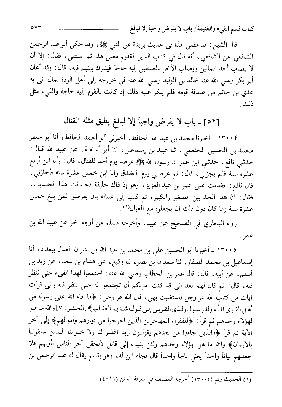13004 - أَخْبَرَنَا مُحَمَّدُ بْنُ عَبْدِ اللهِ الْحَافِظُ , أَخْبَرَنِي أَبُو أَحْمَدَ الْحَافِظُ , أنا أَبُو جَعْفَرٍ مُحَمَّدُ بْنُ الْحُسَيْنِ الْخَثْعَمِيُّ , ثنا عُبَيْدُ بْنُ إِسْمَاعِيلَ , ثنا أَبُو أُسَامَةَ , عَنْ عُبَيْدِ اللهِ قَالَ: حَدَّثَنِي نَافِعٌ، قَالَ: حَدَّثَنِي ابْنُ عُمَرَ , أَنَّ رَسُولَ اللهِ صَلَّى اللهُ عَلَيْهِ وَسَلَّمَ " عَرَضَهُ يَوْمَ أُحُدٍ لِلْقِتَالِ، قَالَ: وَأَنَا ابْنُ أَرْبَعَ عَشْرَةَ سَنَةً، §فَلَمْ يُجِزْنِي، قَالَ: ثُمَّ عَرَضَنِي يَوْمَ الْخَنْدَقِ وَأَنَا ابْنُ خَمْسَ عَشْرَةَ سَنَةً، فَأَجَازَنِي " قَالَ نَافِعٌ: فَقَدِمْتُ عَلَى عُمَرَ بْنِ عَبْدِ الْعَزِيزِ وَهُوَ إِذْ ذَاكَ خَلِيفَةٌ، فَحَدَّثْتُ هَذَا الْحَدِيثَ، فَقَالَ: إِنَّ هَذَا الْحَدَّ بَيْنَ الصَّغِيرِ وَالْكَبِيرِ. ثُمَّ كَتَبَ إِلَى عُمَّالِهِ بِأَنْ يَفْرِضُوا لِمَنْ بَلَغَ خَمْسَ عَشْرَةَ سَنَةً، وَمَا كَانَ دُونَ ذَلِكَ أَنْ يَجْعَلُوهُ مَعَ الْعِيَالِ. رَوَاهُ الْبُخَارِيُّ فِي الصَّحِيحِ عَنْ عُبَيْدٍ , وَأَخْرَجَهُ مُسْلِمٌ مِنْ أَوْجُهٍ أُخَرَ عَنْ عُبَيْدِ اللهِ بْنِ عُمَرَ