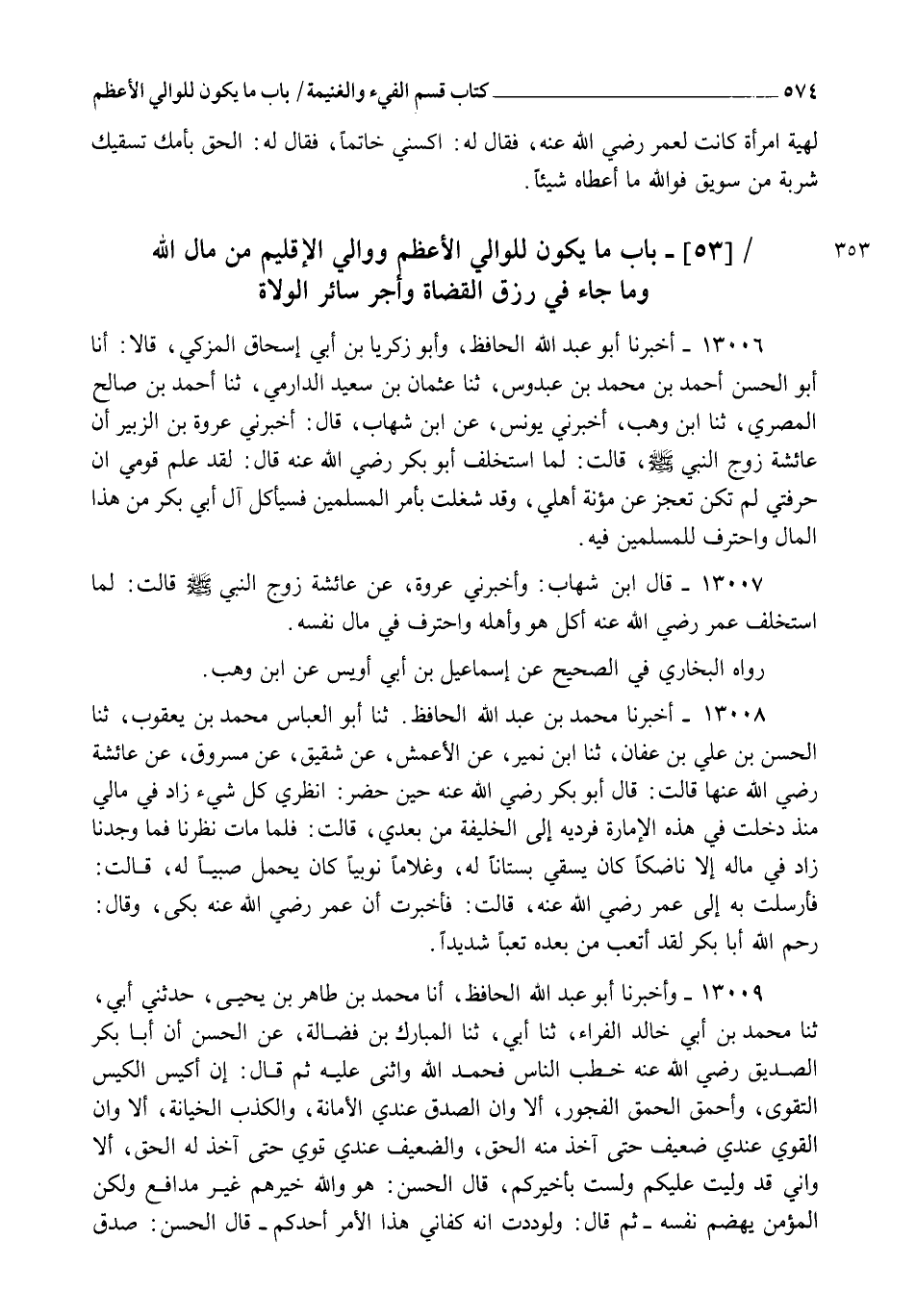 13006 - أَخْبَرَنَا أَبُو عَبْدِ اللهِ الْحَافِظُ , وَأَبُو زَكَرِيَّا بْنُ أَبِي إِسْحَاقَ الْمُزَكِّي، قَالَا: أنا أَبُو الْحَسَنِ أَحْمَدُ بْنُ مُحَمَّدِ بْنِ عُبْدُوسٍ , ثنا عُثْمَانُ بْنُ سَعِيدٍ الدَّارِمِيُّ , ثنا أَحْمَدُ بْنُ صَالِحٍ الْمِصْرِيُّ , ثنا ابْنُ وَهْبٍ , أَخْبَرَنِي يُونُسُ , عَنِ ابْنِ شِهَابٍ قَالَ: أَخْبَرَنِي عُرْوَةُ بْنُ الزُّبَيْرِ , أَنَّ عَائِشَةَ زَوْجَ النَّبِيِّ صَلَّى اللهُ عَلَيْهِ وَسَلَّمَ قَالَتْ: لَمَّا اسْتُخْلِفَ أَبُو بَكْرٍ رَضِيَ اللهُ عَنْهُ قَالَ: §" لَقَدْ عَلِمَ قَوْمِي أَنَّ حِرْفَتِي لَمْ تَكُنْ تَعْجِزُ عَنْ مُؤْنَةِ أَهْلِي، وَقَدْ شُغِلْتُ بِأَمْرِ الْمُسْلِمِينَ، فَسَيَأْكُلُ آلُ أَبِي بَكْرٍ مِنْ هَذَا الْمَالِ، وَأَحْتَرِفُ لِلْمُسْلِمِينَ فِيهِ "