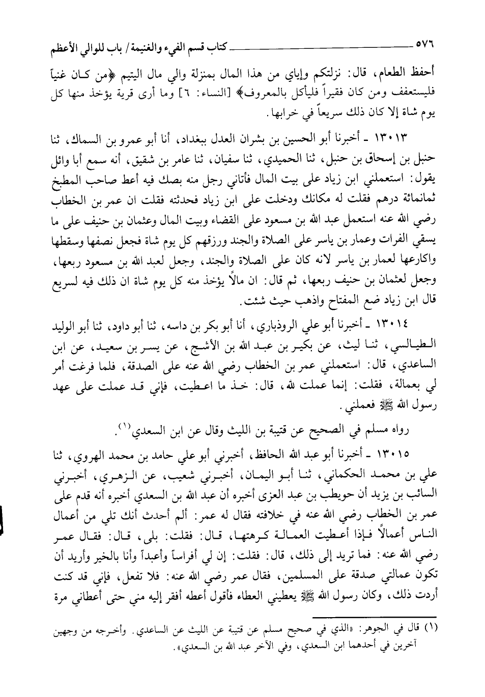 13015 - أَخْبَرَنَا أَبُو عَبْدِ اللهِ الْحَافِظُ , أَخْبَرَنِي أَبُو عَلِيٍّ حَامِدُ بْنُ مُحَمَّدٍ الْهَرَوِيُّ، ثنا عَلِيُّ بْنُ مُحَمَّدٍ الْحَكَّانِيُّ , ثنا أَبُو الْيَمَانِ , أَخْبَرَنِي شُعَيْبٌ , عَنِ الزُّهْرِيِّ , أَخْبَرَنِي السَّائِبُ بْنُ يَزِيدَ , أَنَّ حُوَيْطِبَ بْنَ عَبْدِ الْعُزَّى أَخْبَرَهُ، أَنَّ عَبْدَ اللهِ بْنَ السَّعْدِيِّ أَخْبَرَهُ، أَنَّهُ قَدِمَ عَلَى عُمَرَ بْنِ الْخَطَّابِ رَضِيَ اللهُ عَنْهُ فِي خِلَافَتِهِ، فَقَالَ لَهُ عُمَرُ: أَلَمْ أُحَدَّثْ أَنَّكَ تَلِي مِنْ أَعْمَالِ النَّاسِ أَعْمَالًا، فَإِذَا أُعْطِيتَ الْعُمَالَةَ كَرِهْتَهَا؟ قَالَ: فَقُلْتُ: بَلَى، قَالَ: فَقَالَ عُمَرُ رَضِيَ اللهُ عَنْهُ: فَمَا تُرِيدُ إِلَى ذَلِكَ؟ قَالَ: فَقُلْتُ: إِنَّ لِي أَفْرَاسًا وَأَعْبُدًا وَأَنَا بِالْخَيْرِ، وَأُرِيدُ أَنْ تَكُونَ عُمَالَتِي صَدَقَةً عَلَى الْمُسْلِمِينَ، فَقَالَ عُمَرُ رَضِيَ اللهُ عَنْهُ: فَلَا تَفْعَلْ؛ فَإِنِّي قَدْ كُنْتُ أَرَدْتُ ذَلِكَ، وَكَانَ رَسُولُ اللهِ صَلَّى اللهُ عَلَيْهِ وَسَلَّمَ يُعْطِينِي الْعَطَاءَ فَأَقُولُ: أَعْطِهِ أَفْقَرَ إِلَيْهِ مِنِّي , حَتَّى أَعْطَانِي مَرَّةً -[577]- مَالًا، فَقُلْتُ: أَعْطِهِ أَفْقَرَ إِلَيْهِ مِنِّي، فَقَالَ رَسُولُ اللهِ صَلَّى اللهُ عَلَيْهِ وَسَلَّمَ: " §خُذْهُ فَتَمَوَّلْهُ أَوْ تَصَدَّقْ بِهِ، وَمَا جَاءَكَ مِنْ هَذَا الْمَالِ وَأَنْتَ غَيْرُ مُشْرِفٍ وَلَا سَائِلٍ فَخُذْهُ , وَمَا لَا فَلَا تُتْبِعْهُ نَفْسَكَ " رَوَاهُ الْبُخَارِيُّ فِي الصَّحِيحِ عَنْ أَبِي الْيَمَانِ , وَأَخْرَجَهُ مُسْلِمٌ مِنْ حَدِيثِ عَمْرِو بْنِ الْحَارِثِ عَنِ ابْنِ شِهَابٍ
