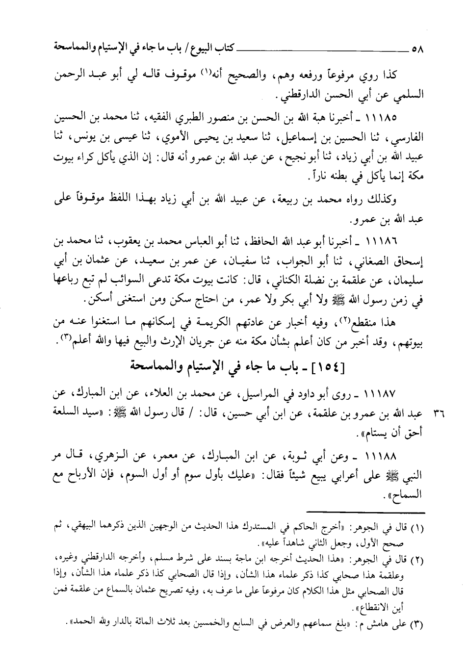 11186 - أَخْبَرَنَا أَبُو عَبْدِ اللهِ الْحَافِظُ، ثنا أَبُو الْعَبَّاسِ مُحَمَّدُ بْنُ يَعْقُوبَ، ثنا مُحَمَّدُ بْنُ إِسْحَاقَ الصَّغَانِيُّ، ثنا أَبُو الْجَوَّابِ، ثنا سُفْيَانُ، عَنْ عُمَرَ بْنِ سَعِيدٍ، عَنْ عُثْمَانَ بْنِ أَبِي سُلَيْمَانَ، عَنْ عَلْقَمَةَ بْنِ نَضْلَةَ الْكِنَانِيِّ قَالَ: " كَانَتْ §بُيُوتُ مَكَّةَ تُدْعَى السَّوَائِبَ، لَمْ تُبَعْ رِبَاعُهَا فِي زَمَنِ رَسُولِ اللهِ صَلَّى اللهُ عَلَيْهِ وَسَلَّمَ، وَلَا أَبِي بَكْرٍ، وَلَا عُمَرَ، مَنِ احْتَاجَ سَكَنَ، وَمَنِ اسْتَغْنَى أَسْكَنَ " هَذَا مُنْقَطِعٌ، وَفِيهِ أَخْبَارٌ عَنْ عَادَتِهِمُ الْكَرِيمَةِ فِي إسْكَانِهِمْ مَا اسْتَغْنَوْا عَنْهُ مِنْ بُيُوتِهِمْ، وَقَدْ أَخْبَرَ مَنْ كَانَ أَعْلَمَ بِشَأْنِ مَكَّةَ مِنْهُ عَنْ جَرَيَانِ الْإِرْثِ وَالْبَيْعِ فِيهَا، وَاللهُ أَعْلَمُ