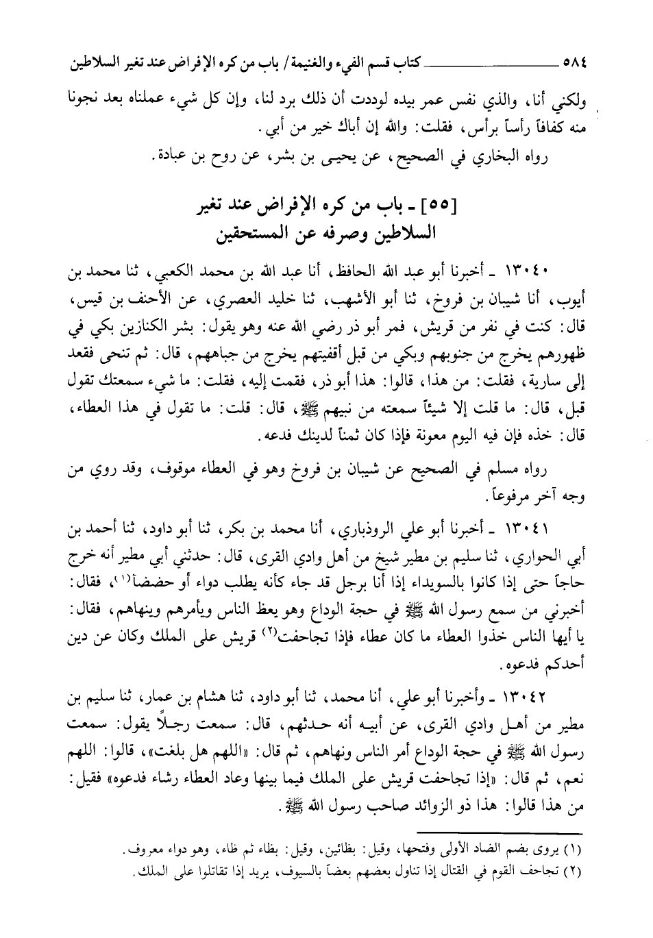 13040 - أَخْبَرَنَا أَبُو عَبْدِ اللهِ الْحَافِظُ , أنا عَبْدُ اللهِ بْنُ مُحَمَّدٍ الْكَعْبِيُّ , ثنا مُحَمَّدُ بْنُ أَيُّوبَ , أنا شَيْبَانُ بْنُ فَرُّوخَ , ثنا أَبُو الْأَشْهَبِ , ثنا خُلَيْدٌ الْعَصَرِيُّ , عَنِ الْأَحْنَفِ بْنِ قَيْسٍ قَالَ: كُنْتُ فِي نَفَرٍ مِنْ قُرَيْشٍ، فَمَرَّ أَبُو ذَرٍّ رَضِيَ اللهُ عَنْهُ وَهُوَ يَقُولُ: §" بَشِّرِ الْكَنَّازِينَ بِكَيٍّ فِي ظُهُورِهِمْ يَخْرُجُ مِنْ جُنُوبِهِمْ , وَبِكَيٍّ مِنْ قِبَلِ أَقْفِيَتِهِمْ يَخْرُجُ مِنْ جِبَاهِهِمْ " قَالَ: ثُمَّ تَنَحَّى فَقَعَدَ إِلَى سَارِيَةٍ، فَقُلْتُ: مَنْ هَذَا؟ قَالُوا: هَذَا أَبُو ذَرٍّ، فَقُمْتُ إِلَيْهِ فَقُلْتُ: مَا شَيْءٌ سَمِعْتُكَ تَقُولُ قَبْلُ؟ قَالَ: مَا قُلْتُ إِلَّا شَيْئًا سَمِعْتُهُ مِنْ نَبِيِّهِمْ صَلَّى اللهُ عَلَيْهِ وَسَلَّمَ، قَالَ: قُلْتُ: مَا تَقُولُ فِي هَذَا الْعَطَاءِ؟ قَالَ: " خُذْهُ؛ فَإِنَّ فِيهِ الْيَوْمَ مَعُونَةً، فَإِذَا كَانَ ثَمَنًا لِدِينِكَ فَدَعْهُ " رَوَاهُ مُسْلِمٌ فِي الصَّحِيحِ عَنْ شَيْبَانَ بْنِ فَرُّوخَ، وَهُوَ فِي الْعَطَاءِ مَوْقُوفٌ، وَقَدْ رُوِيَ مِنْ وَجْهٍ آخَرَ مَرْفُوعًا