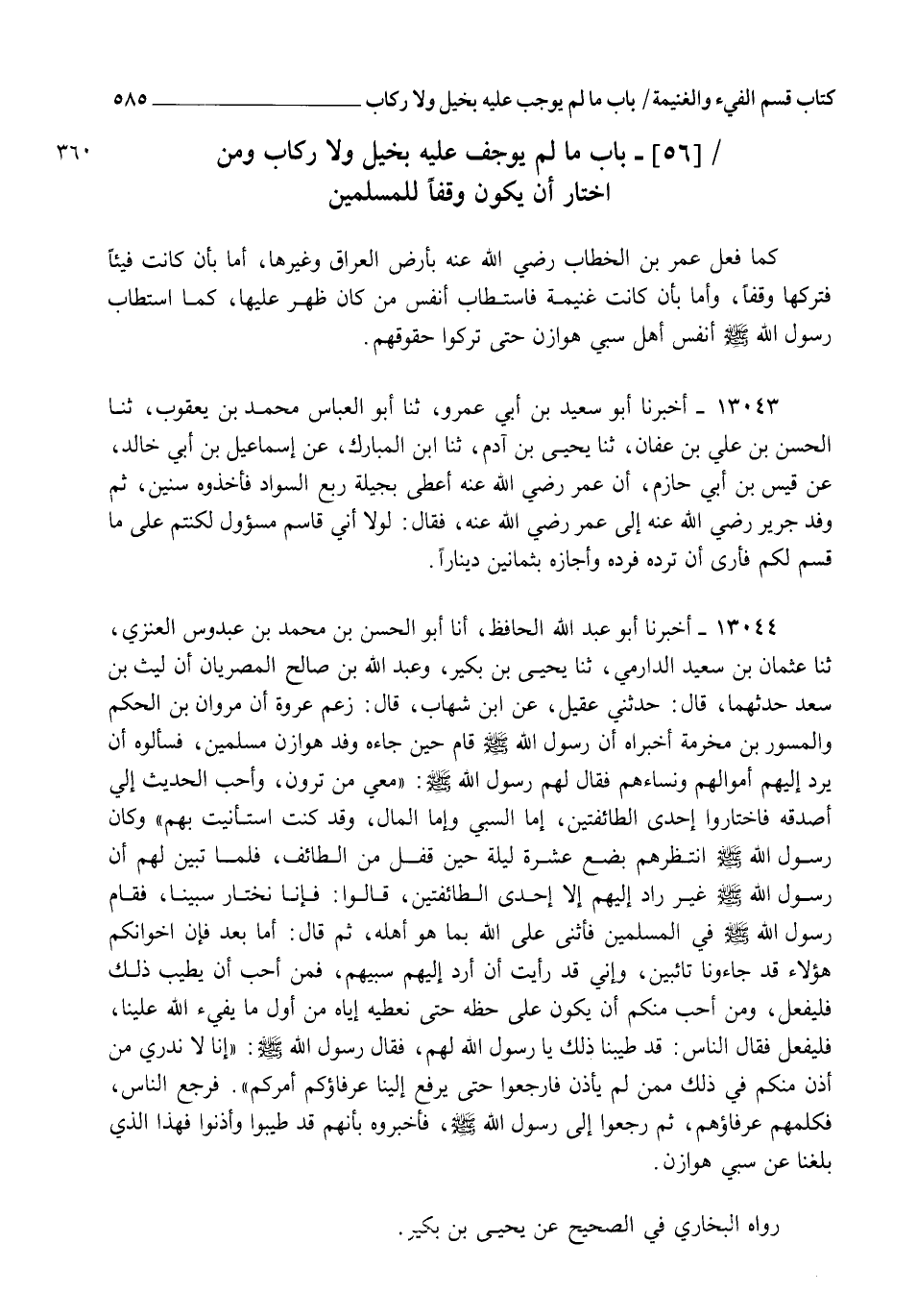 §بَابُ مَا لَمْ يُوجَفْ عَلَيْهِ بِخَيْلٍ وَلَا رِكَابٍ، وَمَنِ اخْتَارَ أَنْ يَكُونَ وَقْفًا لِلْمُسْلِمِينَ كَمَا فَعَلَ عُمَرُ بْنُ الْخَطَّابِ رَضِيَ اللهُ عَنْهُ بِأَرْضِ الْعِرَاقِ وَغَيْرِهَا، إِمَّا بِأَنْ كَانَتْ فَيْئًا فَتَرَكَهَا وَقْفًا , وَإِمَّا بِأَنْ كَانَتْ غَنِيمَةً فَاسْتَطَابَ أَنْفُسَ مَنْ كَانَ ظَهَرَ عَلَيْهَا كَمَا اسْتَطَابَ رَسُولُ اللهِ صَلَّى اللهُ عَلَيْهِ وَسَلَّمَ أَنْفُسَ أَهْلِ سَبْيِ هَوْازِنَ حَتَّى تَرَكُوا حُقُوقَهُمْ