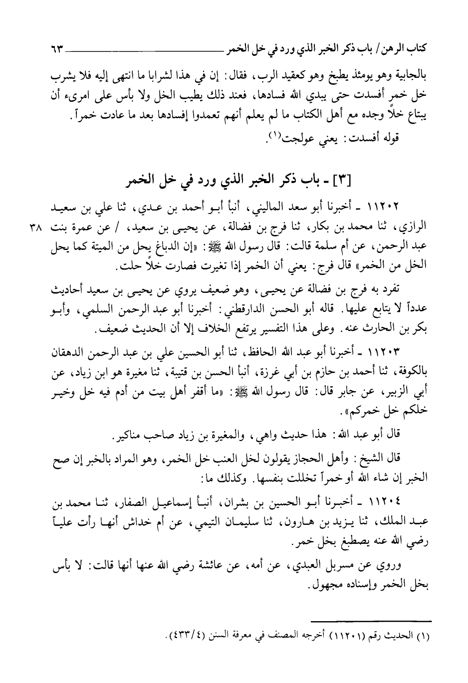 11203 - أَخْبَرَنَا أَبُو عَبْدِ اللهِ الْحَافِظُ، ثنا أَبُو الْحُسَيْنِ عَلِيُّ بْنُ عَبْدِ الرَّحْمَنِ الدِّهْقَانُ بِالْكُوفَةِ، ثنا أَحْمَدُ بْنُ حَازِمِ بْنِ أَبِي غَرَزَةَ، أنبأ الْحَسَنُ بْنُ قُتَيْبَةَ، ثنا مُغِيرَةُ هُوَ ابْنُ زِيَادٍ، عَنْ أَبِي الزُّبَيْرِ، عَنْ جَابِرٍ قَالَ: قَالَ رَسُولُ اللهِ صَلَّى اللهُ عَلَيْهِ وَسَلَّمَ: " §مَا أَقْفَرَ أَهْلُ بَيْتٍ مِنْ أُدْمٍ فِيهِ خَلٌّ، وَخَيْرُ خَلِّكُمْ خَلُّ خَمْرِكُمْ " قَالَ أَبُو عَبْدِ اللهِ: هَذَا حَدِيثٌ وَاهٍ وَالْمُغِيرَةُ بْنُ زِيَادٍ صَاحِبُ مَنَاكِيرَ قَالَ الشَّيْخُ: وَأَهْلُ الْحِجَازِ يَقُولُونَ لِخَلِّ الْعِنَبِ خَلُّ الْخَمْرِ، وَهُوَ الْمُرَادُ بِالْخَبَرِ إِنْ صَحَّ الْخَبَرُ إِنْ شَاءَ اللهُ، أَوْ خَمْرًا تَخَلَّلَتْ بِنَفْسِهَا، وَكَذَلِكَ مَا