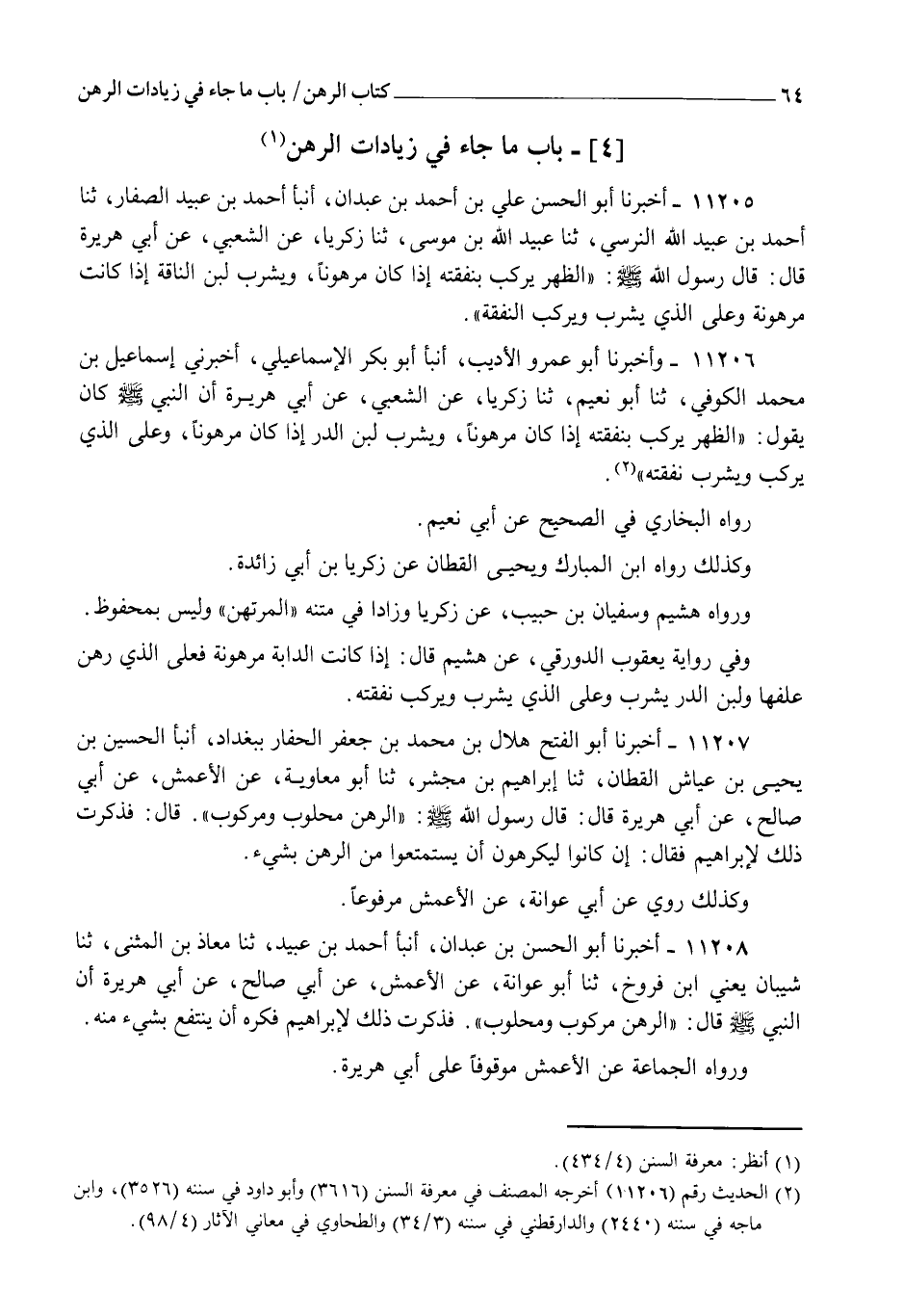 11208 - أَخْبَرَنَا أَبُو الْحَسَنِ بْنُ عَبْدَانَ، أنبأ أَحْمَدُ بْنُ عُبَيْدٍ، ثنا مُعَاذُ بْنُ الْمُثَنَّى، ثنا شَيْبَانُ يَعْنِي ابْنَ فَرُّوخَ، ثنا أَبُو عَوَانَةَ، عَنِ الْأَعْمَشِ، عَنْ أَبِي صَالِحٍ، عَنْ أَبِي هُرَيْرَةَ، أَنَّ النَّبِيَّ صَلَّى اللهُ عَلَيْهِ وَسَلَّمَ قَالَ: " §الرَّهْنُ مَرْكُوبٌ وَمَحْلُوبٌ " فَذَكَرْتُ ذَلِكَ لِإِبْرَاهِيمَ، فَكَرِهَ أَنْ يُنْتَفَعَ بِشَيْءٍ مِنْهُ. وَرَوَاهُ الْجَمَاعَةُ عَنِ الْأَعْمَشِ مَوْقُوفًا عَلَى أَبِي هُرَيْرَةَ
