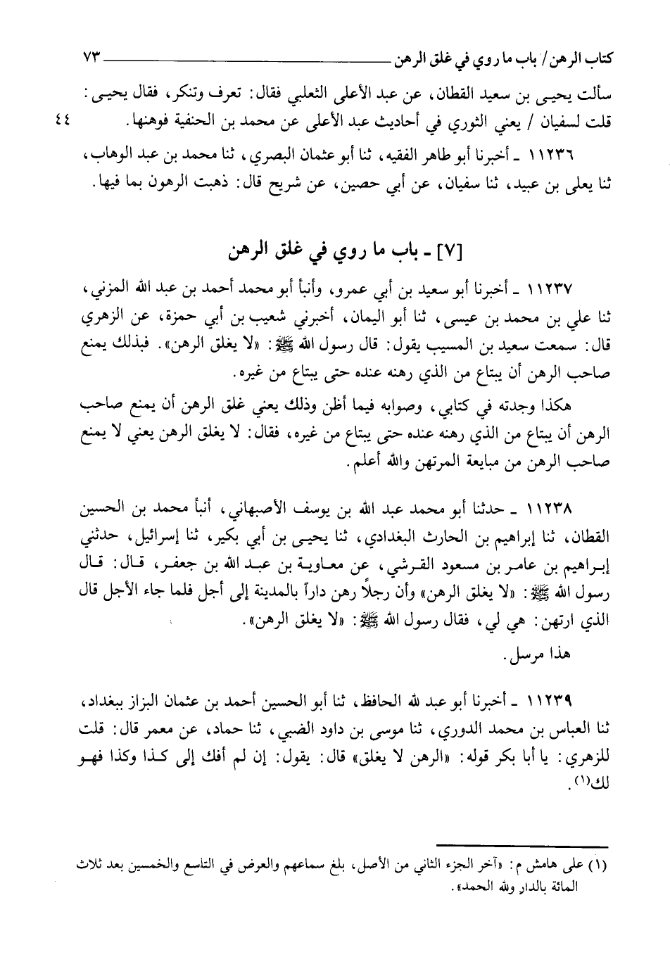 11238 - حَدَّثَنَا أَبُو مُحَمَّدٍ عَبْدُ اللهِ بْنُ يُوسُفَ الْأَصْبَهَانِيُّ، أنبأ مُحَمَّدُ بْنُ الْحُسَيْنِ الْقَطَّانُ، ثنا إِبْرَاهِيمُ بْنُ الْحَارِثِ الْبَغْدَادِيُّ، ثنا يَحْيَى بْنُ أَبِي بُكَيْرٍ، ثنا إِسْرَائِيلُ، حَدَّثَنِي إِبْرَاهِيمُ بْنُ عَامِرِ بْنِ مَسْعُودٍ الْقُرَشِيُّ، عَنْ مُعَاوِيَةَ بْنِ عَبْدِ اللهِ بْنِ جَعْفَرٍ قَالَ: قَالَ رَسُولُ اللهِ صَلَّى اللهُ عَلَيْهِ وَسَلَّمَ: §" لَا يُغْلَقُ الرَّهْنُ ". وَأَنَّ رَجُلًا رَهَنَ دَارًا بِالْمَدِينَةِ إِلَى أَجَلٍ، فَلَمَّا جَاءَ الْأَجَلُ قَالَ الَّذِي ارْتَهَنَ: هِيَ لِي، فَقَالَ رَسُولُ اللهِ صَلَّى اللهُ عَلَيْهِ وَسَلَّمَ: " لَا يُغْلَقُ الرَّهْنُ " هَذَا مُرْسَلٌ