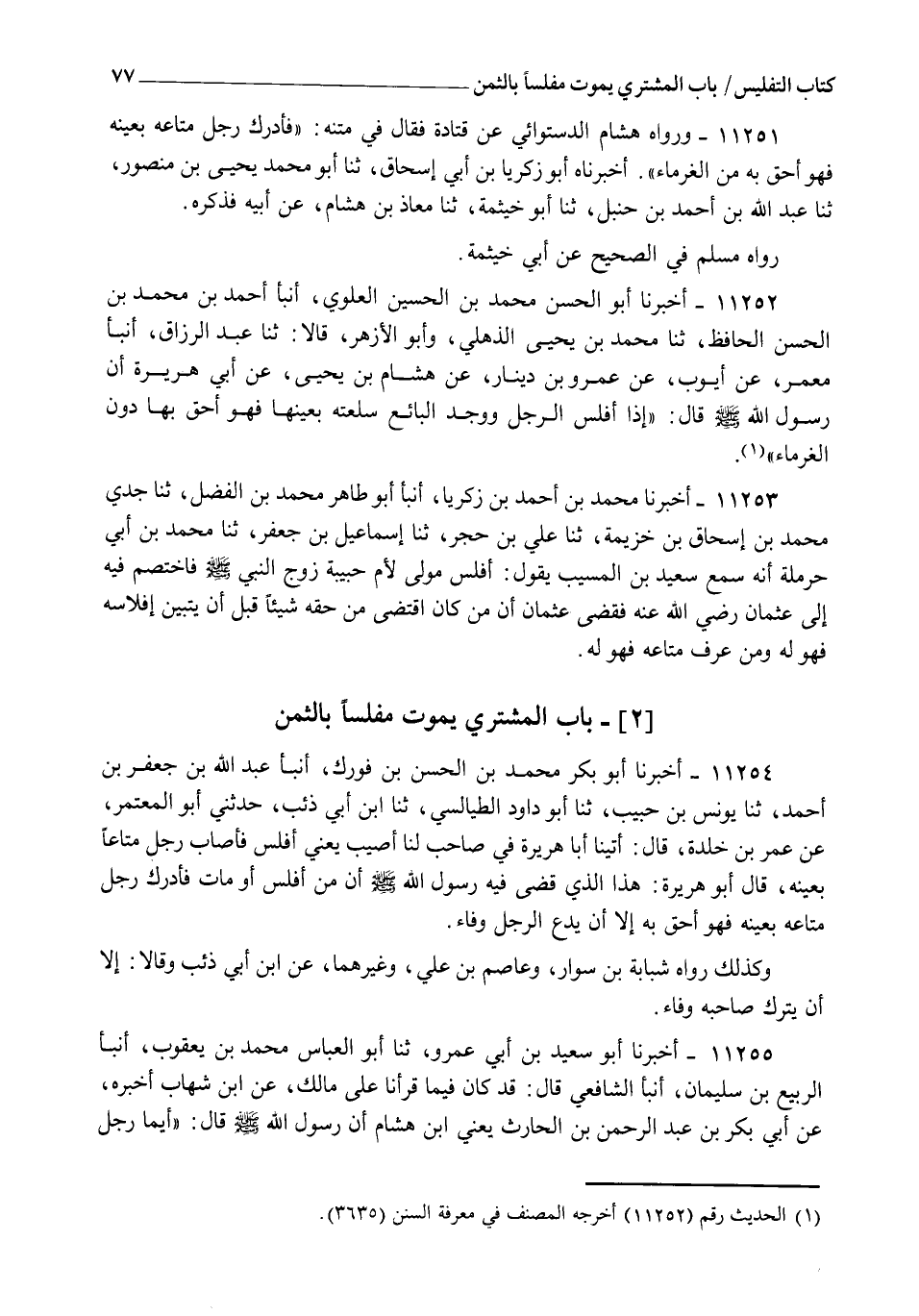 11253 - أَخْبَرَنَا مُحَمَّدُ بْنُ أَحْمَدَ بْنِ زَكَرِيَّا، أنبأ أَبُو طَاهِرٍ مُحَمَّدُ بْنُ الْفَضْلِ، ثنا جَدِّي مُحَمَّدُ بْنُ إِسْحَاقَ بْنِ خُزَيْمَةَ، ثنا عَلِيُّ بْنُ حُجْرٍ، ثنا إِسْمَاعِيلُ بْنُ جَعْفَرٍ، ثنا مُحَمَّدُ بْنُ أَبِي حَرْمَلَةَ، أَنَّهُ سَمِعَ سَعِيدَ بْنَ الْمُسَيِّبِ يَقُولُ: أَفْلَسَ مَوْلًى لِأُمِّ حَبِيبَةَ زَوْجِ النَّبِيِّ صَلَّى اللهُ عَلَيْهِ وَسَلَّمَ، فَاخْتُصِمَ فِيهِ إِلَى عُثْمَانَ رَضِيَ اللهُ عَنْهُ، فَقَضَى عُثْمَانُ " أَنَّ §مَنْ كَانَ اقْتَضَى مِنْ حَقِّهِ شَيْئًا قَبْلَ أَنْ يَتَبَيَّنَ إِفْلَاسُهُ فَهُوَ لَهُ، وَمَنْ عَرَفَ مَتَاعَهُ فَهُوَ لَهُ "