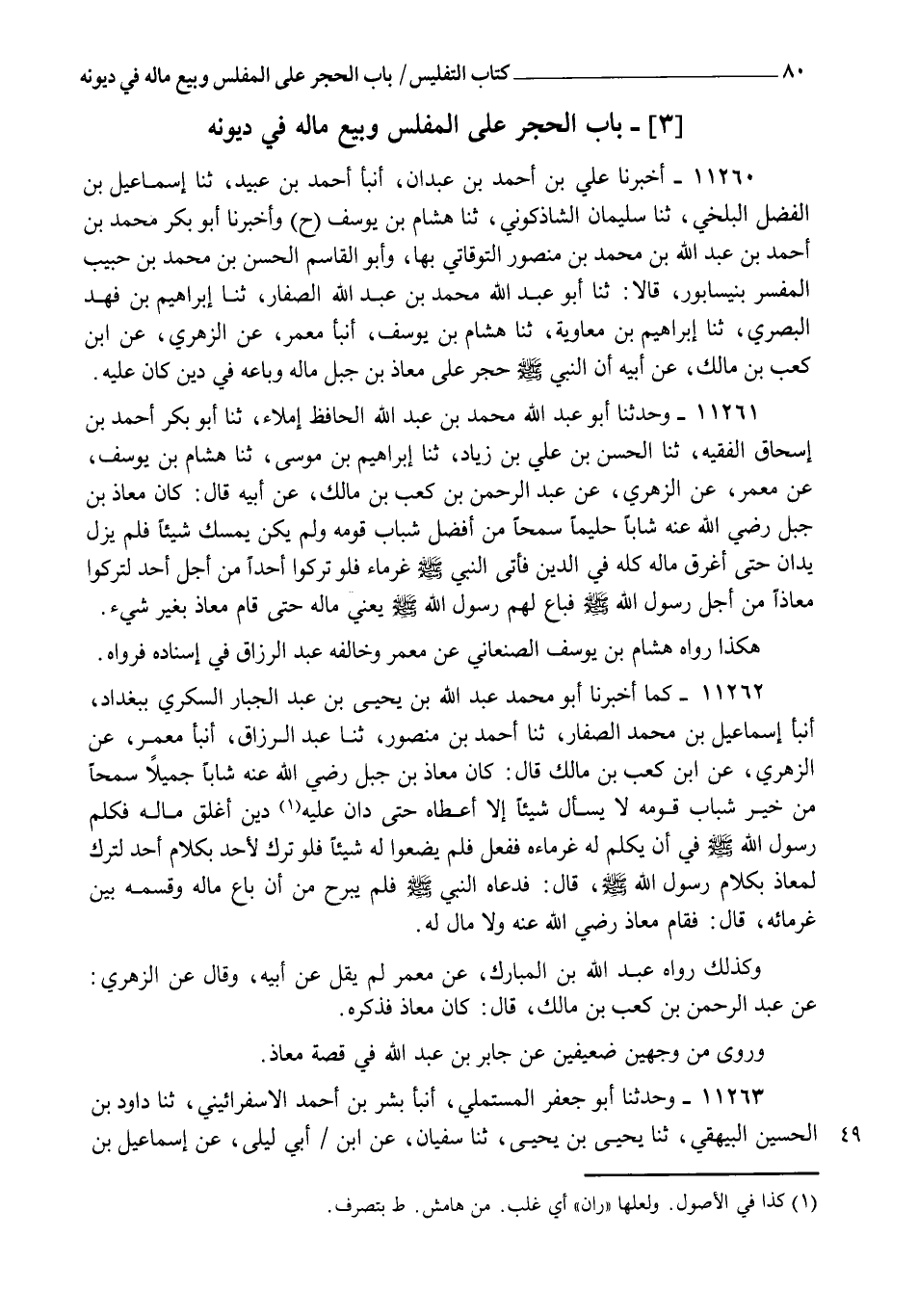 11260 - أَخْبَرَنَا عَلِيُّ بْنُ أَحْمَدَ بْنِ عَبْدَانَ، أنبأ أَحْمَدُ بْنُ عُبَيْدٍ، ثنا إِسْمَاعِيلُ بْنُ الْفَضْلِ الْبَلْخِيُّ، ثنا سُلَيْمَانُ الشَّاذَكُونِيُّ، ثنا هِشَامُ بْنُ يُوسُفَ، ح وَأَخْبَرَنَا أَبُو بَكْرٍ مُحَمَّدُ بْنُ أَحْمَدَ بْنِ عَبْدِ اللهِ بْنِ مُحَمَّدِ بْنِ مَنْصُورٍ التَّوقَاتِيُّ بِهَا وَأَبُو الْقَاسِمِ الْحَسَنُ بْنُ مُحَمَّدِ بْنِ حَبِيبٍ الْمُفَسِّرُ بِنَيْسَابُورَ، قَالَا: ثنا أَبُو عَبْدِ اللهِ مُحَمَّدُ بْنُ عَبْدِ اللهِ الصَّفَّارُ، ثنا إِبْرَاهِيمُ بْنُ فَهْدٍ الْبَصْرِيُّ، ثنا إِبْرَاهِيمُ بْنُ مُعَاوِيَةَ، ثنا هِشَامُ بْنُ يُوسُفَ، أنبأ مَعْمَرٌ، عَنِ الزُّهْرِيِّ، عَنِ ابْنِ كَعْبِ بْنِ مَالِكٍ، عَنْ أَبِيهِ، أَنَّ النَّبِيَّ صَلَّى اللهُ عَلَيْهِ وَسَلَّمَ " " §حَجَرَ عَلَى مُعَاذِ بْنِ جَبَلٍ مَالَهُ، وَبَاعَهُ فِي دَيْنٍ كَانَ عَلَيْهِ " "