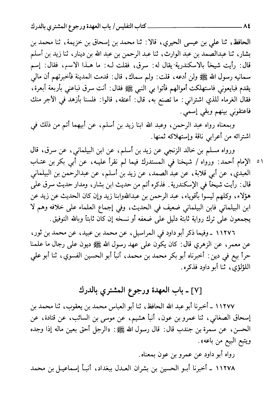 11278 - أَخْبَرَنَا أَبُو الْحُسَيْنِ بْنُ بِشْرَانَ الْعَدْلُ بِبَغْدَادَ , أنبأ إِسْمَاعِيلُ بْنُ مُحَمَّدٍ -[85]- الصَّفَّارُ، ثنا سَعْدَانُ بْنُ نَصْرٍ، ثنا أَبُو مُعَاوِيَةَ، ثنا الْحَجَّاجُ بْنُ أَرْطَاةَ، عَنْ سَعِيدِ بْنِ زَيْدِ بْنِ عُقْبَةَ، عَنْ أَبِيهِ، عَنْ سَمُرَةَ بْنِ جُنْدُبٍ قَالَ: قَالَ رَسُولُ اللهِ صَلَّى اللهُ عَلَيْهِ وَسَلَّمَ " §إِذَا ضَاعَ لِأَحَدِكُمْ مَتَاعٌ، أَوْ سُرِقَ لَهُ مَتَاعٌ، فَوَجَدَهُ فِي يَدِ رَجُلٍ بِعَيْنِهِ فَهُوَ أَحَقُّ بِهِ، وَيَرْجِعُ الْمُشْتَرِي عَلَى الْبَائِعِ بِالثَّمَنِ "