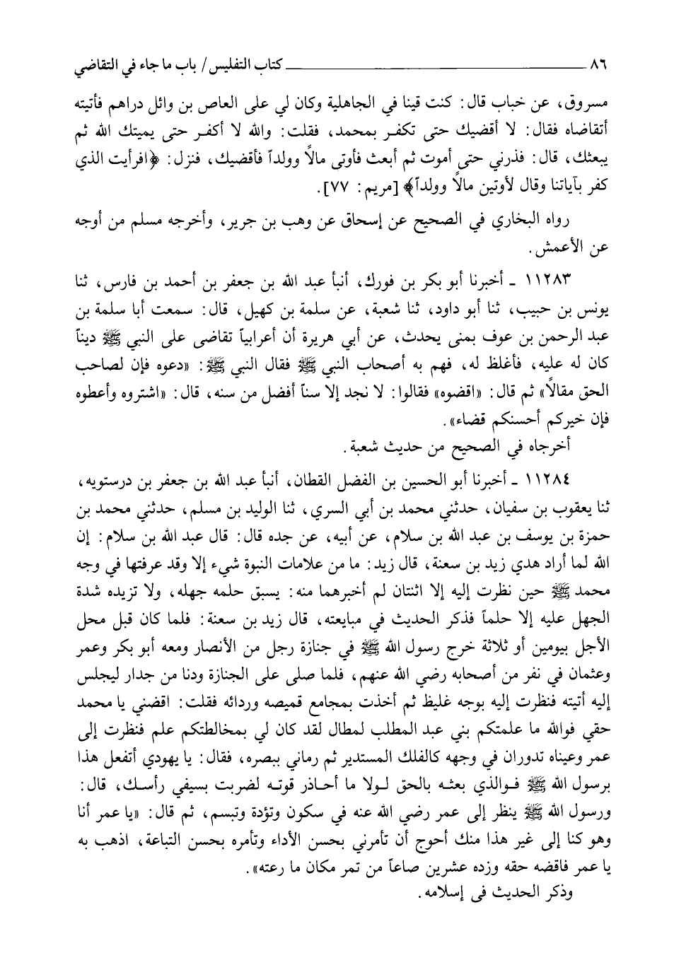 11284 - أَخْبَرَنَا أَبُو الْحُسَيْنِ بْنُ الْفَضْلِ الْقَطَّانُ، أنبأ عَبْدُ اللهِ بْنُ جَعْفَرِ بْنِ دَرَسْتَوَيْهِ، ثنا يَعْقُوبُ بْنُ سُفْيَانَ، حَدَّثَنِي مُحَمَّدُ بْنُ أَبِي السَّرِيِّ، ثنا الْوَلِيدُ بْنُ مُسْلِمٍ، حَدَّثَنِي مُحَمَّدُ بْنُ حَمْزَةَ بْنِ يُوسُفَ بْنِ عَبْدِ اللهِ بْنِ سَلَامٍ، عَنْ أَبِيهِ، عَنْ جَدِّهِ قَالَ: قَالَ عَبْدُ اللهِ بْنُ سَلَامٍ: إِنَّ اللهَ لَمَّا أَرَادَ هَدْيَ زَيْدِ بْنِ سَعْنَةَ قَالَ زَيْدٌ: مَا مِنْ عَلَامَاتِ النُّبُوَّةِ شَيْءٌ إِلَّا وَقَدْ عَرَفْتُهَا فِي وَجْهِ مُحَمَّدٍ صَلَّى اللهُ عَلَيْهِ وَسَلَّمَ حِينَ نَظَرْتُ إِلَيْهِ، إِلَّا اثْنَتَانِ لَمْ أُخْبَرْهُمَا مِنْهُ: يَسْبِقُ حِلْمُهُ جَهْلَهُ، وَلَا تَزِيدُهُ شِدَّةُ الْجَهْلِ عَلَيْهِ إِلَّا حِلْمًا. فَذَكَرَ الْحَدِيثَ فِي مُبَايَعَتِهِ، قَالَ زَيْدُ بْنُ سَعْنَةَ: فَلَمَّا كَانَ قَبْلَ مَحِلِّ الْأَجَلِ بِيَوْمَيْنِ أَوْ ثَلَاثَةٍ خَرَجَ رَسُولُ اللهِ صَلَّى اللهُ عَلَيْهِ وَسَلَّمَ فِي جَنَازَةِ رَجُلٍ مِنَ الْأَنْصَارِ، وَمَعَهُ أَبُو بَكْرٍ وَعُمَرُ وَعُثْمَانُ فِي نَفَرٍ مِنْ أَصْحَابِهِ رَضِيَ اللهُ عَنْهُمْ، فَلَمَّا صَلَّى عَلَى الْجَنَازَةِ وَدَنَا مِنْ جِدَارٍ لِيَجْلِسَ إِلَيْهِ، أَتَيْتُهُ فَنَظَرْتُ إِلَيْهِ بِوَجْهٍ غَلِيظٍ، ثُمَّ أَخَذْتُ بِمَجَامِعِ قَمِيصِهِ وَرِدَائِهِ فَقُلْتُ: اقْضِنِي يَا مُحَمَّدُ حَقِّي، فَوَاللهِ مَا عَلِمْتُكُمْ بَنِي عَبْدِ الْمُطَّلِبِ لَمُطَّالٌ، لَقَدْ كَانَ لِي بِمُخَالَطَتِكُمْ عِلْمٌ، فَنَظَرْتُ إِلَى عُمَرَ وَعَيْنَاهُ تَدُورَانِ فِي وَجْهِهِ كَالْفَلَكِ الْمُسْتَدِيرِ، ثُمَّ رَمَانِي بِبَصَرِهِ فَقَالَ: يَا يَهُودِيُّ، أَتَفْعَلُ هَذَا بِرَسُولِ اللهِ صَلَّى اللهُ عَلَيْهِ وَسَلَّمَ؟ فَوَالَّذِي بَعَثَهُ بِالْحَقِّ لَوْلَا مَا أُحَاذِرُ قُوَّتَهُ لَضَرَبْتُ بِسَيْفِي رَأْسَكَ، قَالَ: وَرَسُولُ اللهِ صَلَّى اللهُ عَلَيْهِ وَسَلَّمَ يَنْظُرُ إِلَى عُمَرَ رَضِيَ اللهُ عَنْهُ فِي سُكُونٍ وَتُؤَدَةٍ وَتَبَسُّمٍ، ثُمَّ قَالَ: يَا عُمَرُ: " أَنَا وَهُوَ كُنَّا إِلَى غَيْرِ هَذَا مِنْكَ أَحْوَجُ أَنْ §تَأْمُرَنِي بِحُسْنِ الْأَدَاءِ، وَتَأْمُرَهُ بِحُسْنِ التِّبَاعَةِ , اذْهَبْ بِهِ يَا عُمَرُ فَاقْضِهِ حَقَّهُ وَزِدْهُ عِشْرِينَ صَاعًا مَنْ تَمْرٍ مَكَانَ مَا رَوَّعْتَهُ " وَذَكَرَ الْحَدِيثَ فِي إِسْلَامِهِ