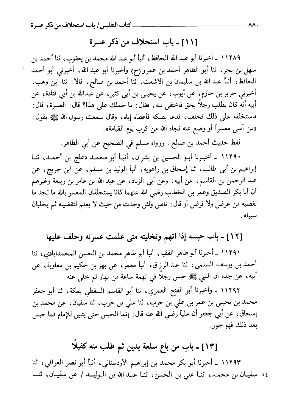 11290 - أَخْبَرَنَا أَبُو الْحُسَيْنِ بْنُ بِشْرَانَ، أنبأ أَبُو مُحَمَّدٍ دَعْلَجُ بْنُ أَحْمَدَ، ثنا إِبْرَاهِيمُ بْنُ أَبِي طَالِبٍ، ثنا إِسْحَاقُ بْنُ رَاهَوَيْهِ، أنبأ الْوَلِيدُ بْنُ مُسْلِمٍ، عَنِ ابْنِ جُرَيْجٍ، عَنْ عَبْدِ الرَّحْمَنِ بْنِ الْقَاسِمِ، عَنْ أَبِيهِ، وَعَنْ أَبِي الزِّنَادِ، عَنْ عَبْدِ اللهِ بْنِ عَامِرِ بْنِ رَبِيعَةَ، وَغَيْرِهِمْ، أَنَّ أَبَا بَكْرٍ الصِّدِّيقَ وَعُمَرَ بْنَ الْخَطَّابِ رَضِيَ اللهُ عَنْهُمَا " كَانَا §يَسْتَحْلِفَانِ الْمُعْسِرَ: بِاللهِ مَا تَجِدُ مَا تَقْضِيهِ مِنْ عَرْضٍ، وَلَا فَرْضٍ، أَوْ قَالَ: نَاضٍّ، وَلَئِنْ وَجَدْتَ مِنْ حَيْثُ لَا يُعْلَمُ لَتَقْضِيَنَّهُ، ثُمَّ يُخَلِّيَانِ سَبِيلَهُ "