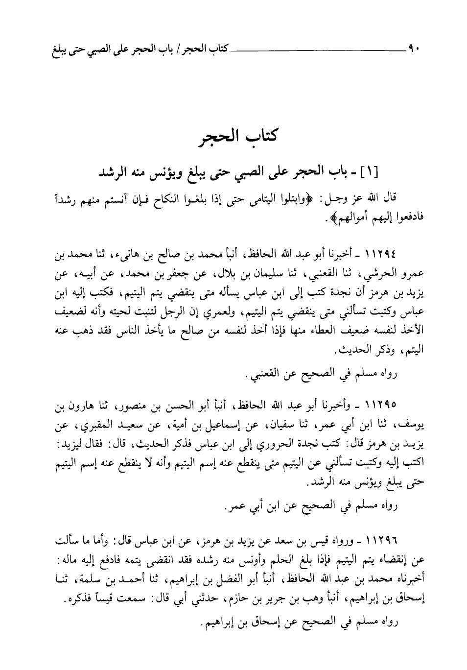 11294 - أَخْبَرَنَا أَبُو عَبْدِ اللهِ الْحَافِظُ، أنبأ مُحَمَّدُ بْنُ صَالِحِ بْنِ هَانِئٍ، ثنا مُحَمَّدُ بْنُ عَمْرٍو الْحَرَشِيُّ، ثنا الْقَعْنَبِيُّ، ثنا سُلَيْمَانُ بْنُ بِلَالٍ، عَنْ جَعْفَرِ بْنِ مُحَمَّدٍ، عَنْ أَبِيهِ، عَنْ يَزِيدَ بْنِ هُرْمُزَ، أَنَّ نَجْدَةَ كَتَبَ إِلَى ابْنِ عَبَّاسٍ يَسْأَلُهُ: مَتَى يَنْقَضِي يُتْمُ الْيَتِيمِ؟ فَكَتَبَ إِلَيْهِ ابْنُ عَبَّاسٍ: " وَكَتَبْتَ تَسْأَلُنِي: مَتَى يَنْقَضِي يُتْمُ الْيَتِيمِ؟ وَلَعَمْرِي إِنَّ الرَّجُلَ لَتَنْبُتُ لِحْيَتُهُ، وَإِنَّهُ لَضَعِيفُ الْأَخْذِ لِنَفْسِهِ، ضَعِيفُ الْعَطَاءِ مِنْهَا، فَإِذَا §أَخَذَ لِنَفْسِهِ مِنْ صَالِحِ مَا يَأْخُذُ النَّاسُ، فَقَدْ ذَهَبَ عَنْهُ الْيُتْمُ " وَذَكَرَ الْحَدِيثَ. رَوَاهُ مُسْلِمٌ فِي الصَّحِيحِ عَنِ الْقَعْنَبِيِّ.