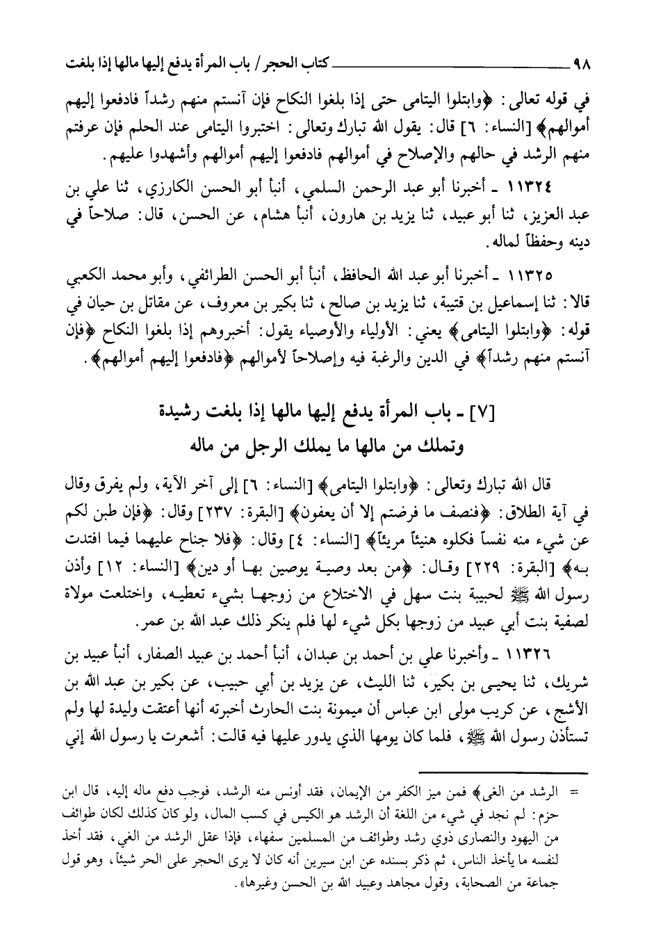 11325 - أَخْبَرَنَا أَبُو عَبْدِ اللهِ الْحَافِظُ، أنبأ أَبُو الْحَسَنِ الطَّرَائِفِيُّ، وَأَبُو مُحَمَّدٍ الْكَعْبِيُّ، قَالَا: ثنا إِسْمَاعِيلُ بْنُ قُتَيْبَةَ، ثنا يَزِيدُ بْنُ صَالِحٍ، ثنا بُكَيْرُ بْنُ مَعْرُوفٍ، عَنْ مُقَاتِلِ بْنِ حَيَّانَ، فِي قَوْلِهِ: " {§وَابْتَلُوا الْيَتَامَى} [النساء: 6]: يَعْنِي الْأَوْلِيَاءَ وَالْأَوْصِيَاءَ، يَقُولُ: اخْبُرُوهُمْ إِذَا بَلَغُوا النِّكَاحَ، {فَإِنْ آنَسْتُمْ مِنْهُمْ رُشْدًا} [النساء: 6] فِي الدِّينِ وَالرَّغْبَةِ فِيهِ وَإِصْلَاحًا لِأَمْوَالِهِمْ، {فَادْفَعُوا إِلَيْهِمْ أَمْوَالَهُمْ} [النساء: 6] "