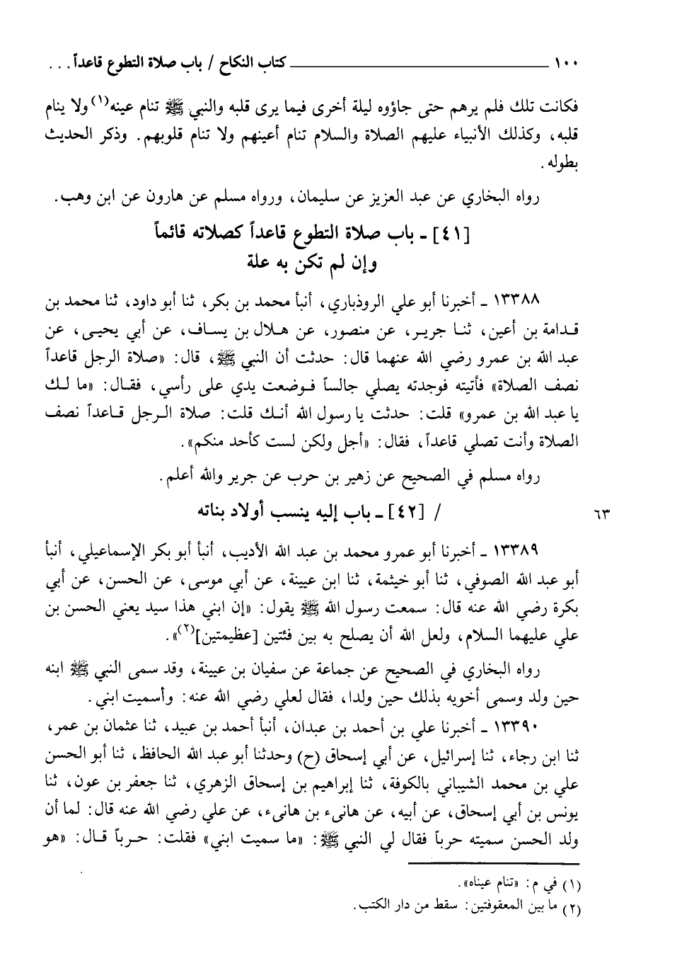 13388 - أَخْبَرَنَا أَبُو عَلِيٍّ الرُّوذْبَارِيُّ، أنبأ مُحَمَّدُ بْنُ بَكْرٍ، ثنا أَبُو دَاوُدَ، ثنا مُحَمَّدُ بْنُ قُدَامَةَ بْنِ أَعْيَنَ، ثنا جَرِيرٌ، عَنْ مَنْصُورٍ، عَنْ هِلَالِ بْنِ يَسَافٍ، عَنْ أَبِي يَحْيَى، عَنْ عَبْدِ اللهِ بْنِ عَمْرٍو رَضِيَ اللهُ عَنْهُمَا قَالَ: حُدِّثْتُ أَنَّ النَّبِيَّ صَلَّى اللهُ عَلَيْهِ وَسَلَّمَ قَالَ: صَلَاةُ الرَّجُلِ قَاعِدًا نِصْفُ الصَّلَاةِ فَأَتَيْتُهُ، فَوَجَدْتُهُ يُصَلِّي جَالِسًا، فَوَضَعْتُ يَدِيَّ عَلَى رَأْسِي فَقَالَ: " مَا لَكَ يَا عَبْدَ اللهِ بْنَ عَمْرٍو؟ " قُلْتُ: حُدِّثْتُ يَا رَسُولَ اللهِ أَنَّكَ قُلْتَ: " §صَلَاةُ الرَّجُلِ قَاعِدًا نِصْفُ الصَّلَاةِ، وَأَنْتَ تُصَلِّي قَاعِدًا، فَقَالَ: " أَجَلْ وَلَكِنْ لَسْتُ كَأَحَدٍ مِنْكُمْ "، رَوَاهُ مُسْلِمٌ فِي الصَّحِيحِ عَنْ زُهَيْرِ بْنِ حَرْبٍ، عَنْ جَرِيرٍ وَاللهُ أَعْلَمُ