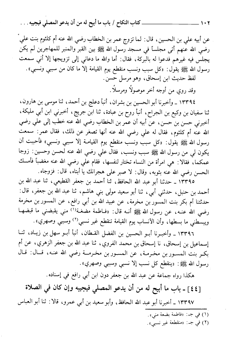 13395 - حَدَّثَنَا أَبُو عَبْدِ اللهِ الْحَافِظُ، ثنا أَحْمَدُ بْنُ جَعْفَرٍ الْقَطِيعِيُّ، ثنا عَبْدُ اللهِ بْنُ أَحْمَدَ بْنِ حَنْبَلٍ، حَدَّثَنِي أَبِي، ثنا أَبُو سَعِيدٍ، مَوْلَى بَنِي هَاشِمٍ، ثنا عَبْدُ اللهِ بْنُ جَعْفَرٍ قَالَ: حَدَّثَتْنَا أُمُّ بَكْرٍ بِنْتُ الْمِسْوَرِ بْنِ مَخْرَمَةَ، عَنْ عُبَيْدِ اللهِ بْنِ أَبِي رَافِعٍ، عَنِ الْمِسْوَرِ بْنِ مَخْرَمَةَ رَضِيَ اللهُ عَنْهُ عَنْ رَسُولِ اللهِ صَلَّى اللهُ عَلَيْهِ وَسَلَّمَ أَنَّهُ قَالَ: " فَاطِمَةُ مُضْغَةٌ مِنِّي يَقْبِضُنِي، مَا قَبَضَهَا وَيَبْسُطُنِي مَا بَسَطَهَا، وَإِنَّ §الْأَنْسَابَ يَوْمَ الْقِيَامَةِ تَنْقَطِعُ غَيْرَ نَسَبِي وَسَبَبِي وَصِهْرِي "
