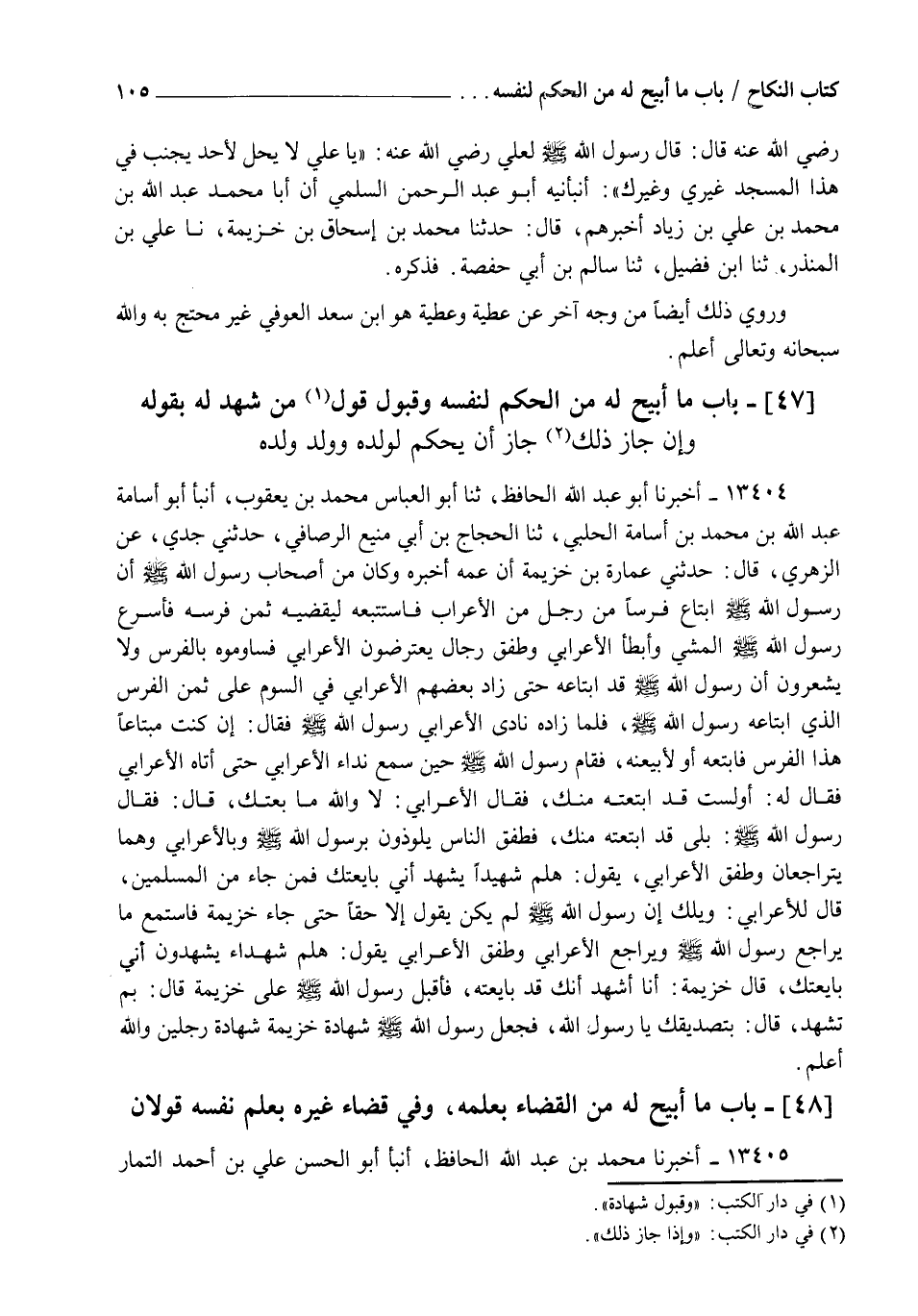 13404 - أَخْبَرَنَا أَبُو عَبْدِ اللهِ الْحَافِظُ، ثنا أَبُو الْعَبَّاسِ مُحَمَّدُ بْنُ يَعْقُوبَ، أنبأ أَبُو أُسَامَةَ عَبْدُ اللهِ بْنُ مُحَمَّدِ بْنِ أُسَامَةَ الْحَلَبِيُّ، ثنا الْحَجَّاجُ بْنُ أَبِي مَنِيعٍ الرُّصَافِيُّ، حَدَّثَنِي جَدِّي، عَنِ الزُّهْرِيِّ قَالَ: حَدَّثَنِي عُمَارَةُ بْنُ خُزَيْمَةَ، أَنَّ عَمَّهُ، أَخْبَرَهُ وَكَانَ مِنْ أَصْحَابِ رَسُولِ اللهِ صَلَّى اللهُ عَلَيْهِ وَسَلَّمَ أَنَّ رَسُولَ اللهِ صَلَّى اللهُ عَلَيْهِ وَسَلَّمَ ابْتَاعَ فَرَسًا مِنْ رَجُلٍ مِنَ الْأَعْرَابِ فَاسْتَتْبَعَهُ لِيَقْضِيَهُ ثَمَنَ فَرَسِهِ، فَأَسْرَعَ رَسُولُ اللهِ صَلَّى اللهُ عَلَيْهِ وَسَلَّمَ الْمَشْيَ وَأَبْطَأَ الْأَعْرَابِيُّ، وَطَفِقَ رِجَالٌ يَعْتَرِضُونَ الْأَعْرَابِيَّ، فَسَاوَمُوهُ بِالْفَرَسِ، وَلَا يَشْعُرُونَ أَنَّ رَسُولَ اللهِ صَلَّى اللهُ عَلَيْهِ وَسَلَّمَ قَدِ ابْتَاعَهُ حَتَّى زَادَ بَعْضُهُمُ الْأَعْرَابِيَّ فِي السَّوْمِ عَلَى ثَمَنِ الْفَرَسِ الَّذِي ابْتَاعَهُ رَسُولُ اللهِ صَلَّى اللهُ عَلَيْهِ وَسَلَّمَ، فَلَمَّا زَادَهُ نَادَى الْأَعْرَابِيُّ رَسُولَ اللهِ صَلَّى اللهُ عَلَيْهِ وَسَلَّمَ، فَقَالَ: إِنْ كُنْتَ مُبْتَاعًا هَذَا الْفَرَسَ فَابْتَعْهُ أَوْ لَأَبِيعَنَّهُ، فَقَامَ رَسُولُ اللهِ صَلَّى اللهُ عَلَيْهِ وَسَلَّمَ حِينَ سَمِعَ نِدَاءَ الْأَعْرَابِيِّ حَتَّى أَتَاهُ الْأَعْرَابِيُّ، فَقَالَ لَهُ: " أَوَلَسْتُ قَدِ ابْتَعْتُهُ مِنْكَ؟ " فَقَالَ الْأَعْرَابِيُّ: لَا وَاللهِ مَا بِعْتُكَ قَالَ: فَقَالَ رَسُولُ اللهِ صلَّى الله عَلَيْهِ وَسَلَّمَ: " بَلَى قَدِ ابْتَعْتُهُ مِنْكَ "، فَطَفِقَ النَّاسُ يَلُوذُونَ بِرَسُولِ اللهِ صَلَّى اللهُ عَلَيْهِ وَسَلَّمَ وَبِالْأَعْرَابِيِّ وَهُمَا يَتَرَاجَعَانِ، وَطَفِقَ الْأَعْرَابِيُّ يَقُولُ: هَلُمَّ شَهِيدًا يَشْهَدُ أَنِّي بَايَعْتُكَ، فَمَنْ جَاءَ مِنَ الْمُسْلِمِينَ قَالَ لِلْأَعْرَابِيِّ: وَيْلَكَ إِنَّ رَسُولَ اللهِ صَلَّى اللهُ عَلَيْهِ وَسَلَّمَ لَمْ يَكُنْ يَقُولُ إِلَّا حَقًّا، حَتَّى جَاءَ خُزَيْمَةُ فَاسْتَمَعَ مَا يُرَاجِعُ رَسُولُ اللهِ صَلَّى اللهُ عَلَيْهِ وَسَلَّمَ وَيُرَاجِعُ الْأَعْرَابِيُّ وَطَفِقَ الْأَعْرَابِيُّ يَقُولُ: " §هَلُمَّ شُهَدَاءُ يَشْهَدُونَ أَنِّي بَايَعْتُكَ قَالَ خُزَيْمَةُ: أَنَا أَشْهَدُ أَنَّكَ قَدْ بَايَعْتَهُ فَأَقْبَلَ رَسُولُ اللهِ صَلَّى اللهُ عَلَيْهِ وَسَلَّمَ عَلَى خُزَيْمَةَ قَالَ: " بِمَا تَشْهَدُ؟ " قَالَ: بِتَصْدِيقِكَ يَا رَسُولَ اللهِ، فَجَعَلَ رَسُولُ اللهِ صَلَّى اللهُ عَلَيْهِ وَسَلَّمَ شَهَادَةَ خُزَيْمَةَ شَهَادَةَ رَجُلَيْنِ وَاللهُ أَعْلَمُ
