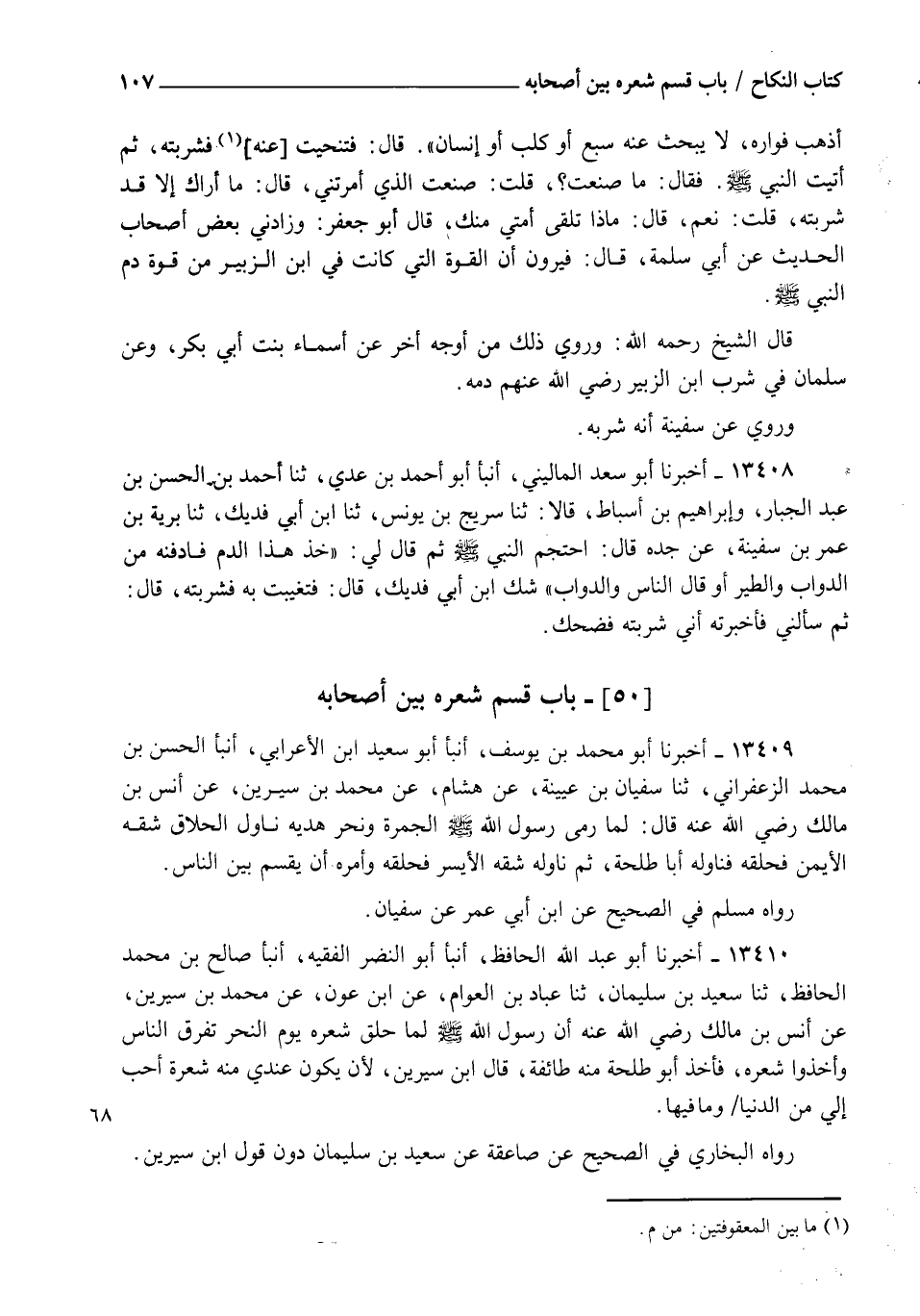 13409 - أَخْبَرَنَا أَبُو مُحَمَّدِ بْنُ يُوسُفَ، أنبأ أَبُو سَعِيدِ بْنُ الْأَعْرَابِيِّ، أنبأ الْحَسَنُ بْنُ مُحَمَّدٍ الزَّعْفَرَانِيُّ، ثنا سُفْيَانُ بْنُ عُيَيْنَةَ، عَنْ هِشَامٍ، عَنْ مُحَمَّدِ بْنِ سِيرِينَ، عَنْ أَنَسِ بْنِ مَالِكٍ رَضِيَ اللهُ عَنْهُ قَالَ: " لَمَّا §رَمَى رَسُولُ اللهِ صَلَّى اللهُ عَلَيْهِ وَسَلَّمَ الْجَمْرَةَ، وَنَحَرَ هَدْيَهُ نَاوَلَ الْحَلَّاقَ شِقَّهُ الْأَيْمَنَ، فَحَلَقَهُ، فَنَاوَلَهُ أَبَا طَلْحَةَ، ثُمَّ نَاوَلَهُ شِقَّهُ الْأَيْسَرَ، فَحَلَقَهُ وَأَمَرَهُ أَنْ يُقْسَمَ بَيْنَ النَّاسِ "، رَوَاهُ مُسْلِمٌ فِي الصَّحِيحِ عَنِ ابْنِ أَبِي عُمَرَ، عَنْ سُفْيَانَ