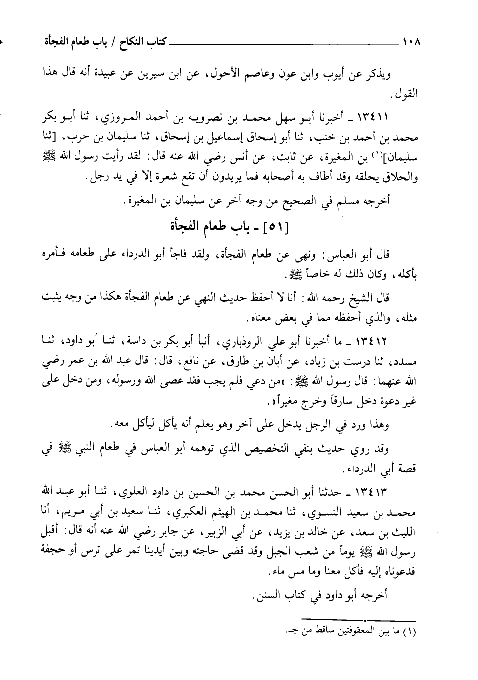 13412 - مَا أَخْبَرَنَا أَبُو عَلِيٍّ الرُّوذْبَارِيُّ، أنبأ أَبُو بَكْرِ بْنُ دَاسَةَ، ثنا أَبُو دَاوُدَ، ثنا مُسَدَّدٌ، ثنا دُرُسْتُ بْنُ زِيَادٍ، عَنْ أَبَانَ بْنِ طَارِقٍ، عَنْ نَافِعٍ قَالَ: قَالَ عَبْدُ اللهِ بْنُ عُمَرَ رَضِيَ اللهُ عَنْهُمَا قَالَ رَسُولُ اللهِ صَلَّى اللهُ عَلَيْهِ وَسَلَّمَ: " §مَنْ دُعِيَ فَلَمْ يُجِبْ، فَقَدْ عَصَى اللهَ وَرَسُولَهُ، وَمَنْ دَخَلَ عَلَى غَيْرِ دَعْوَةٍ دَخَلَ سَارِقًا وَخَرَجَ مُغِيرًا " وَهَذَا وَرَدَ فِي الرَّجُلِ يَدْخُلُ عَلَى آخَرَ وَهُوَ يَعْلَمُ أَنَّهُ يَأْكُلُ لِيَأْكُلَ مَعَهُ، وَقَدْ رُوِيَ حَدِيثٌ بِنَفْيِ التَّخْصِيصِ الَّذِي تَوَهَّمَهُ أَبُو الْعَبَّاسِ فِي طَعَامِ النَّبِيِّ صَلَّى اللهُ عَلَيْهِ وَسَلَّمَ فِي قِصَّةِ أَبِي الدَّرْدَاءِ