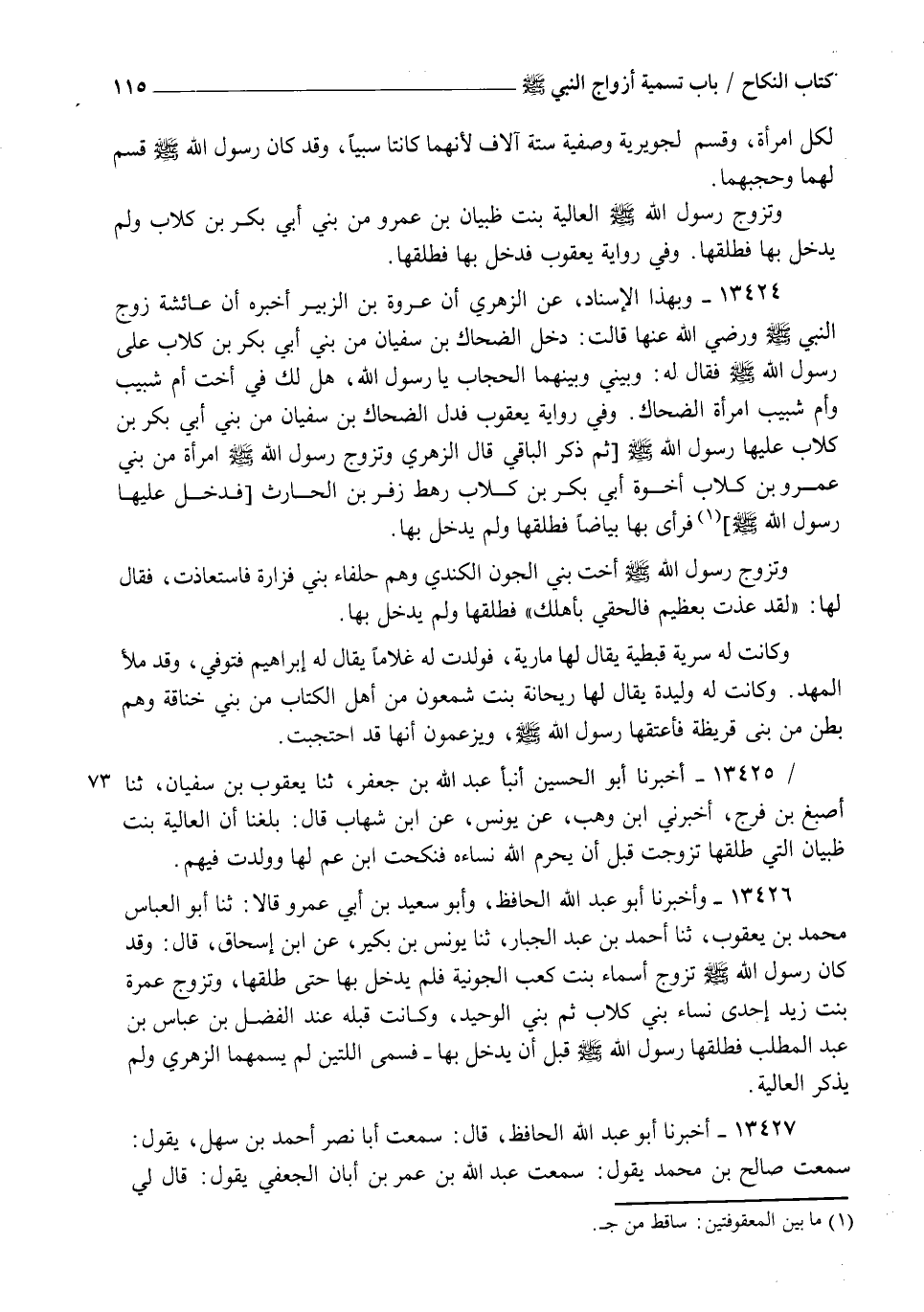 13426 - وَأَخْبَرَنَا أَبُو عَبْدِ اللهِ الْحَافِظُ، وَأَبُو سَعِيدِ بْنُ أَبِي عَمْرٍو قَالَا: ثنا أَبُو الْعَبَّاسِ مُحَمَّدُ بْنُ يَعْقُوبَ، ثنا أَحْمَدُ بْنُ عَبْدِ الْجَبَّارِ، ثنا يُونُسُ بْنُ بُكَيْرٍ، عَنِ ابْنِ إِسْحَاقَ قَالَ: وَقَدْ كَانَ رَسُولُ اللهِ صَلَّى اللهُ عَلَيْهِ وَسَلَّمَ §تَزَوَّجَ أَسْمَاءَ بِنْتَ كَعْبٍ الْجُونِيَّةَ، فَلَمْ يَدْخُلْ بِهَا حَتَّى طَلَّقَهَا وَتَزَوَّجَ عَمْرَةَ بِنْتَ زَيْدٍ إِحْدَى نِسَاءِ بَنِي كِلَابٍ، ثُمَّ بَنِي الْوَحِيدِ، وَكَانَتْ قَبْلَهُ عِنْدَ الْفَضْلِ بْنِ عَبَّاسِ بْنِ عَبْدِ الْمُطَّلِبِ، فَطَلَّقَهَا رَسُولُ اللهِ صَلَّى اللهُ عَلَيْهِ وَسَلَّمَ قَبْلَ أَنْ يَدْخُلَ بِهَا فَسَمَّى اللَّتَيْنِ لَمْ يُسَمِّهِمَا الزُّهْرِيُّ، وَلَمْ يَذْكُرِ الْعَالِيَةَ