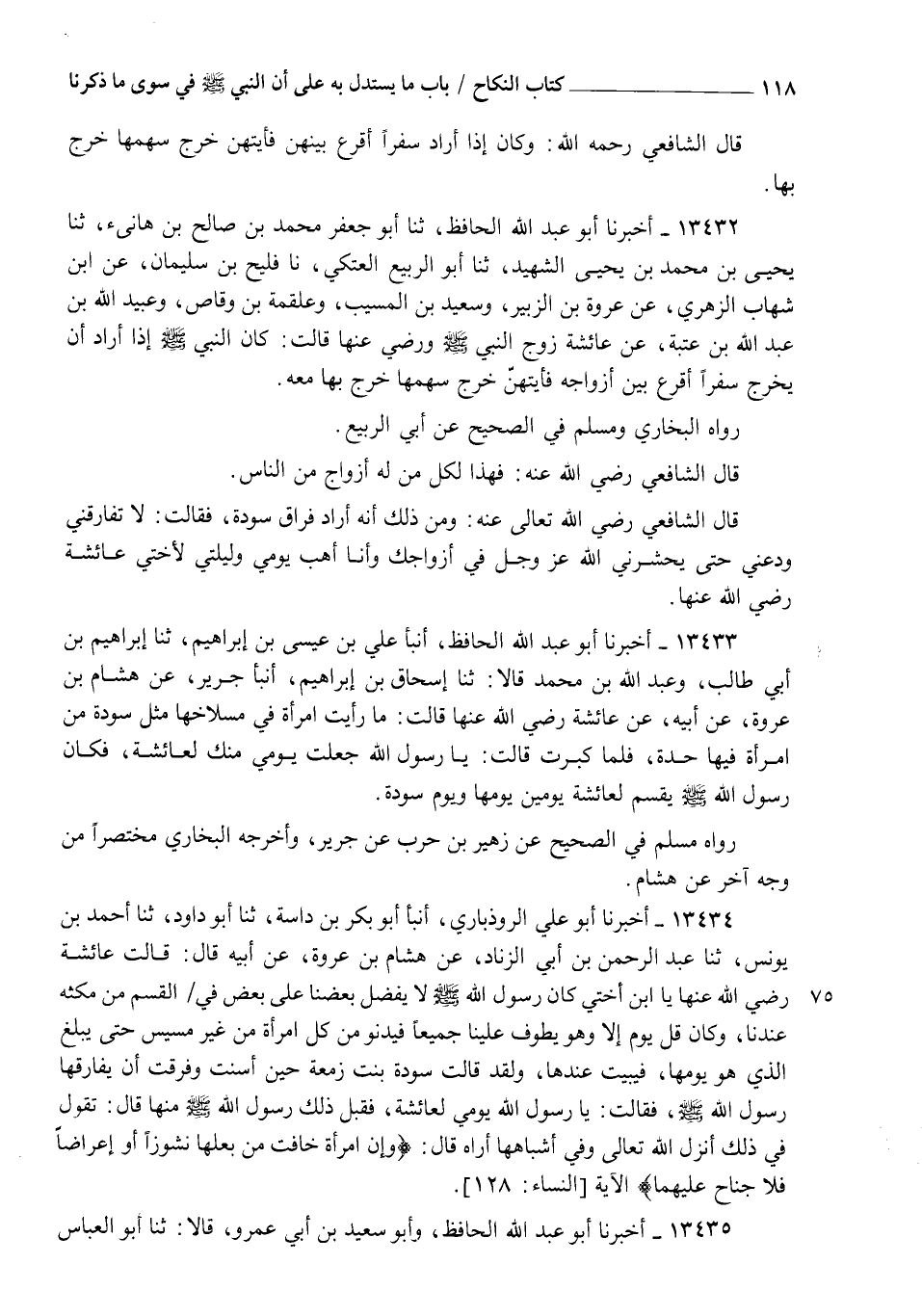 13432 - أَخْبَرَنَا أَبُو عَبْدِ اللهِ الْحَافِظُ، ثنا أَبُو جَعْفَرٍ مُحَمَّدُ بْنُ صَالِحِ بْنِ هَانِئٍ، ثنا يَحْيَى بْنُ مُحَمَّدِ بْنِ يَحْيَى الشَّهِيدُ، ثنا أَبُو الرَّبِيعِ الْعَتَكِيُّ، نا فُلَيْحُ بْنُ سُلَيْمَانَ، عَنِ ابْنِ شِهَابٍ الزُّهْرِيِّ، عَنْ عُرْوَةَ بْنِ الزُّبَيْرِ، وَسَعِيدِ بْنِ الْمُسَيِّبِ، وَعَلْقَمَةَ بْنِ وَقَّاصٍ، وَعُبَيْدِ اللهِ بْنِ عَبْدِ اللهِ بْنِ عُتْبَةَ، عَنْ عَائِشَةَ، زَوْجِ النَّبِيِّ صَلَّى اللهُ عَلَيْهِ وَسَلَّمَ وَرَضِيَ عَنْهَا قَالَتْ: كَانَ النَّبِيُّ صَلَّى اللهُ عَلَيْهِ وَسَلَّمَ §إِذَا أَرَادَ أَنْ يَخْرُجَ سَفَرًا أَقْرَعَ بَيْنَ أَزْوَاجِهِ، فَأَيَّتُهُنَّ خَرَجَ سَهْمُهَا خَرَجَ بِهَا مَعَهُ " رَوَاهُ الْبُخَارِيُّ، وَمُسْلِمٌ فِي الصَّحِيحِ عَنْ أَبِي الرَّبِيعِ قَالَ الشَّافِعِيُّ رَضِيَ اللهُ عَنْهُ: فَهَذَا لِكُلِّ مَنْ لَهُ أَزْوَاجٌ مِنَ النَّاسِ قَالَ الشَّافِعِيُّ رَضِيَ اللهُ تَعَالَى عَنْهُ: وَمِنْ ذَلِكَ أَنَّهُ أَرَادَ فِرَاقَ سَوْدَةَ، فَقَالَتْ: لَا تُفَارِقْنِي وَدَعْنِي حَتَّى يَحْشُرَنِيَ اللهُ عَزَّ وَجَلَّ فِي أَزْوَاجِكَ، وَأَنَا أَهَبُ يَوْمِي وَلَيْلَتِي لِأُخْتِي عَائِشَةَ رَضِيَ اللهُ عَنْهَا