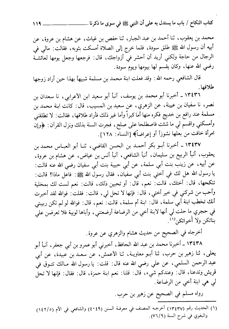 13437 - أَخْبَرَنَا أَبُو بَكْرٍ أَحْمَدُ بْنُ الْحَسَنِ الْقَاضِي، ثنا أَبُو الْعَبَّاسِ مُحَمَّدُ بْنُ يَعْقُوبَ، أنبأ الرَّبِيعُ بْنُ سُلَيْمَانَ، أنبأ الشَّافِعِيُّ، أنبأ أَنَسُ بْنُ عِيَاضٍ، عَنْ هِشَامِ بْنِ عُرْوَةَ، عَنْ أَبِيهِ، عَنْ زَيْنَبَ بِنْتِ أَبِي سَلَمَةَ، عَنْ أُمِّ حَبِيبَةَ بِنْتِ أَبِي سُفْيَانَ رَضِيَ اللهُ عَنْهَا قَالَتْ: يَا رَسُولَ اللهِ §" هَلْ لَكَ فِي أُخْتِي بِنْتِ أَبِي سُفْيَانَ؟ فَقَالَ رَسُولُ اللهِ صلَّى الله عَلَيْهِ وَسَلَّمَ: " فَاعِلٌ مَاذَا؟ " قَالَتْ: تَنْكِحُهَا قَالَ: " أُخْتُكِ؟ " قَالَتْ: نَعَمْ قَالَ: " أَوَتُحِبِّينَ ذَلِكَ؟ " قَالَتْ: نَعَمْ لَسْتُ لَكَ بِمُخْلِيَةٍ، وَأَحَبُّ مَنْ شَرِكَنِي فِي خَيْرٍ أُخْتِي، قَالَ: " فَإِنَّهَا لَا تَحِلُّ لِي " قَالَتْ: فَقُلْتُ: فَوَاللهِ لَقَدْ أُخْبِرْتُ أَنَّكَ تَخْطُبُ ابْنَةَ أَبِي سَلَمَةَ قَالَ: " ابْنَةُ أُمِّ سَلَمَةَ؟ " قَالَتْ: نَعَمْ قَالَ: " فَوَاللهِ لَوْ لَمْ تَكُنْ رَبِيبَتِي فِي حِجْرِي مَا حَلَّتْ لِي؛ إِنَّهَا لَابْنَةُ أَخِي مِنَ الرَّضَاعَةِ أَرْضَعَتْنِي وَأَبَاهَا ثُوَيْبَةُ، فَلَا تَعْرِضْنَ عَلَيَّ بَنَاتِكُنَّ وَلَا أَخَوَاتِكُنَّ "، أَخْرَجَاهُ فِي الصَّحِيحِ مِنْ حَدِيثِ هِشَامٍ، وَالزُّهْرِيِّ عَنْ عُرْوَةَ