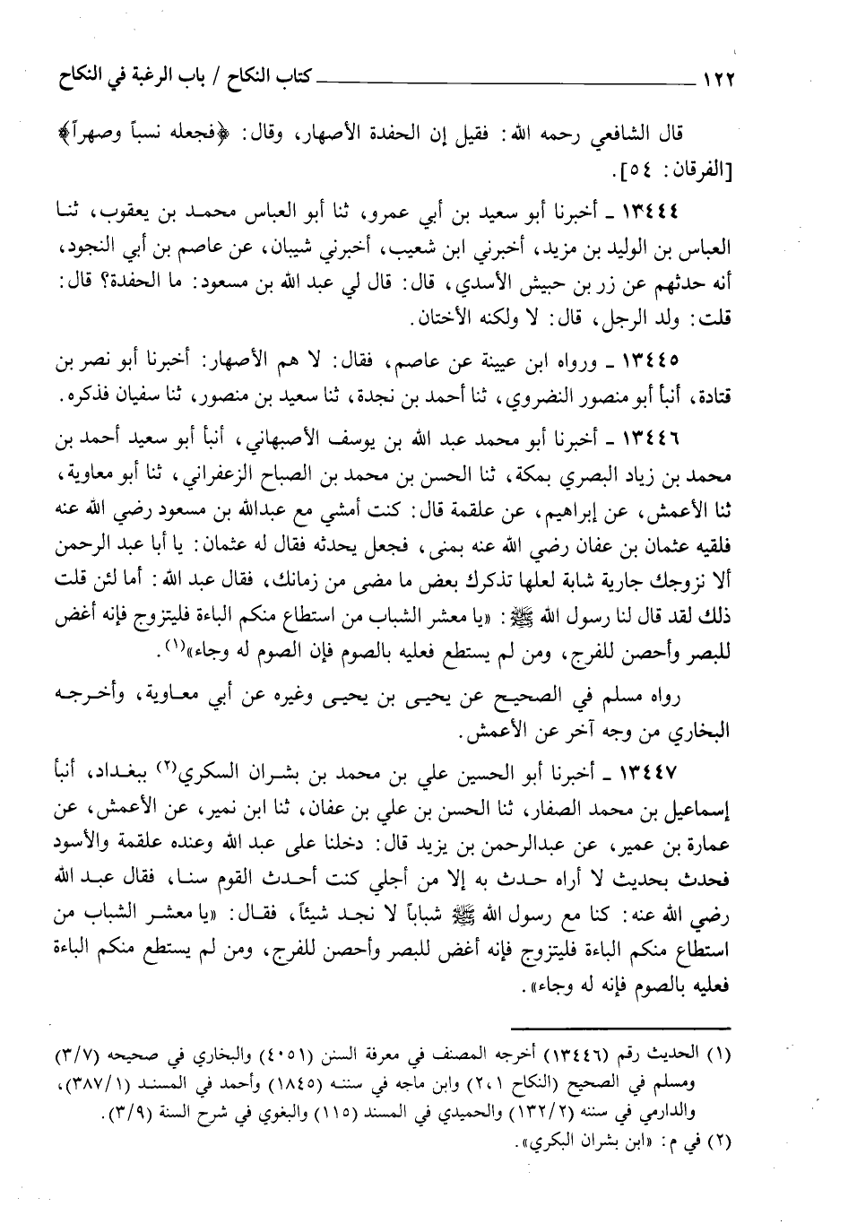 13446 - أَخْبَرَنَا أَبُو مُحَمَّدٍ عَبْدُ اللهِ بْنُ يُوسُفَ الْأَصْبَهَانِيُّ، أنبأ أَبُو سَعِيدٍ أَحْمَدُ بْنُ مُحَمَّدِ بْنِ زِيَادٍ الْبَصْرِيُّ بِمَكَّةَ، ثنا الْحَسَنُ بْنُ مُحَمَّدِ بْنِ الصَّبَّاحِ الزَّعْفَرَانِيُّ، ثنا أَبُو مُعَاوِيَةَ، ثنا الْأَعْمَشُ، عَنْ إِبْرَاهِيمَ، عَنْ عَلْقَمَةَ قَالَ: كُنْتُ أَمْشِي مَعَ عَبْدِ اللهِ بْنِ مَسْعُودٍ رَضِيَ اللهُ عَنْهُ، فَلَقِيَهُ عُثْمَانُ بْنُ عَفَّانَ رَضِيَ اللهُ عَنْهُ بِمِنًى، فَجَعَلَ يُحَدِّثُهُ، فَقَالَ لَهُ عُثْمَانُ: يَا أَبَا عَبْدِ الرَّحْمَنِ، أَلَا نُزَوِّجُكَ جَارِيَةً شَابَّةً لَعَلَّهَا تُذَكِّرُكَ بَعْضَ مَا مَضَى مِنْ زَمَانِكَ؟ فَقَالَ عَبْدُ اللهِ: أَمَا لَئِنْ قُلْتَ ذَلِكَ لَقَدْ قَالَ لَنَا رَسُولُ اللهِ صَلَّى اللهُ عَلَيْهِ وَسَلَّمَ: " يَا مَعْشَرَ الشَّبَابِ §مَنِ اسْتَطَاعَ مِنْكُمُ الْبَاءَةَ فَلْيَتَزَوَّجْ، فَإِنَّهُ أَغَضُّ لِلْبَصَرِ، وَأَحْصَنُ لِلْفَرْجِ، وَمَنْ لَمْ يَسْتَطِعْ فَعَلَيْهِ بِالصَّوْمِ، فَإِنَّ الصَّوْمَ لَهُ وِجَاءٌ "، رَوَاهُ مُسْلِمٌ فِي الصَّحِيحِ، عَنْ يَحْيَى بْنِ يَحْيَى وَغَيْرُهُ، عَنْ أَبِي مُعَاوِيَةَ، وَأَخْرَجَهُ الْبُخَارِيُّ مِنْ وَجْهٍ آخَرَ عَنِ الْأَعْمَشِ