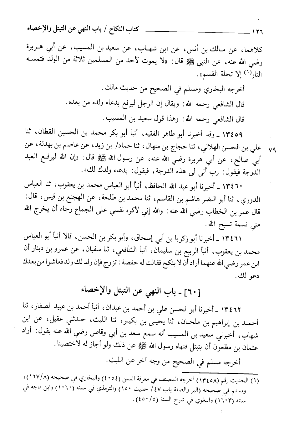 13462 - أَخْبَرَنَا أَبُو الْحَسَنِ عَلِيُّ بْنُ أَحْمَدَ بْنِ عَبْدَانَ، أنبأ أَحْمَدُ بْنُ عُبَيْدٍ الصَّفَّارُ، ثنا أَحْمَدُ بْنُ إِبْرَاهِيمَ بْنِ مِلْحَانَ، ثنا يَحْيَى بْنُ بُكَيْرٍ، ثنا اللَّيْثُ، حَدَّثَنِي عُقَيْلٌ، عَنِ ابْنِ شِهَابٍ، أَخْبَرَنِي سَعِيدُ بْنُ الْمُسَيِّبِ، أَنَّهُ سَمِعَ سَعْدَ بْنَ أَبِي وَقَّاصٍ رَضِيَ اللهُ عَنْهُ يَقُولُ: §أَرَادَ عُثْمَانُ بْنُ مَظْعُونٍ أَنْ يَتَبَتَّلَ، " فَنَهَاهُ رَسُولُ اللهِ صَلَّى اللهُ عَلَيْهِ وَسَلَّمَ عَنْ ذَلِكَ وَلَوْ أَجَازَ لَهُ لَاخْتَصَيْنَا "، أَخْرَجَهُ مُسْلِمٌ فِي الصَّحِيحِ مِنْ وَجْهٍ آخَرَ، عَنِ اللَّيْثِ