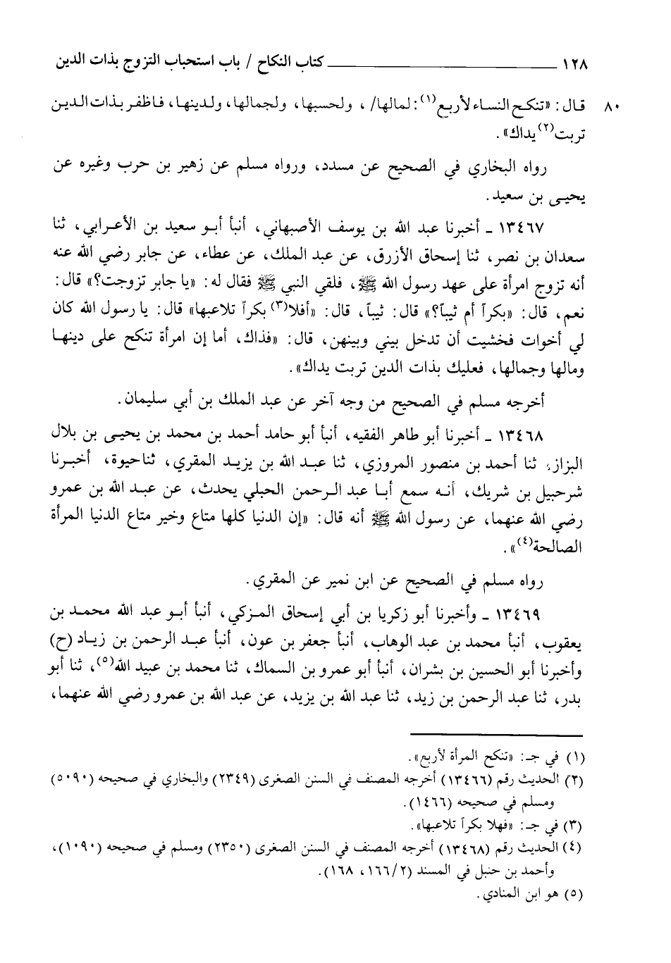 13467 - أَخْبَرَنَا عَبْدُ اللهِ بْنُ يُوسُفَ الْأَصْبَهَانِيُّ، أنبأ أَبُو سَعِيدِ بْنُ الْأَعْرَابِيِّ، ثنا سَعْدَانُ بْنُ نَصْرٍ، ثنا إِسْحَاقُ الْأَزْرَقُ، عَنْ عَبْدِ الْمَلِكِ، عَنْ عَطَاءٍ، عَنْ جَابِرٍ رَضِيَ اللهُ عَنْهُ أَنَّهُ تَزَوَّجَ امْرَأَةً عَلَى عَهْدِ رَسُولِ اللهِ صَلَّى اللهُ عَلَيْهِ وَسَلَّمَ، فَلَقِيَ النَّبِيَّ صَلَّى اللهُ عَلَيْهِ وَسَلَّمَ فَقَالَ لَهُ: " يَا جَابِرُ تَزَوَّجْتَ؟ " قَالَ: نَعَمْ قَالَ: " بِكْرًا أَمْ ثَيِّبًا؟ " قَالَ: ثَيِّبًا قَالَ: " أَفَلَا بِكْرًا تُلَاعِبُهَا؟ " قَالَ: يَا رَسُولَ اللهِ كَانَ لِي أَخَوَاتٌ فَخَشِيتُ أَنْ تَدْخُلَ بَيْنِي وَبَيْنَهُنَّ قَالَ: " فَذَاكَ أَمَا إِنَّ §امْرَأَةً " تُنْكَحُ عَلَى دِينِهَا وَمَالِهَا وَجَمَالِهَا فَعَلَيْكَ بِذَاتِ الدِّينِ تَرِبَتْ يَدَاكَ "، أَخْرَجَهُ مُسْلِمٌ فِي الصَّحِيحِ مِنْ وَجْهٍ آخَرَ عَنْ عَبْدِ الْمَلِكِ بْنِ أَبِي سُلَيْمَانَ