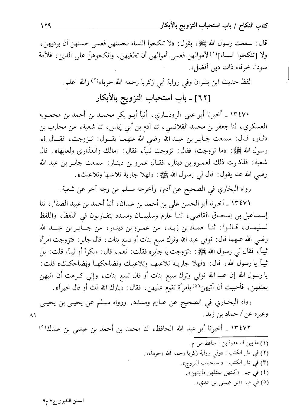 13471 - أَخْبَرَنَا أَبُو الْحَسَنِ عَلِيُّ بْنُ أَحْمَدَ بْنِ عَبْدَانَ، أنبأ أَحْمَدُ بْنُ عُبَيْدٍ الصَّفَّارُ، ثنا إِسْمَاعِيلُ بْنُ إِسْحَاقَ الْقَاضِي، ثنا عَارِمٌ، وَسُلَيْمَانُ، وَمُسَدَّدٌ، يَتَقَارَبُونَ فِي اللَّفْظِ، وَاللَّفْظُ لِسُلَيْمَانَ، قَالُوا: ثنا حَمَّادُ بْنُ زَيْدٍ، عَنْ عَمْرِو بْنِ دِينَارٍ، عَنْ جَابِرِ بْنِ عَبْدِ اللهِ رَضِيَ اللهُ عَنْهُمَا قَالَ: " تُوُفِّيَ عَبْدُ اللهِ وَتَرَكَ سَبْعَ بَنَاتٍ أَوْ تِسْعَ بَنَاتٍ قَالَ جَابِرٌ: فَتَزَوَّجْتُ امْرَأَةً ثَيِّبًا، فَقَالَ لِي رَسُولُ اللهِ صَلَّى اللهُ عَلَيْهِ وَسَلَّمَ: " تَزَوَّجْتَ يَا جَابِرُ؟ " فَقُلْتُ: نَعَمْ قَالَ: " بِكْرًا أَوْ ثَيِّبًا؟ " قُلْتُ: بَلْ ثَيِّبًا يَا رَسُولَ اللهِ قَالَ: " §فَهَلَّا جَارِيَةٌ تُلَاعِبُهَا وَتُلَاعِبُكَ وَتُضَاحِكُهَا وَتُضَاحِكُكَ؟ " قُلْتُ: يَا رَسُولَ اللهِ إِنَّ عَبْدَ اللهِ تُوُفِّيَ وَتَرَكَ سَبْعَ بَنَاتٍ، أَوْ قَالَ: تِسْعَ بَنَاتٍ وَإِنِّي كَرِهْتُ أَنْ آتِيَهُنَّ بِمِثْلِهِنَّ، فَأَحْبَبْتُ أَنْ آتِيَهُنَّ بِامْرَأَةٍ تَقُومُ عَلَيْهِنَّ، فَقَالَ: " بَارَكَ اللهُ لَكَ "، أَوْ قَالَ: " خَيْرًا "، رَوَاهُ الْبُخَارِيُّ فِي الصَّحِيحِ، عَنْ عَارِمٍ وَمُسَدَّدٍ، وَرَوَاهُ مُسْلِمٌ عَنْ يَحْيَى بْنِ يَحْيَى وَغَيْرُهُ عَنْ حَمَّادِ بْنِ زَيْدٍ