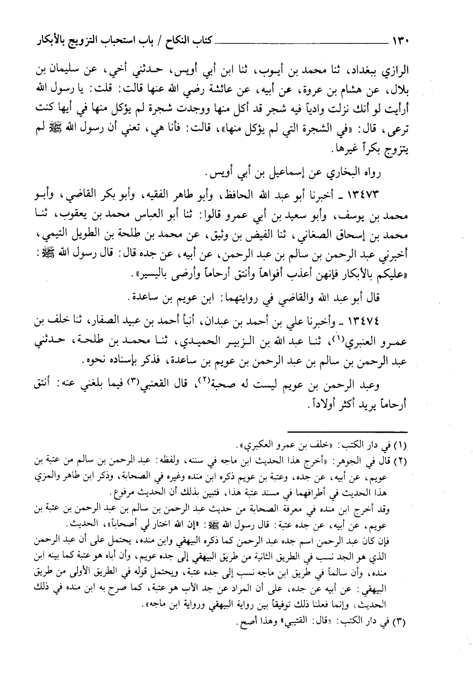 13474 - وَأَخْبَرَنَا عَلِيُّ بْنُ أَحْمَدَ بْنِ عَبْدَانَ، أنبأ أَحْمَدُ بْنُ عُبَيْدٍ الصَّفَّارُ، ثنا خَلَفُ بْنُ عَمْرٍو الْعَنْبَرِيُّ، ثنا عَبْدُ اللهِ بْنُ الزُّبَيْرِ الْحُمَيْدِيُّ، ثنا مُحَمَّدُ بْنُ طَلْحَةَ، حَدَّثَنِي عَبْدُ الرَّحْمَنِ بْنُ سَالِمِ بْنِ عَبْدِ الرَّحْمَنِ بْنِ عُوَيْمِ بْنِ سَاعِدَةَ، فَذَكَرَ بِإِسْنَادِهِ نَحْوَهُ وَعَبْدُ الرَّحْمَنِ بْنُ عُوَيْمٍ لَيْسَتْ لَهُ صُحْبَةٌ، قَالَ الْقَعْنَبِيُّ: فِيمَا بَلَغَنِي عَنْهُ: أَنْتَقُ أَرْحَامًا يُرِيدُ أَكْثَرَ أَوْلَادًا