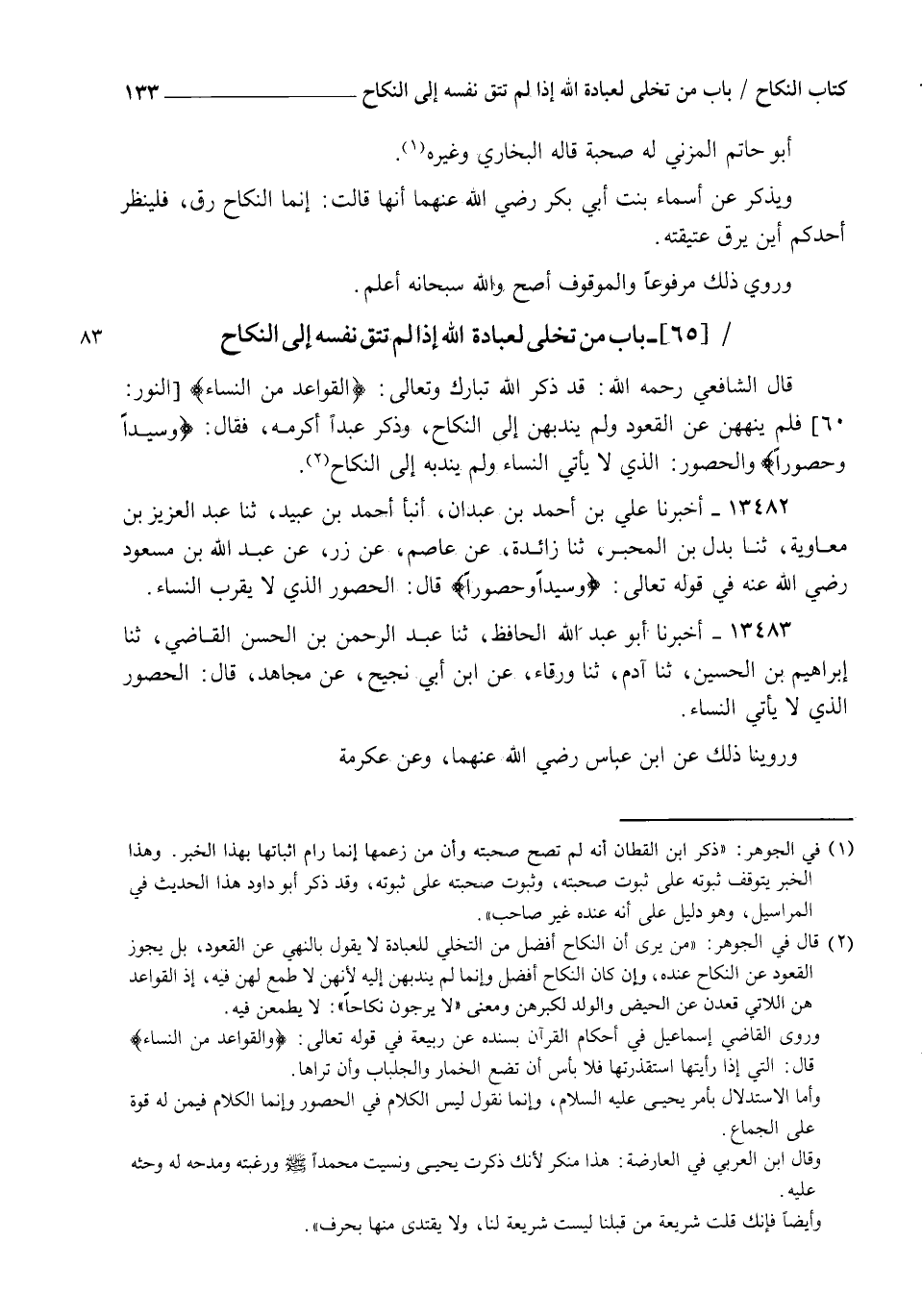 قَالَ الشَّافِعِيُّ رَحِمَهُ اللهُ: قَدْ ذَكَرَ اللهُ تَبَارَكَ وَتَعَالَى الْقَوَاعِدَ مِنَ النِّسَاءِ، فَلَمْ يَنْهَهُنَّ عَنِ الْقُعُودِ، وَلَمْ يَنْدُبْهُنَّ إِلَى النِّكَاحِ وَذَكَرَ عَبْدًا أَكْرَمَهُ فَقَالَ: {وَسَيِّدًا وَحَصُورًا} [آل عمران: 39]، وَالْحَصُورُ الَّذِي لَا يَأْتِي النِّسَاءَ وَلَمْ يَنْدُبْهُ إِلَى النِّكَاحِ